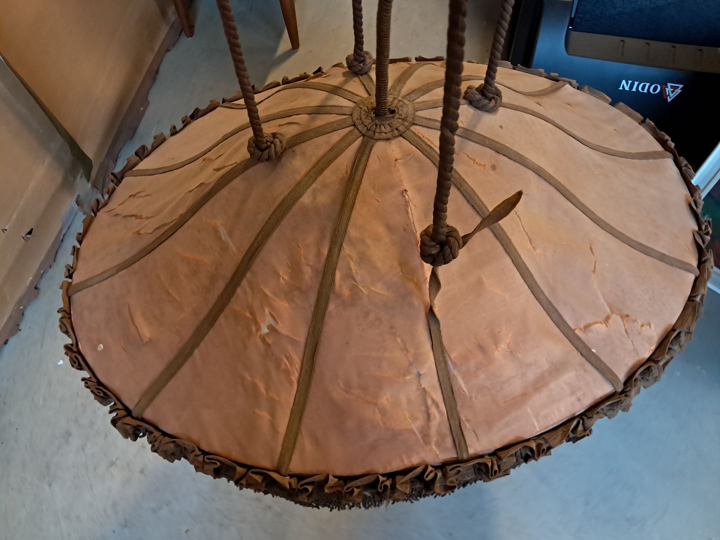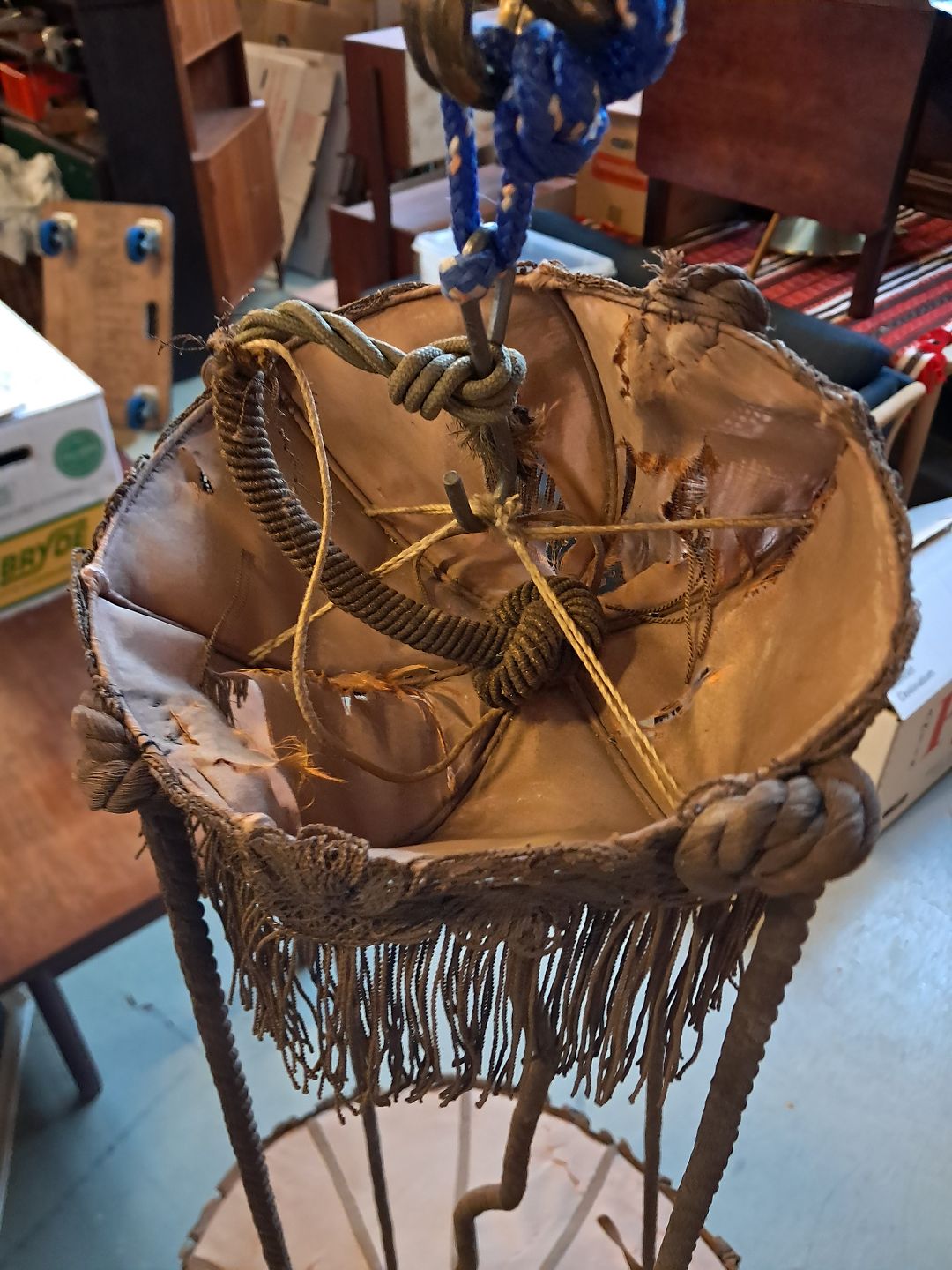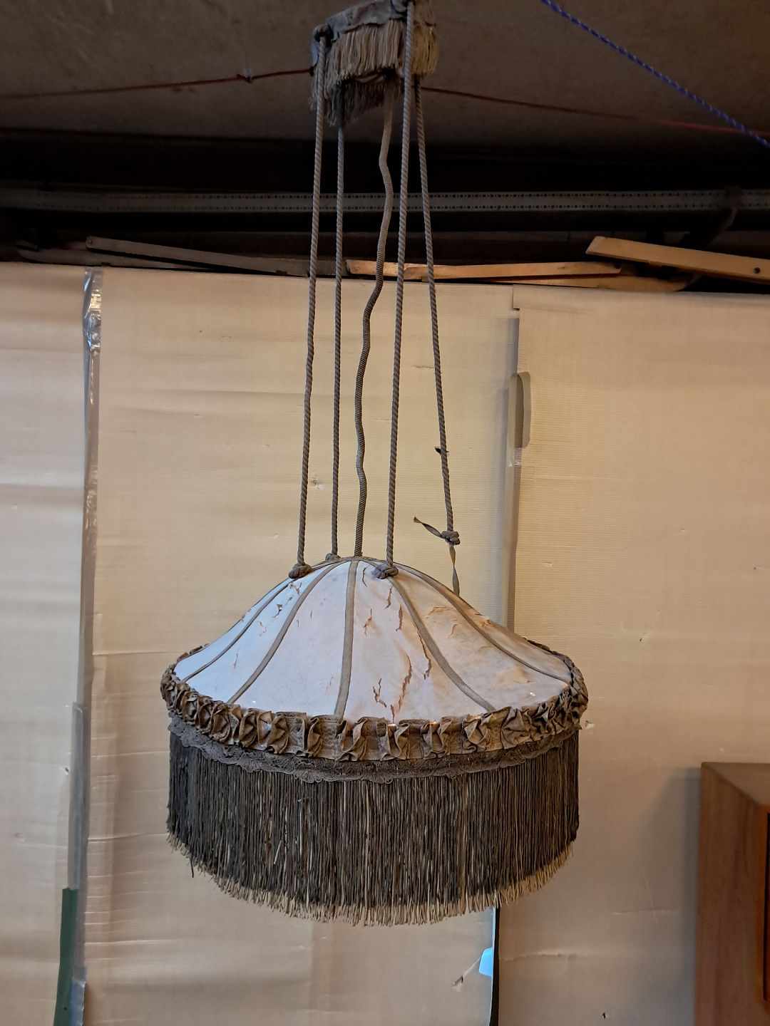 Loftlampe med snoreophæng, fra 1920erne. Den har defekter. Højde med snor 130cm Højde 35cm Bredde 60cm Længde 80cm Emne nummer: 76412