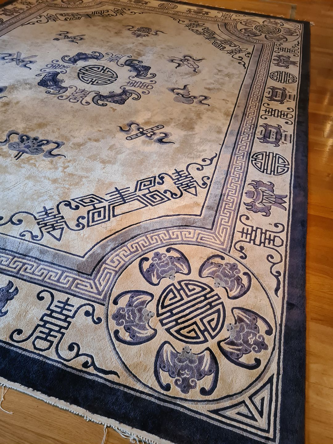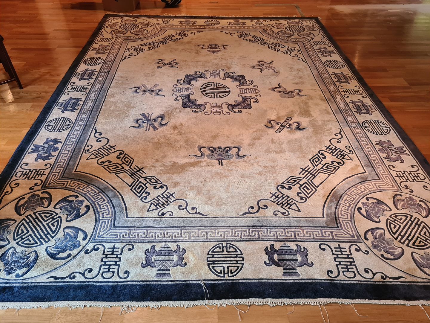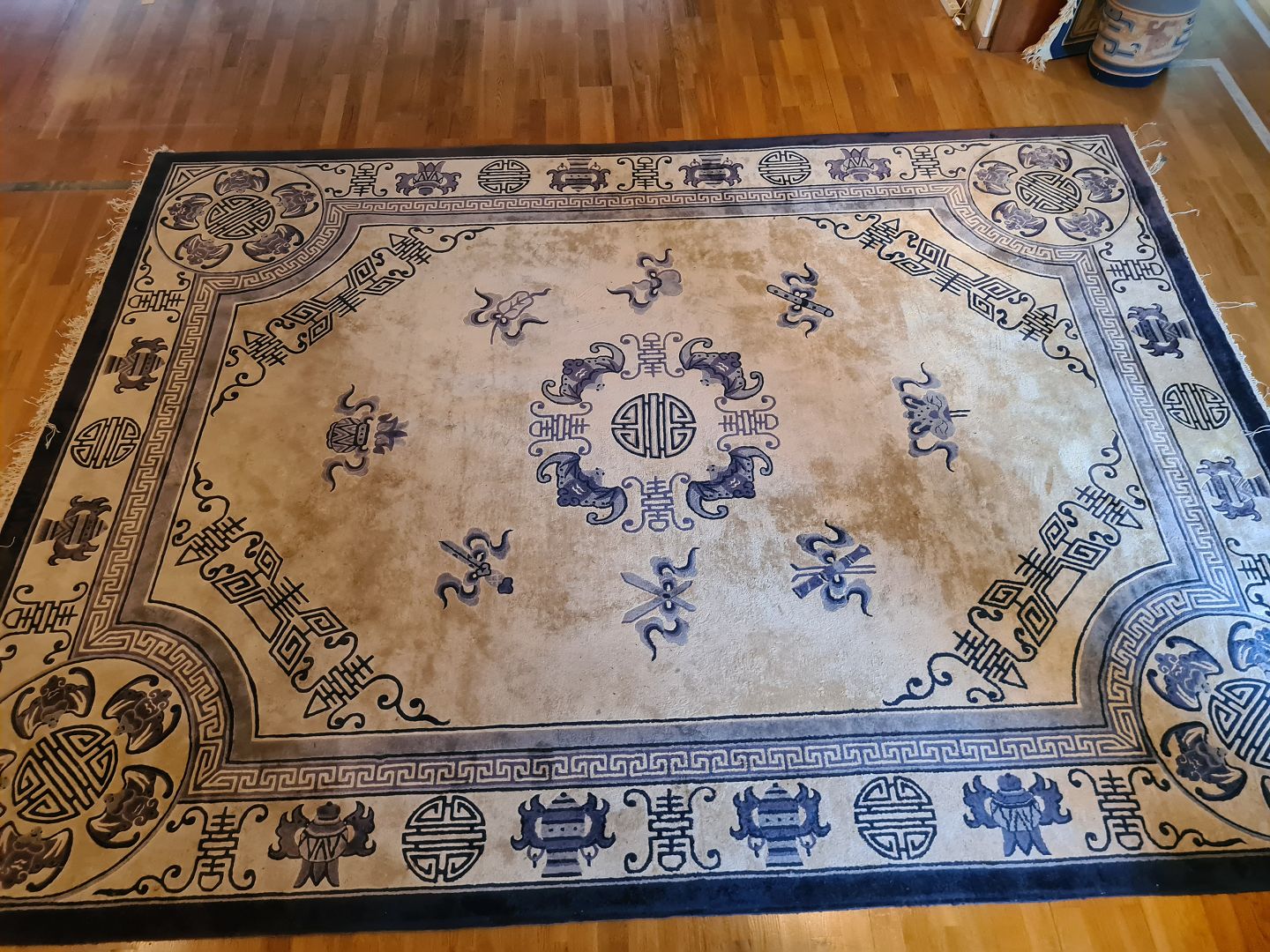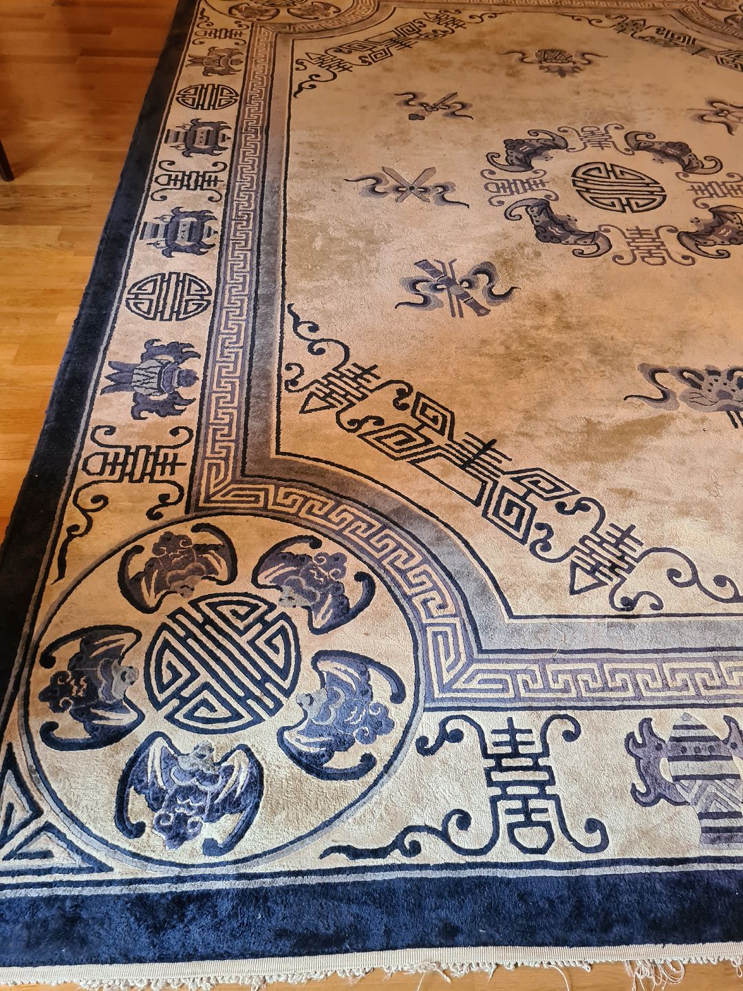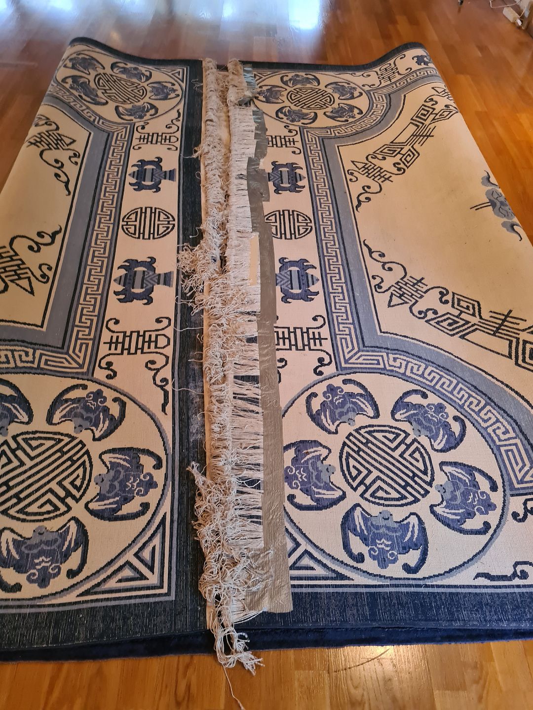 Stort Orientalsk Tæppe i pæn brugt stand. Dog er flæserne tapet fast under tæppet i den ene ende. (Billede)