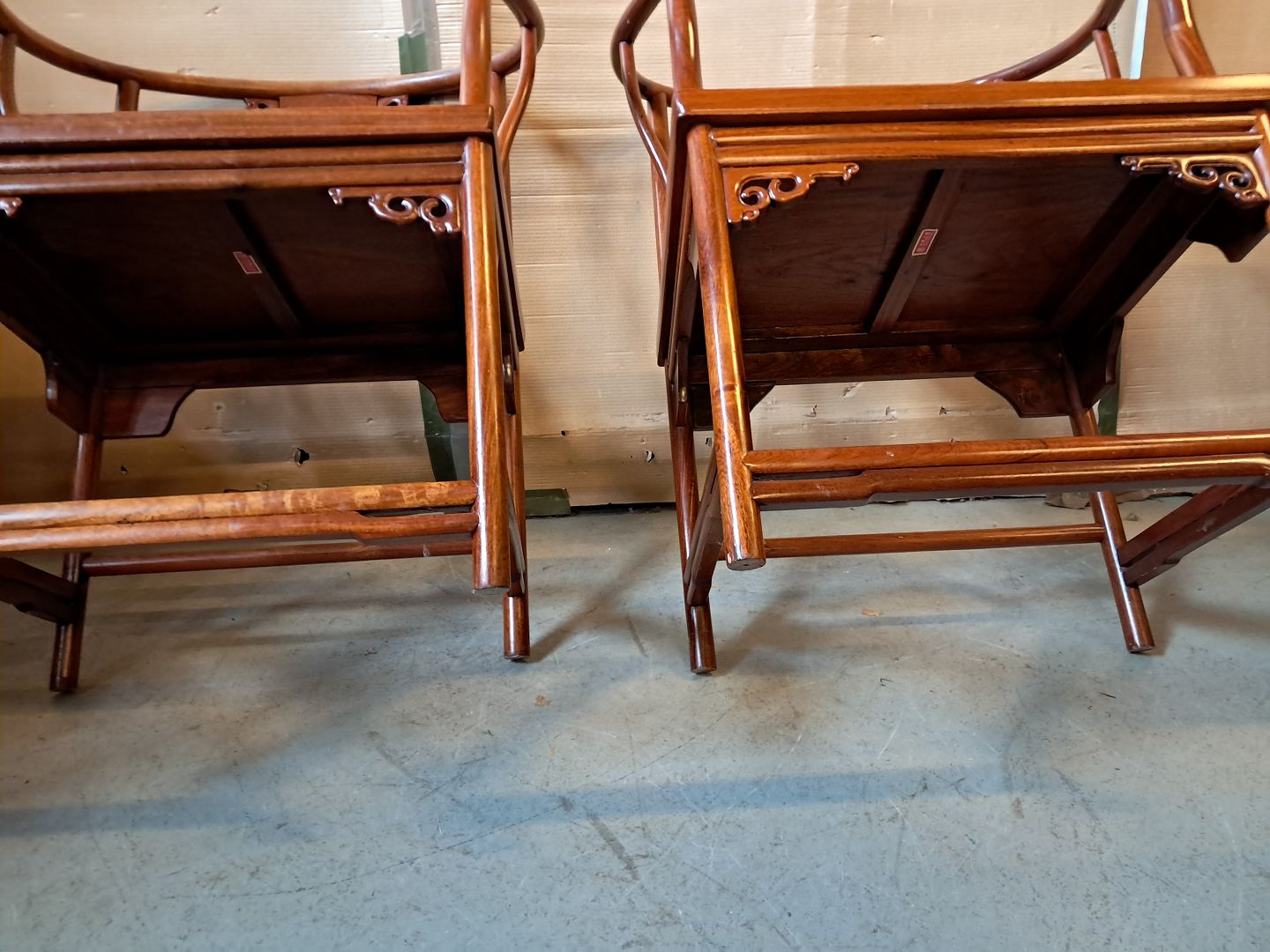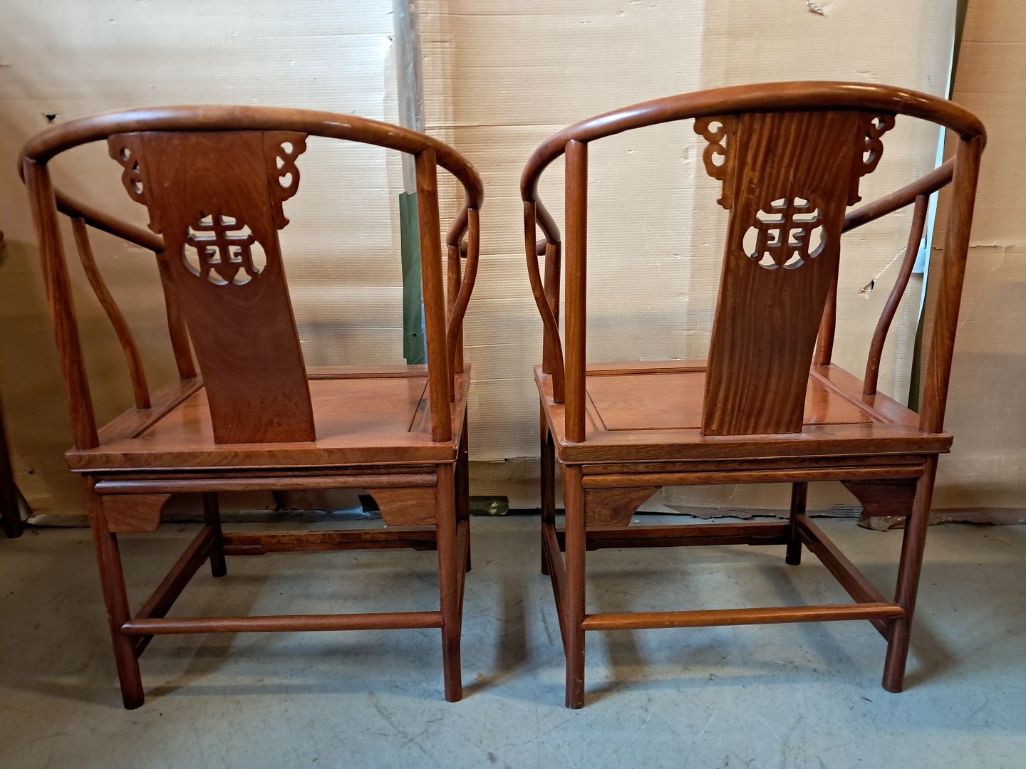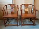 2 Kinesiske stole i massivt træ, fra 1990erne. De har brugsspor. Ryghøjde 93cm Sædehøjde 46cm Emne nummer: 76426