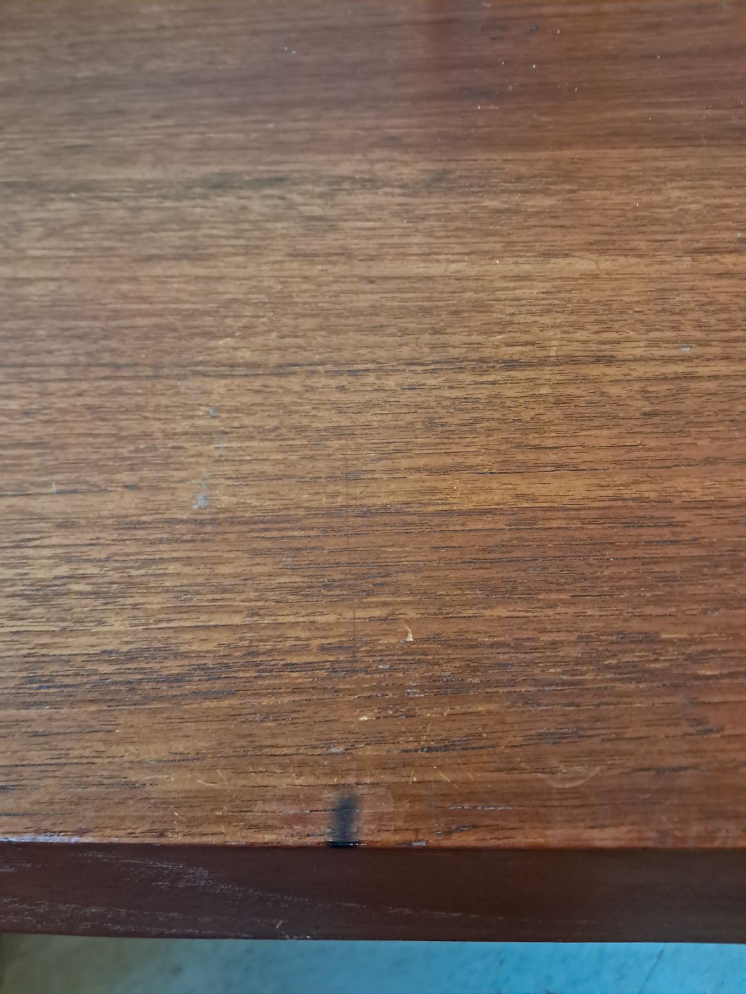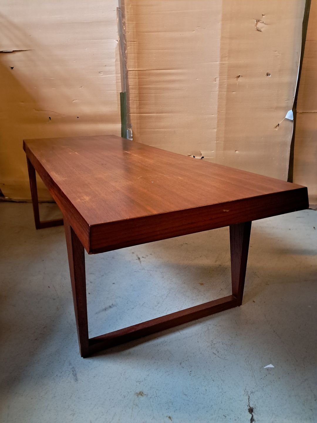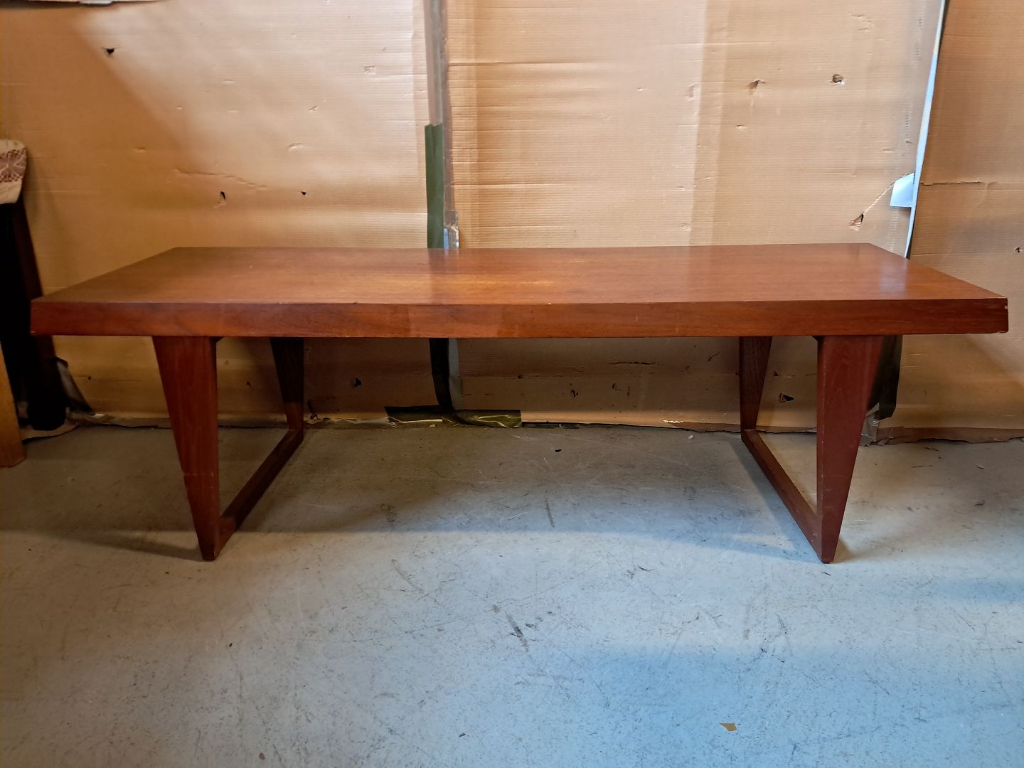 Sofabord i fineret teaktræ, fra 1960erne. Det har brugsspor. Højde 51cm Bredde 60cm Længde 167cm Emne nummer: 76511