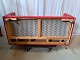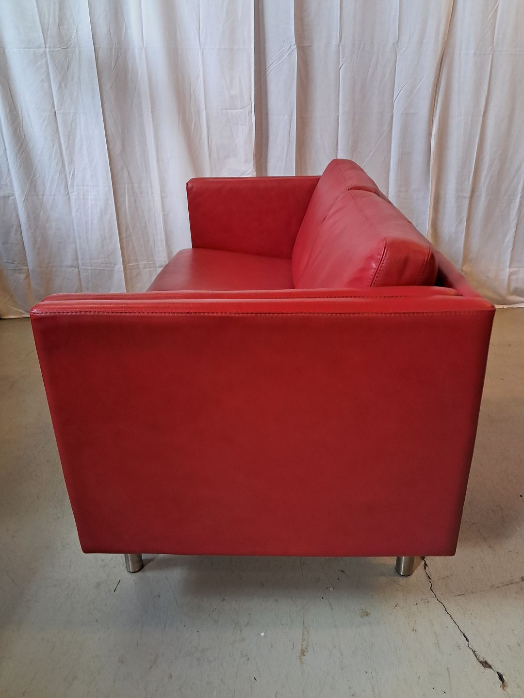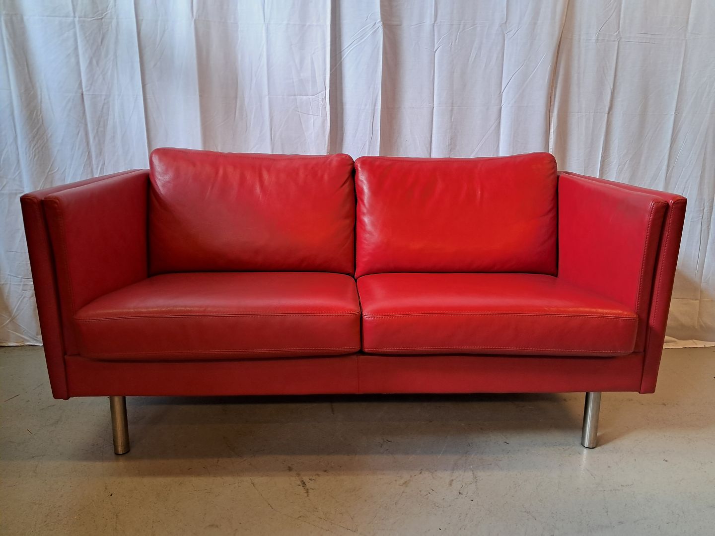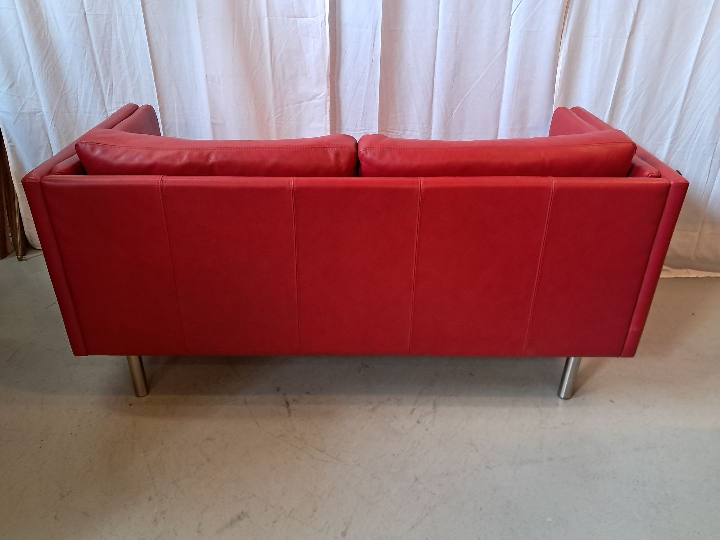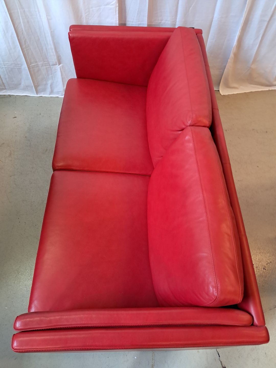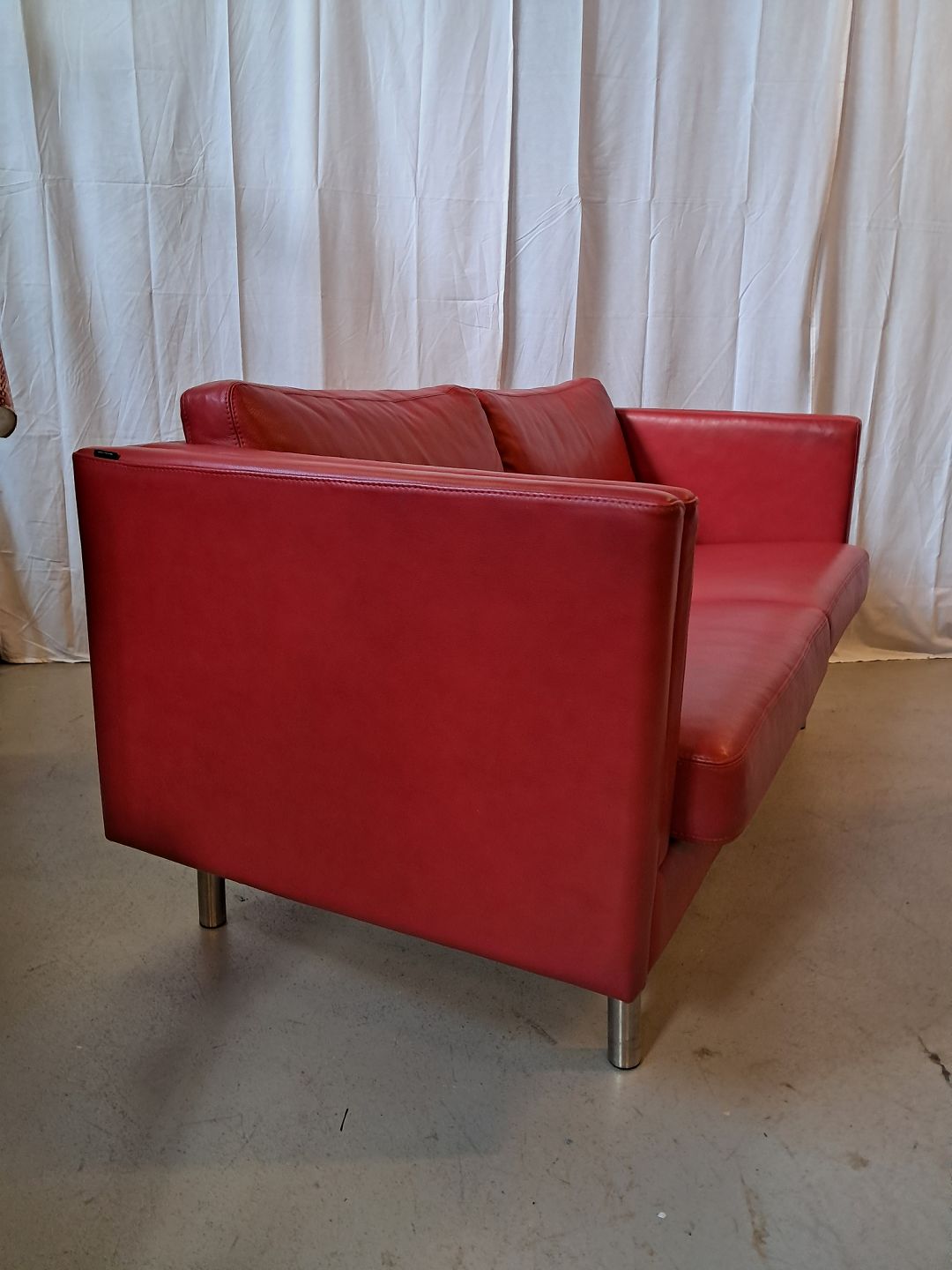 Rød lædersofa fra 2010erne.