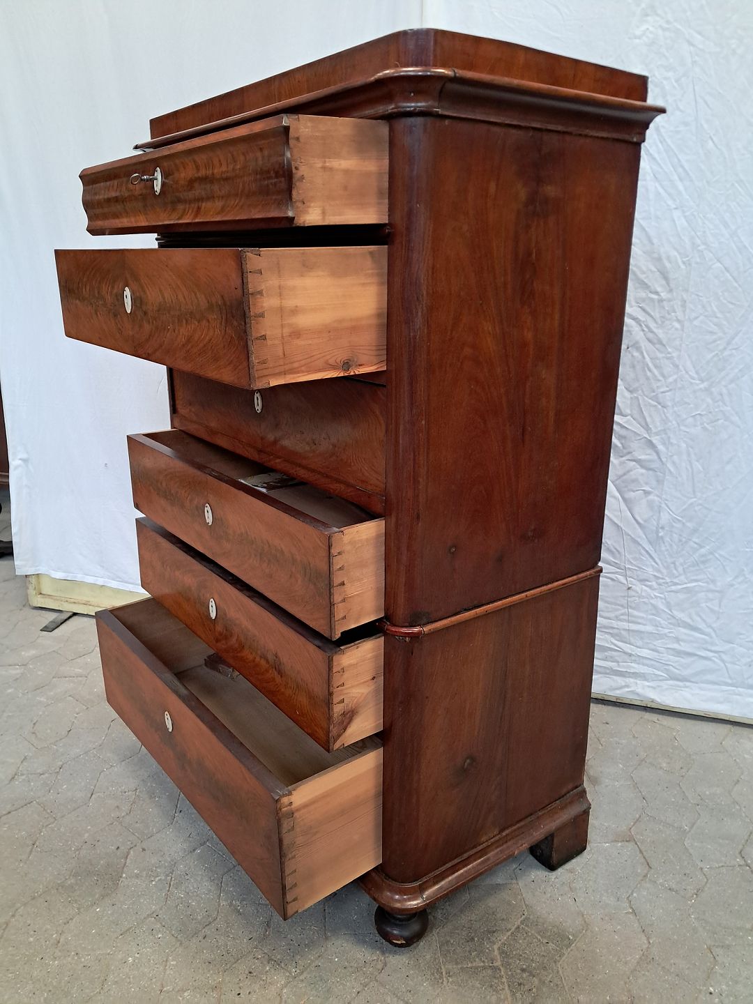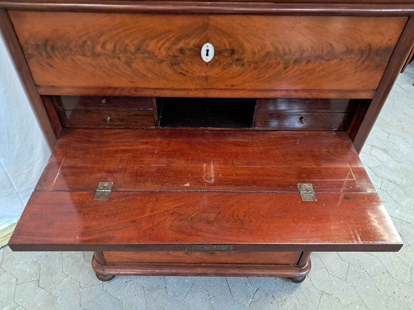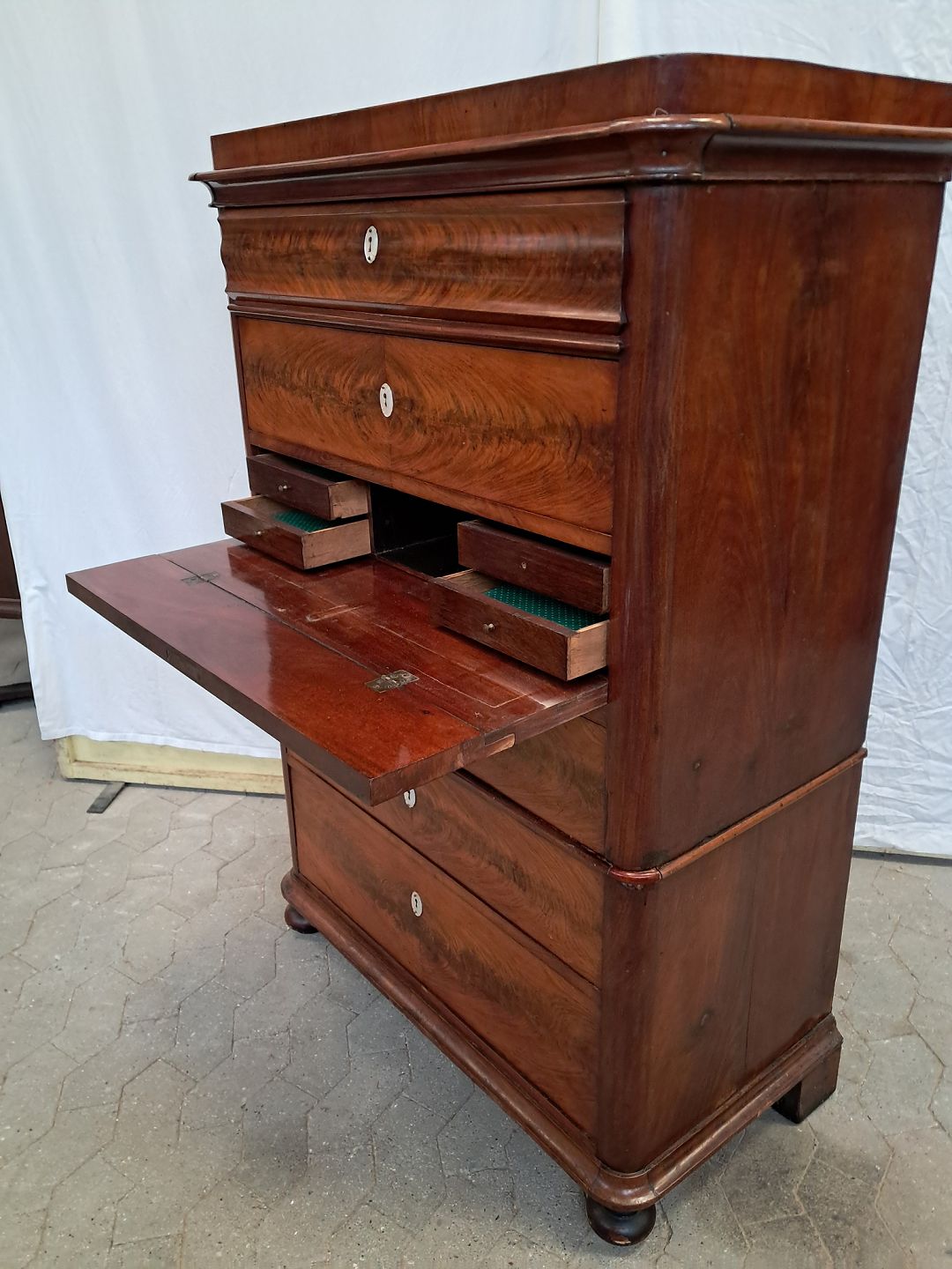 Stor kommode i fineret mahogni med skriveplads, fra 1890erne.