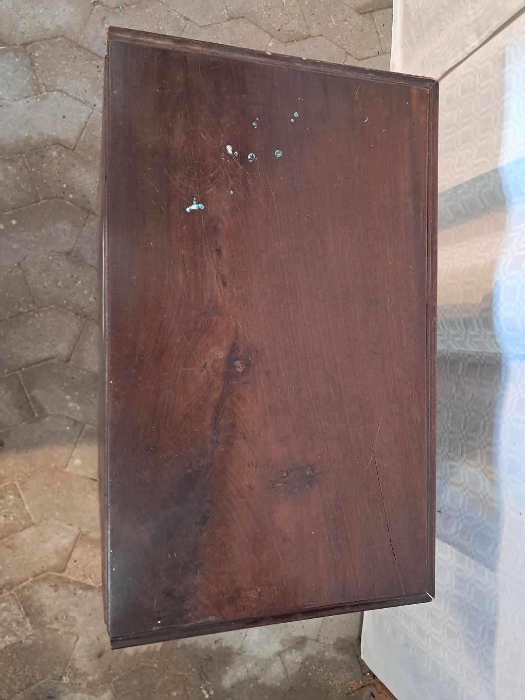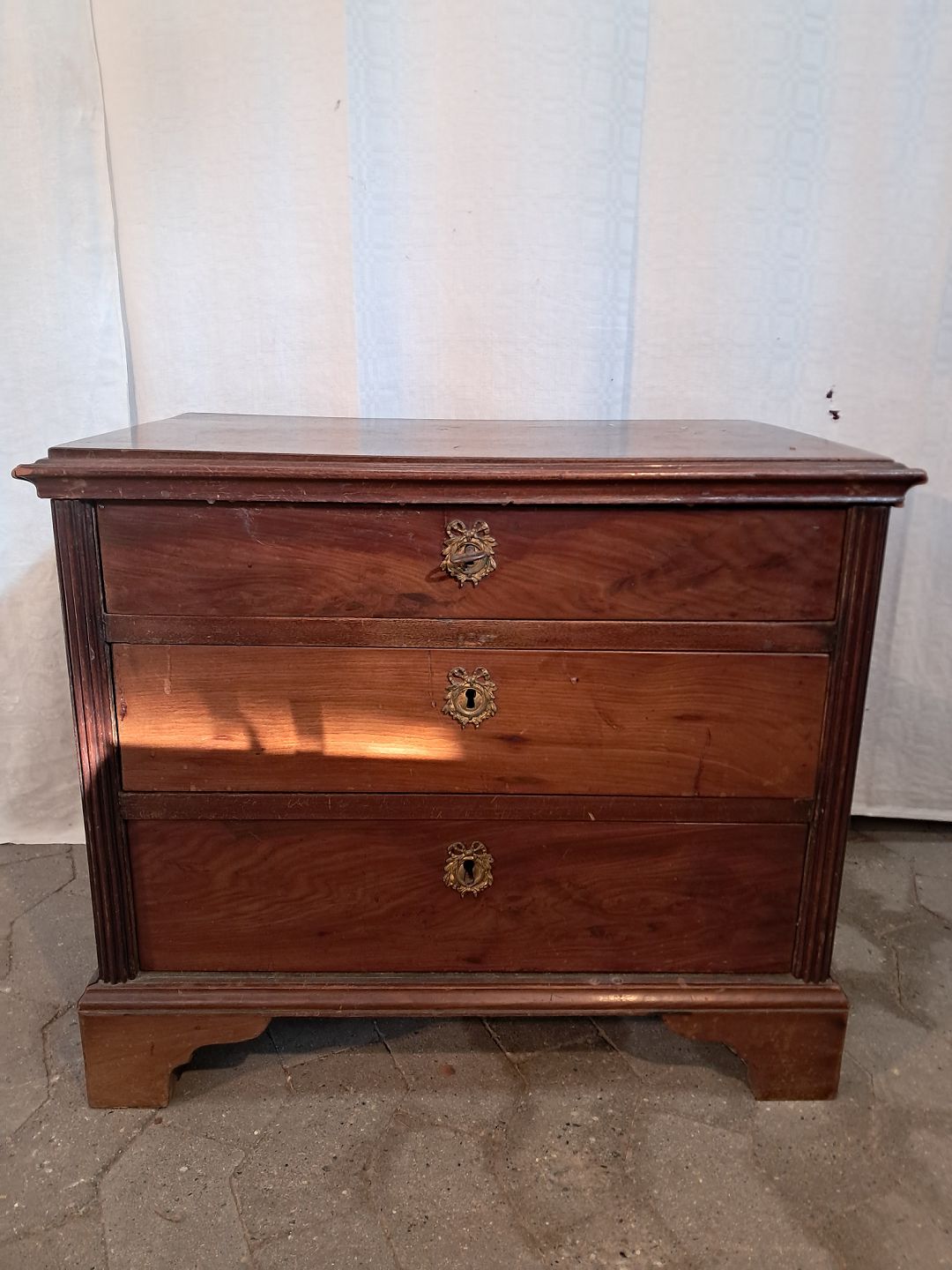 Kommode i fineret mahogni, fra 1890erne. Den har brugsspor og der sidder en nøgle fast i øverste skuffe. Højde 58cm Bredde 64cm Dybde 42cm Emne nummer: 91554