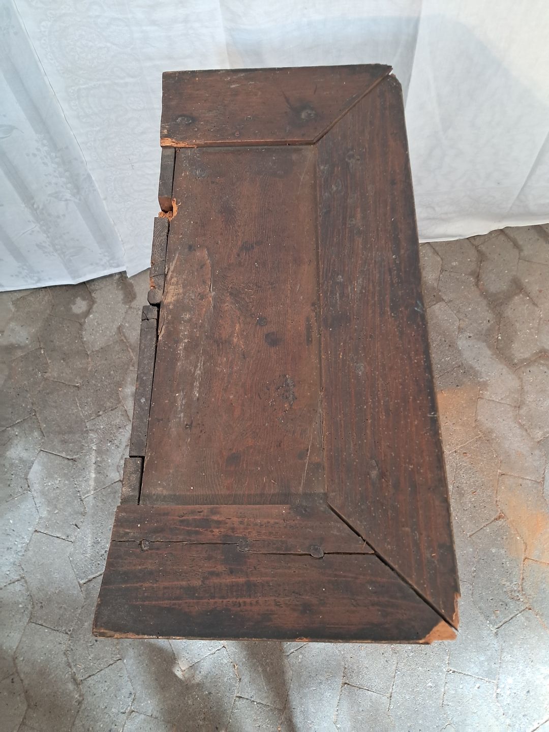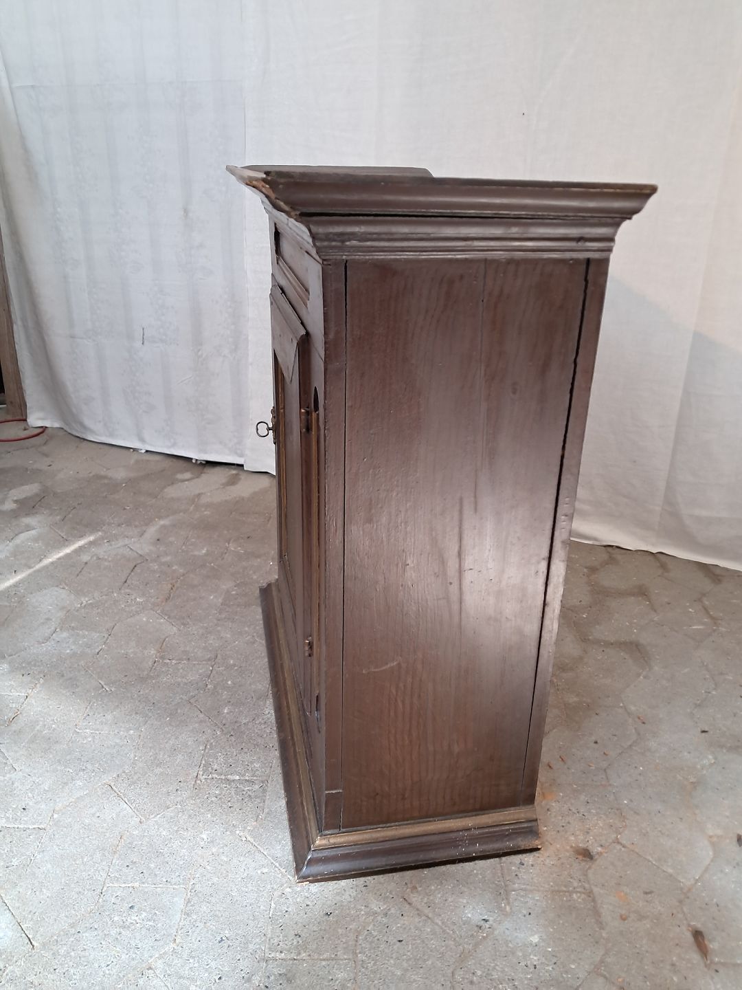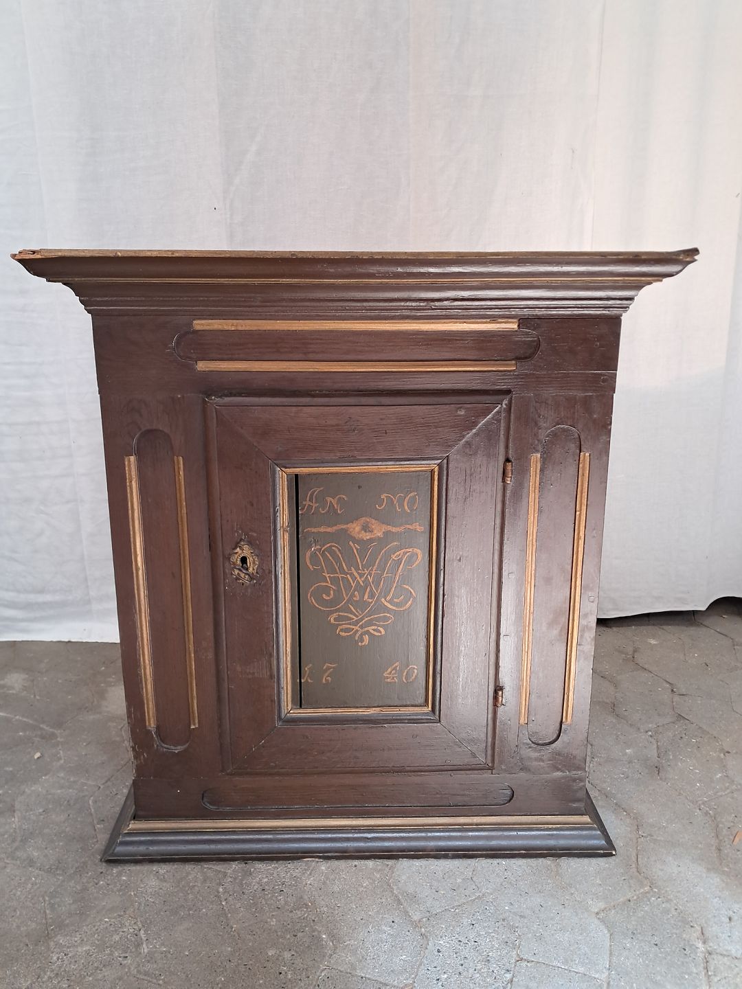 Vægskab i malet massivt fyrretræ, fra måske år 1740. Det har brugsspor/ små defekter og det har været angrebet af træorm. Højde 79cm Bredde 74cm Dybde 34cm Emne nummer: 91564