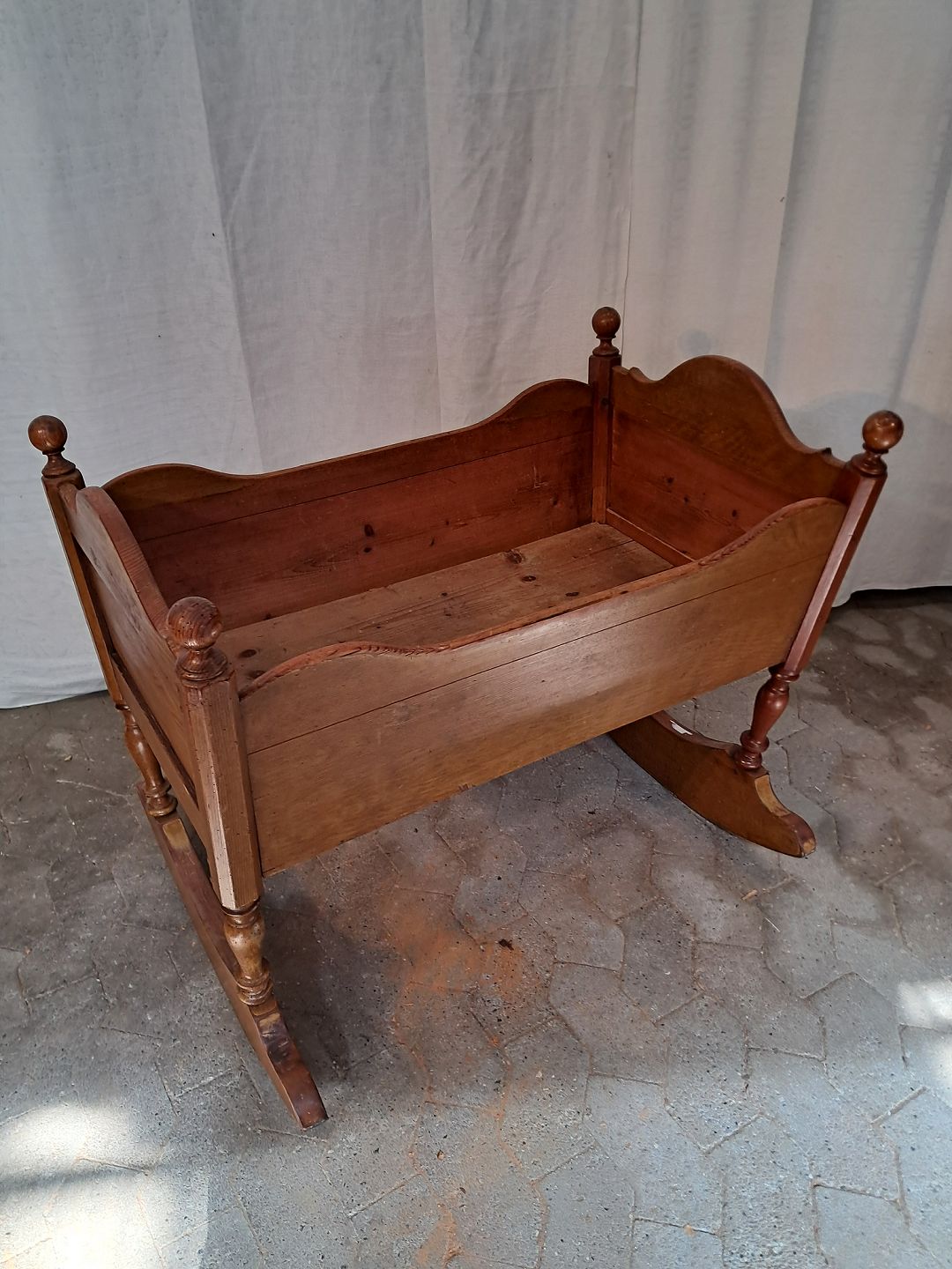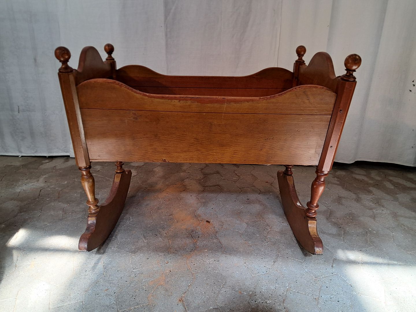 Barneseng / Vugge i massivt fyrretræ, fra 1910erne. Den har patina, men bunden skal repareres. Højde 80cm Bredde 54cm Længde 90cm Madras mål : Bredde 45cm Længde 82cm Emne nummer: 91566