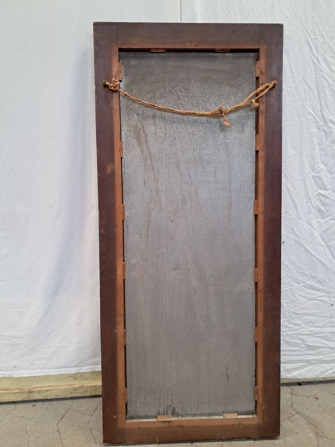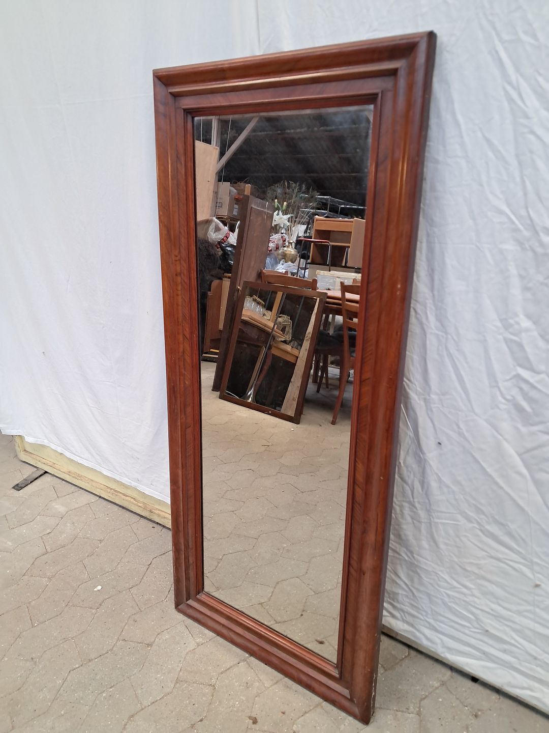 Spejl i fineret mahogni, frta 1900erne. Det har brugsspor og forringet spejlbillede. Højde 131cm Bredde 58cm Emne nummer: 91596
