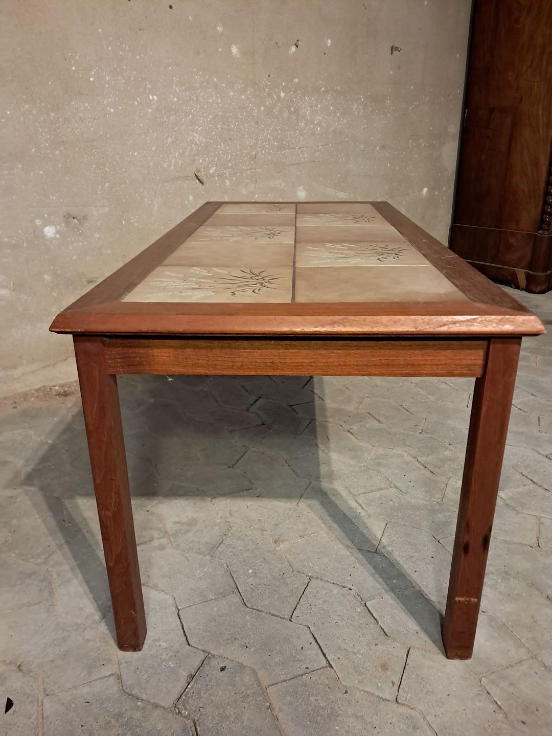 Sofabord i fineret teaktræ med kakler, fra 1960erne. Det har brugsspor. Højde 50cm Bredde 53cm Længde 113cm Emne nummer: 91613