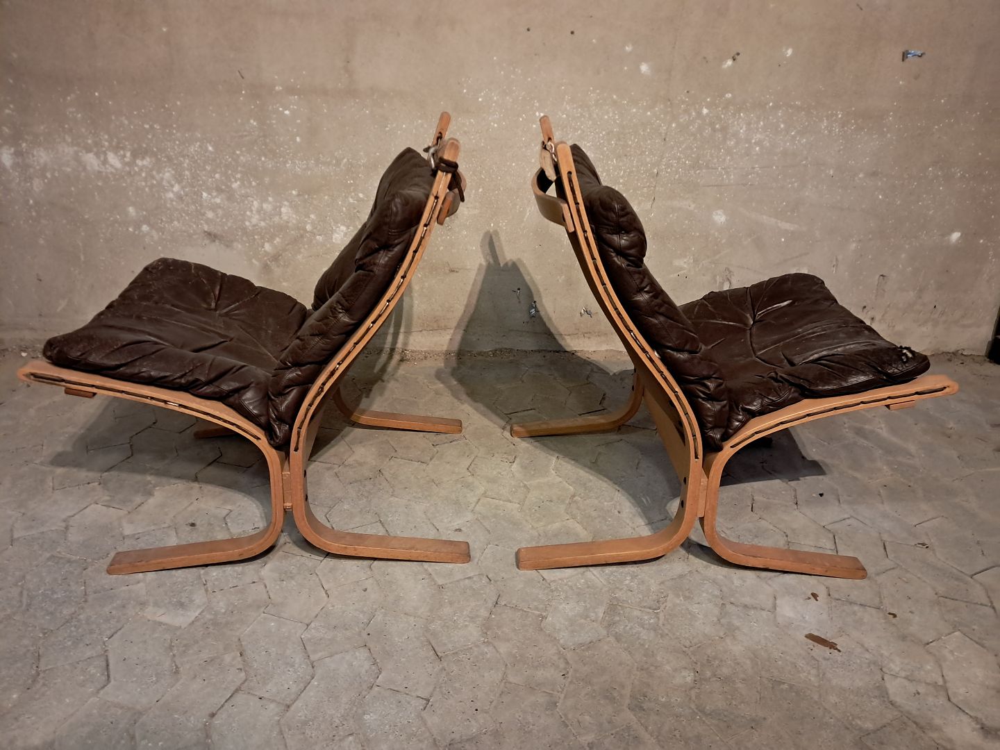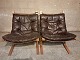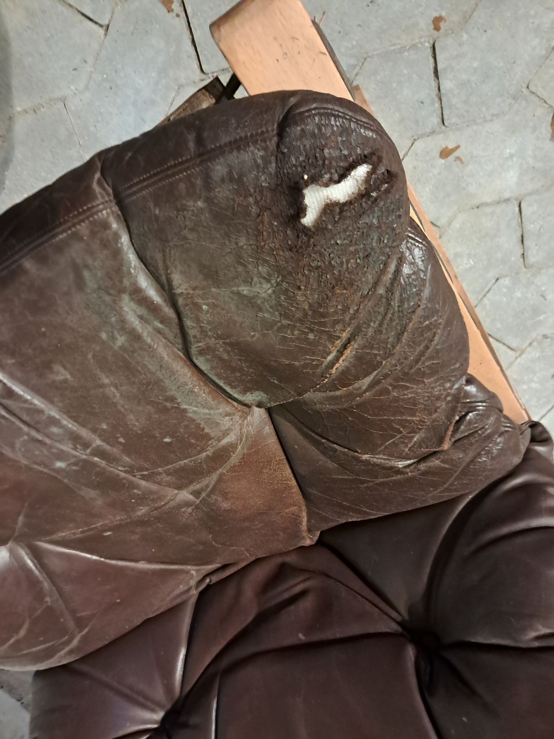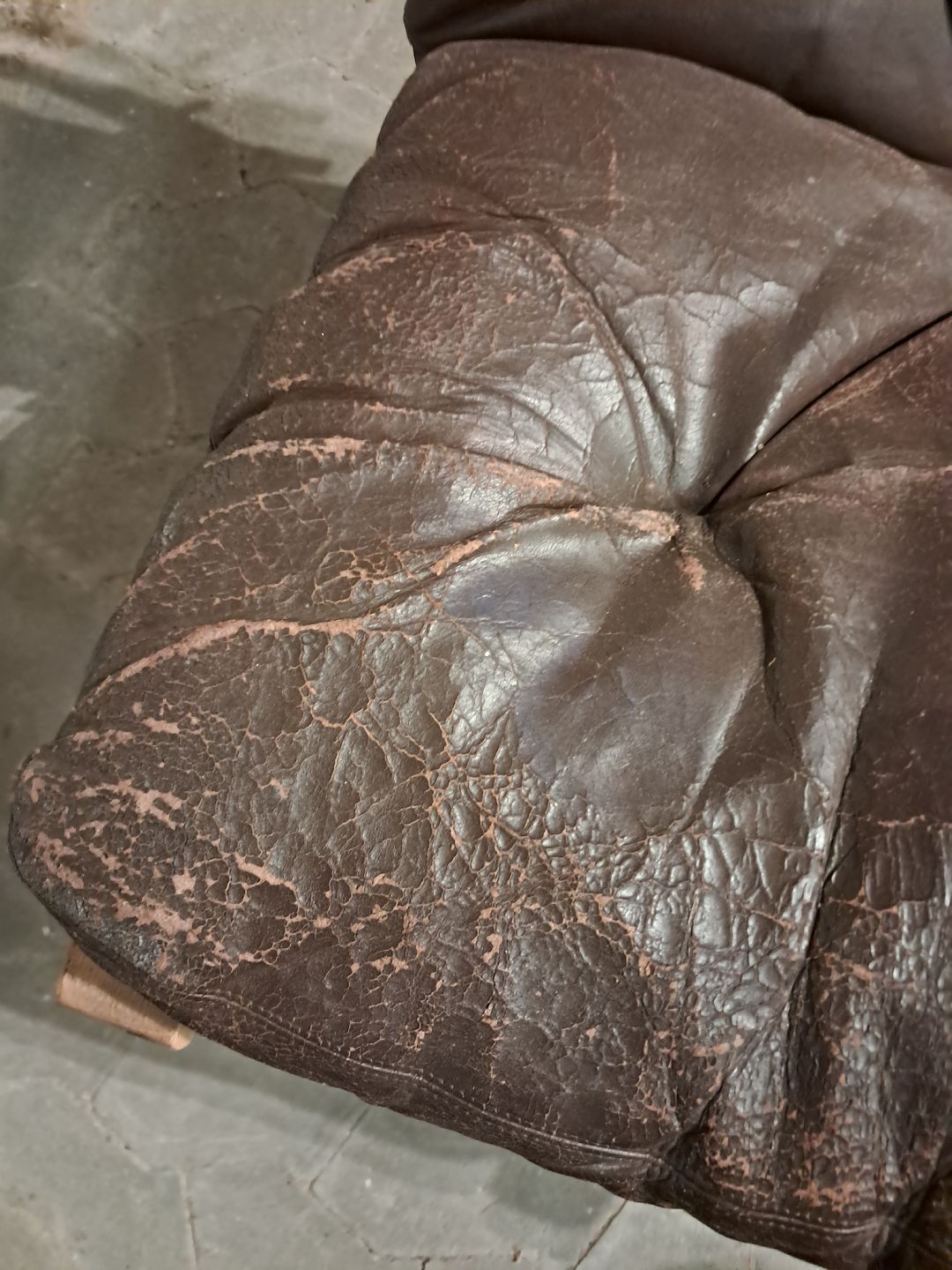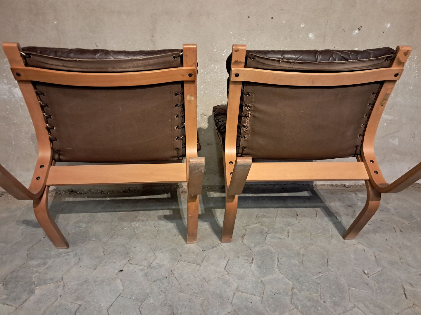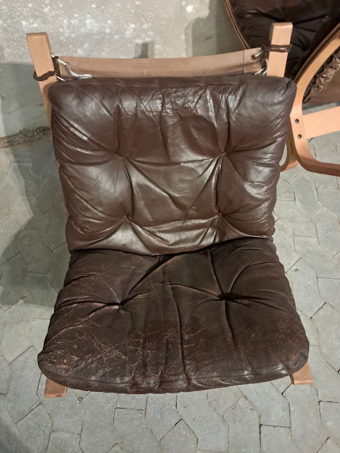 2 Lænestole i bøgetræ og læder, fra 1980erne. De her brugsspor og defekter. (se foto) Ryghøjde 81cm Sædehøjde 43cm Emne nummer: 91644