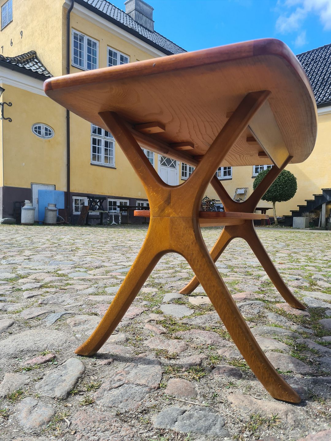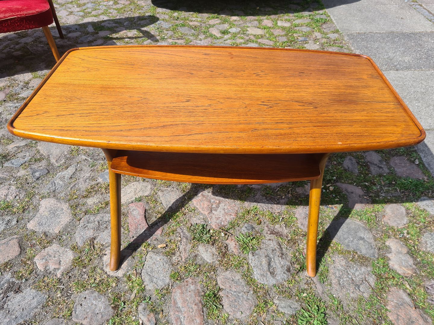 Dansk møbelproducent sofabord i fineret teak med underhylde samt stel i egetræ.
