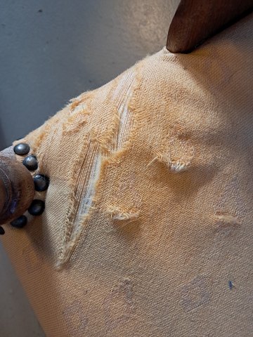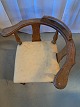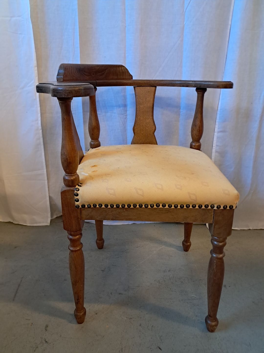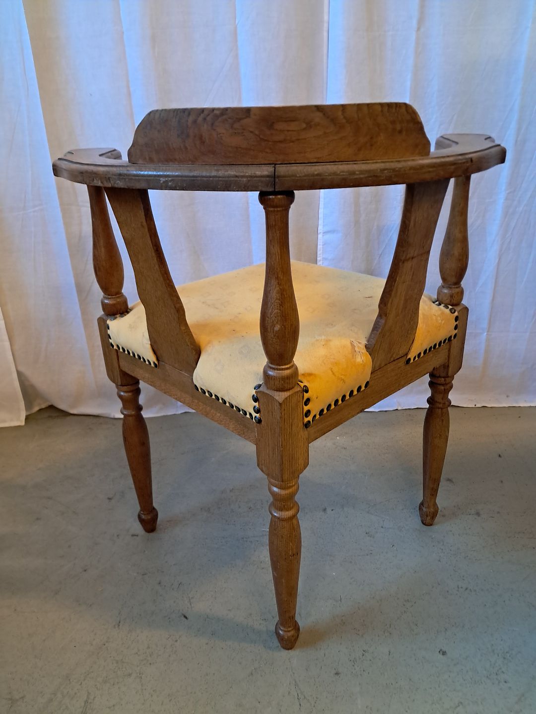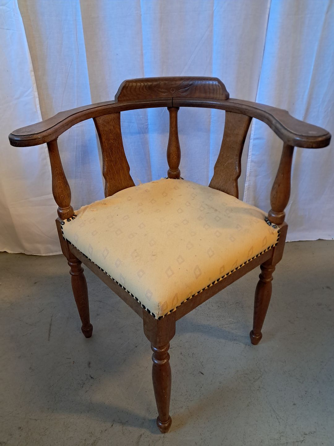 Hjørnestol i massivt egetræ, fra 1920erne. Den har brugsspor og betrækket er defekt. Ryghøjde 78cm Bredde 45cm Emne nummer: 76658