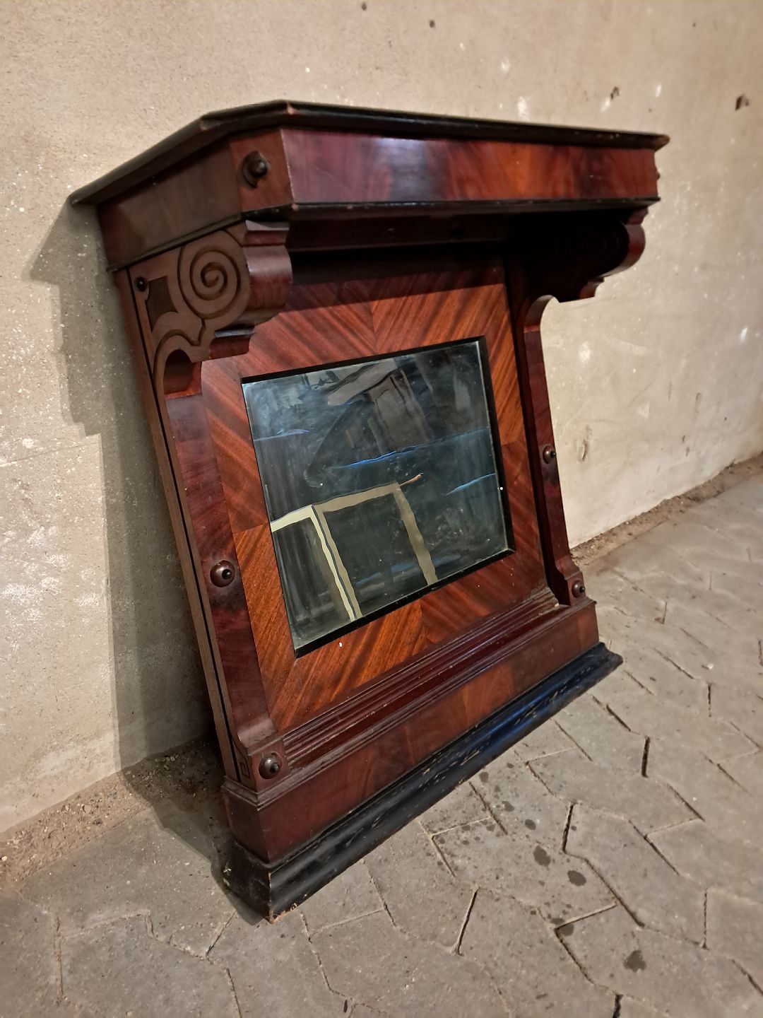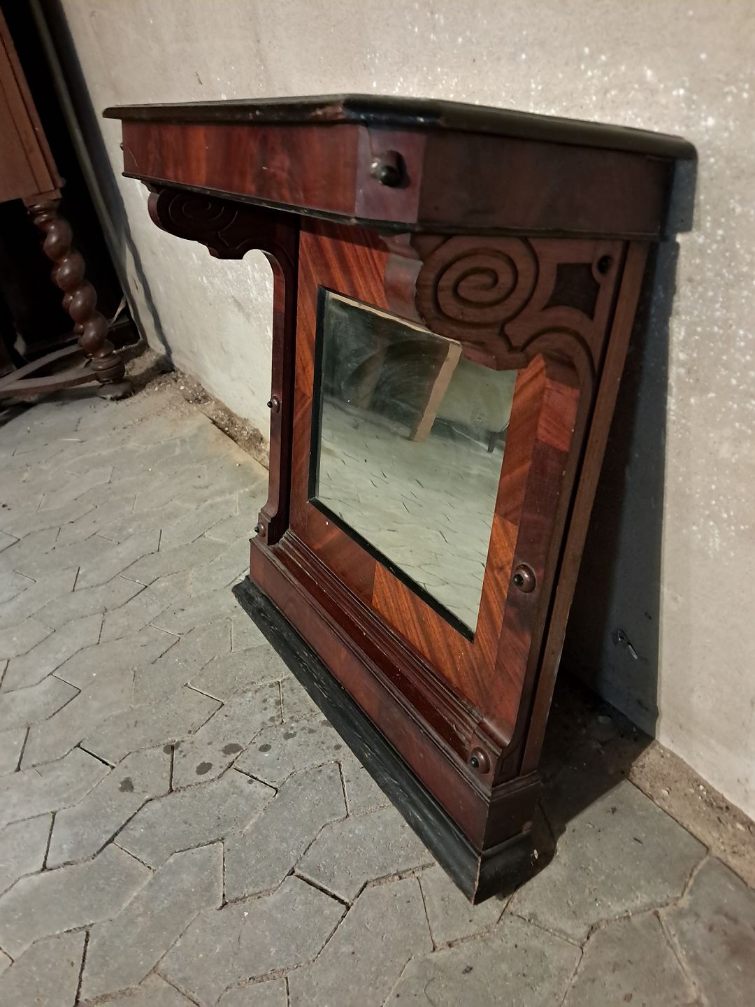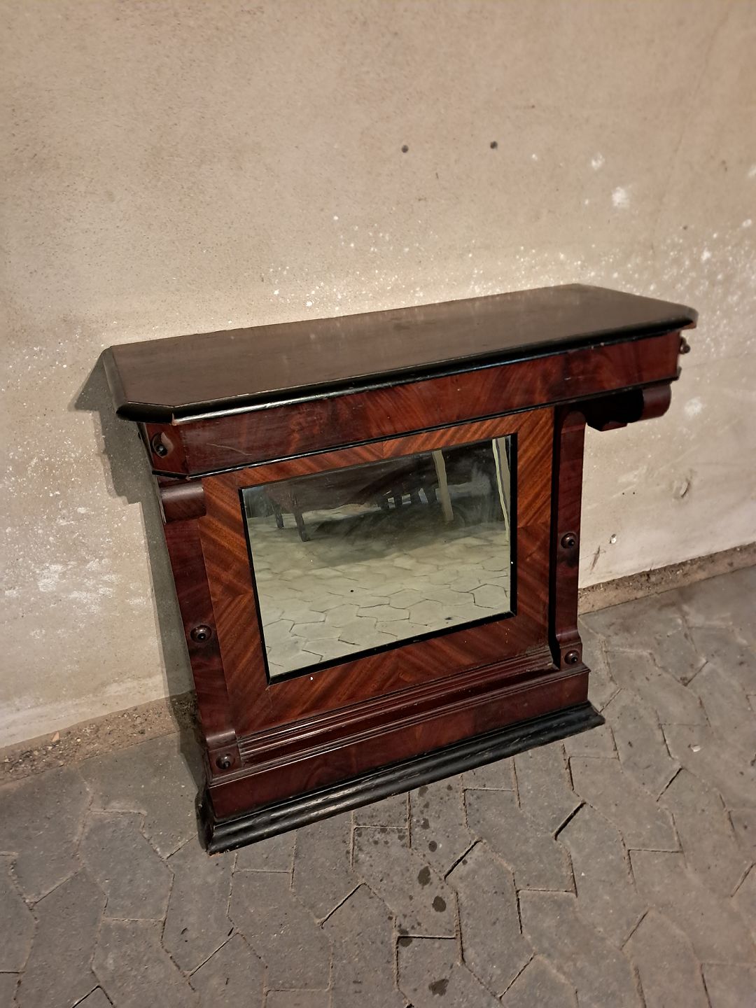Entremøbel i fineret mahogni, fra 1900erne. Det har brugsspor og spejlet har forringet billedkvalitet. Højde 82cm Bredde 76cm Dybde 32cm Emne nummer: 91668