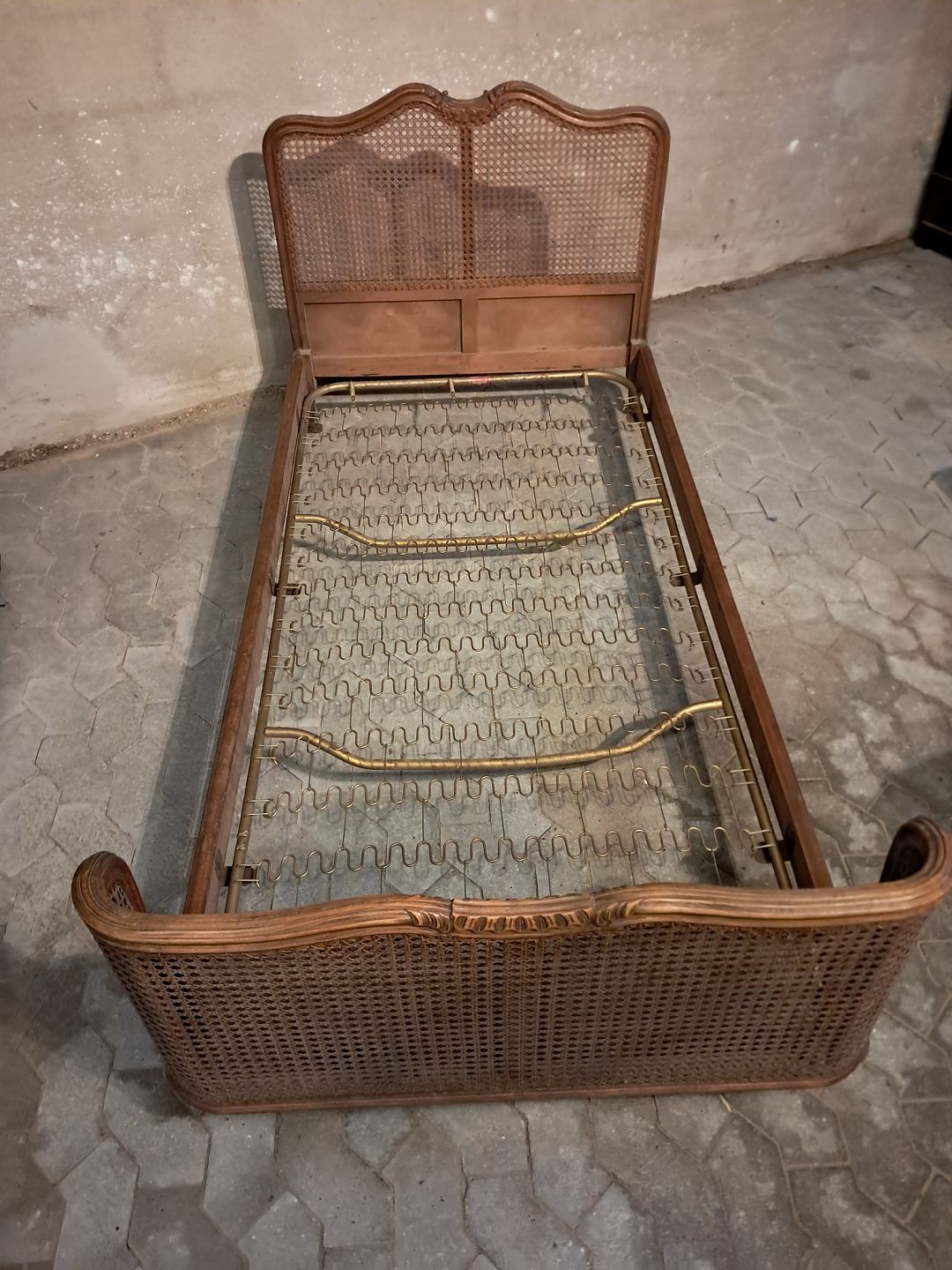 Seng i massivt bøgetræ med rørflet, fra 1950erne. Den har brugsspor og der medfølger ikke madras. Gavlhøjde 90cm og 64cm Bredde 96cm længde 198cm Madras mål : 190cm X 89cm Emne nummer: 91672