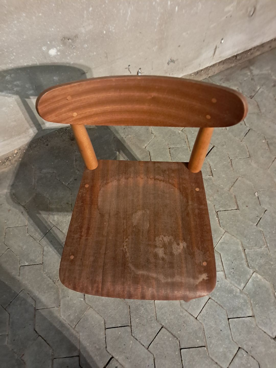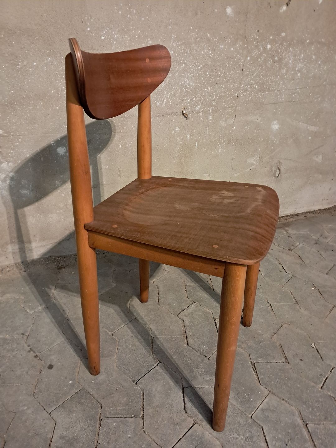Stol i fineret mahogni og massivt bøgetræ, fra 1960erne. Den har brugsspor og defekt finer. Ryghøjde 79cm Sædehøjde 45cm Emne nummer: 91677