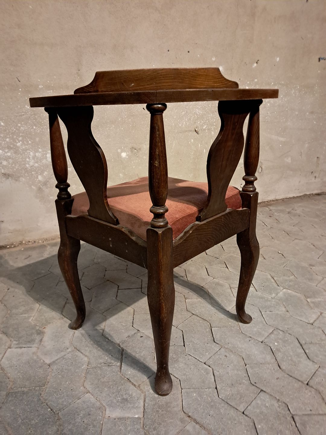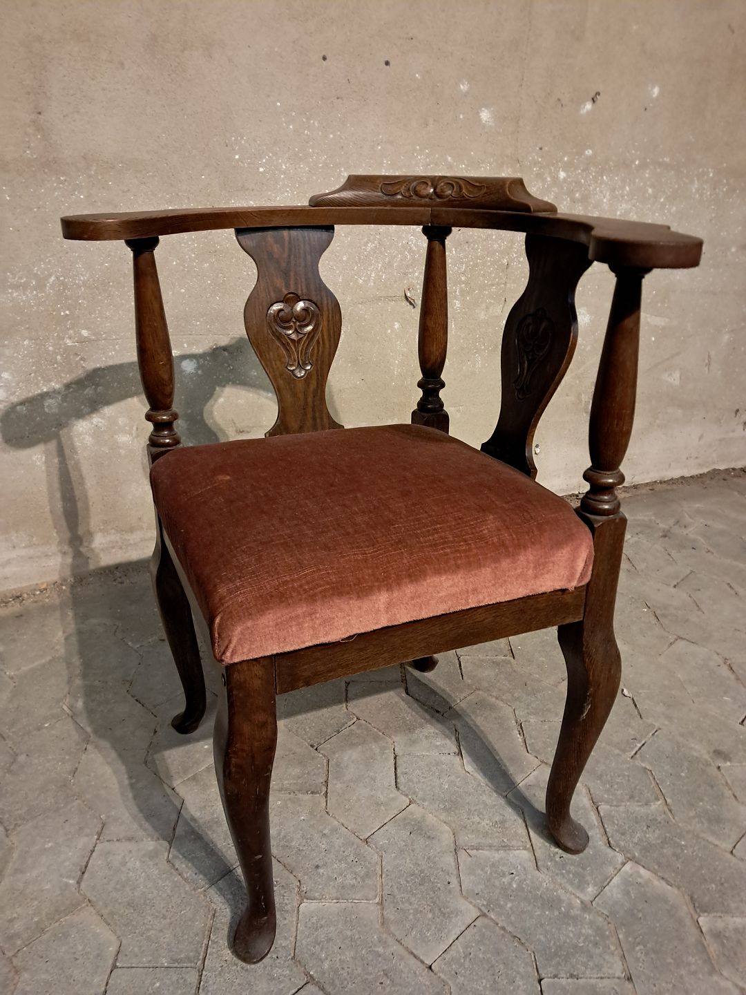 Hjønestol i massivt egetræ, fra 1920erne. Den har brugsspor og betrækket er slidt. Ryghøjde 85cm Sædehøjde 44cm Emne nummer: 91682