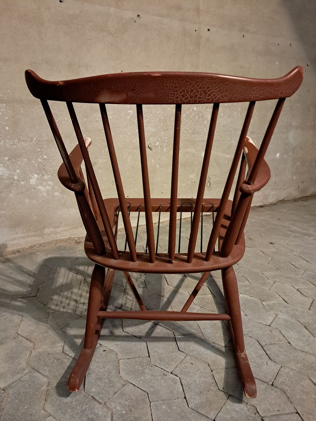 Malet gyngestol fra 1970erne. Der medfølger ikke hynde og den trænger til, at blive peppet op. Ryghøjde 81cm Sædehøjde 41cm Emne nummer: 91689