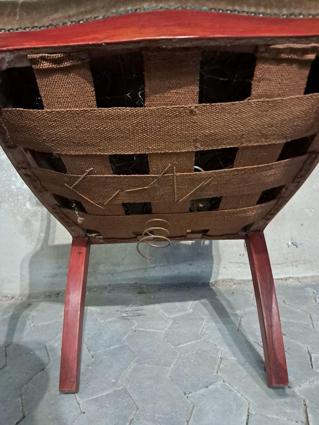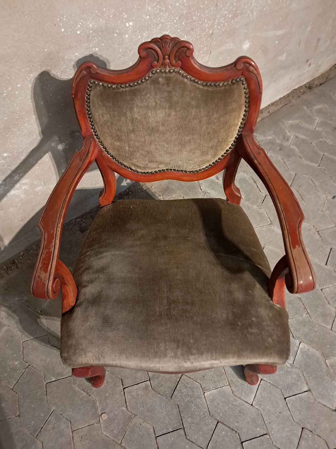 Malet armstol i massivt bøgetræ med velourbetræk, fra 1920erne. Den har brugsspor og en defekt fejdre Ryghøjde 94cm Sædehøjde 46cm Emne nummer: 91707