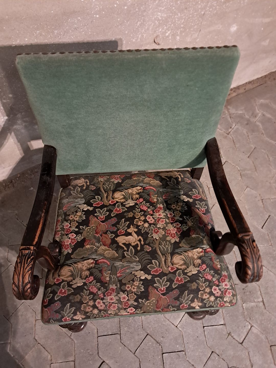 Armstol i massivt egetræ, fra 1930erne. Den har brugsspor. Ryghøjde 95cm Sædehøjde 47cm Emne nummer: 91713