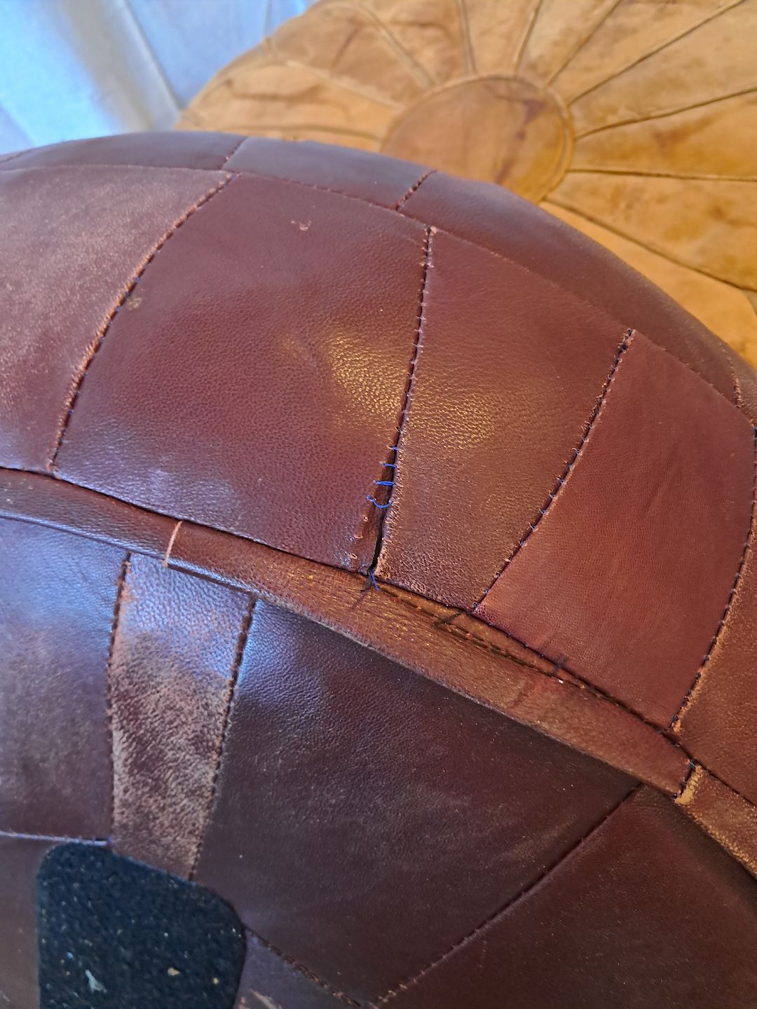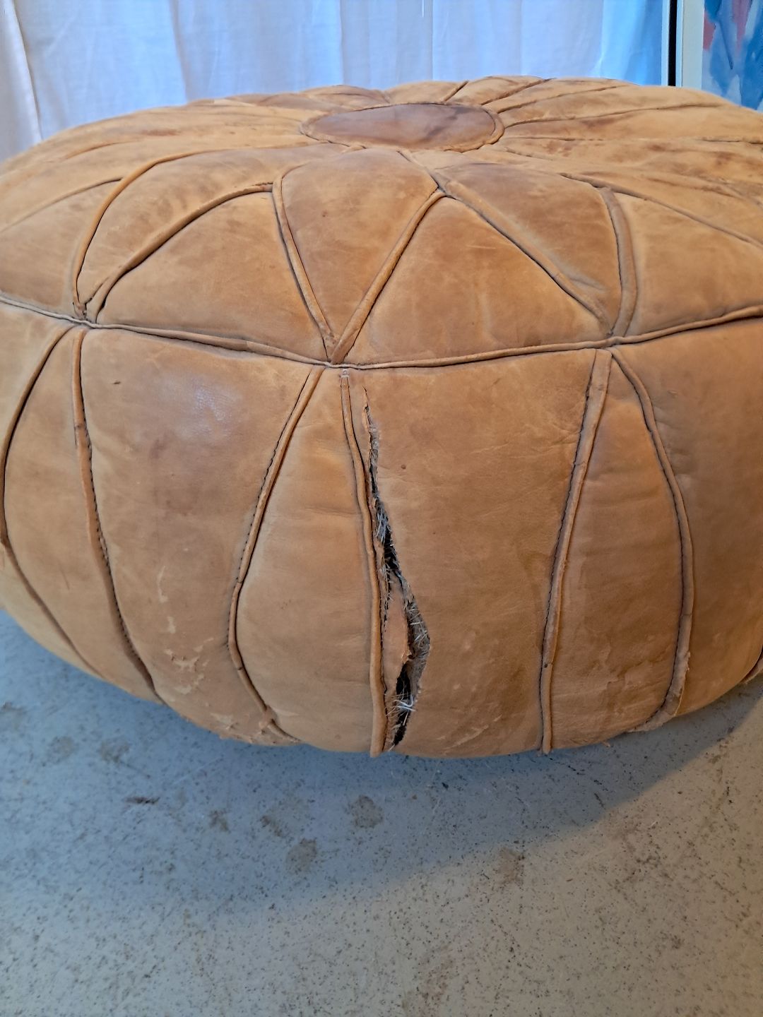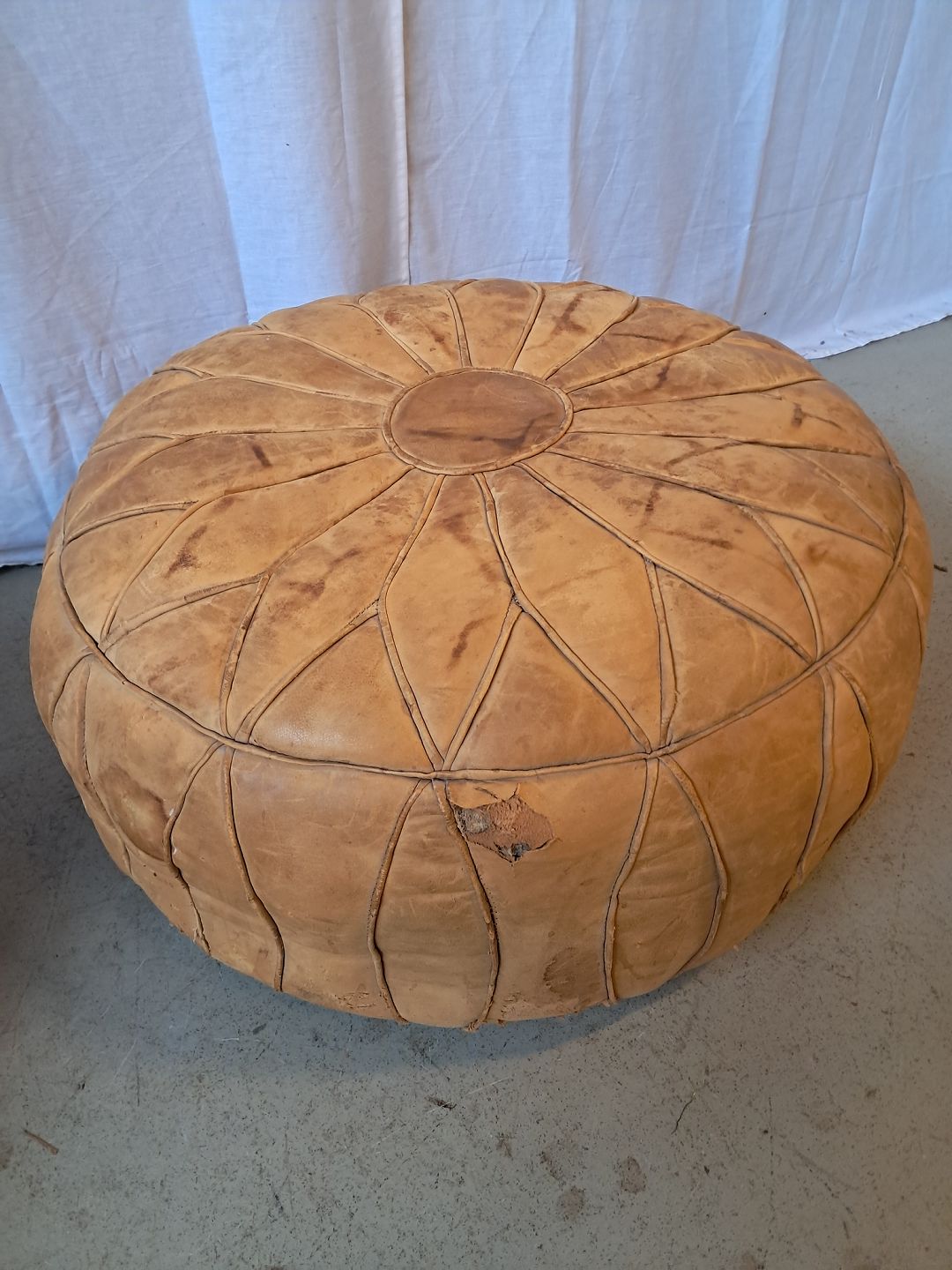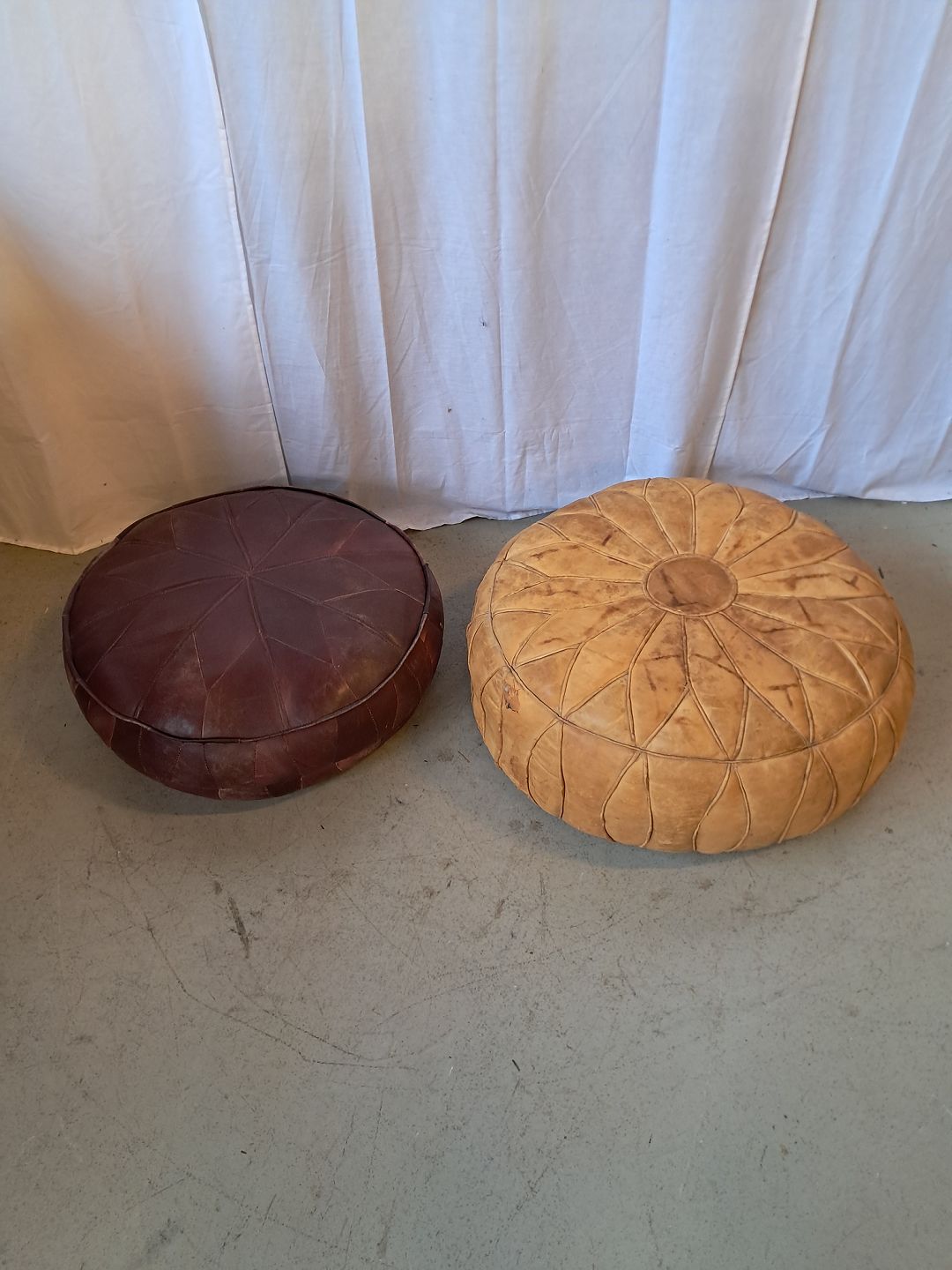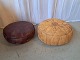 2 Marokkopuder i læder fra 1990erne. De har defekter. Højde 27cm Diameter 68cm Højde 22cm Diameter 60cm Emne nummer: 76838