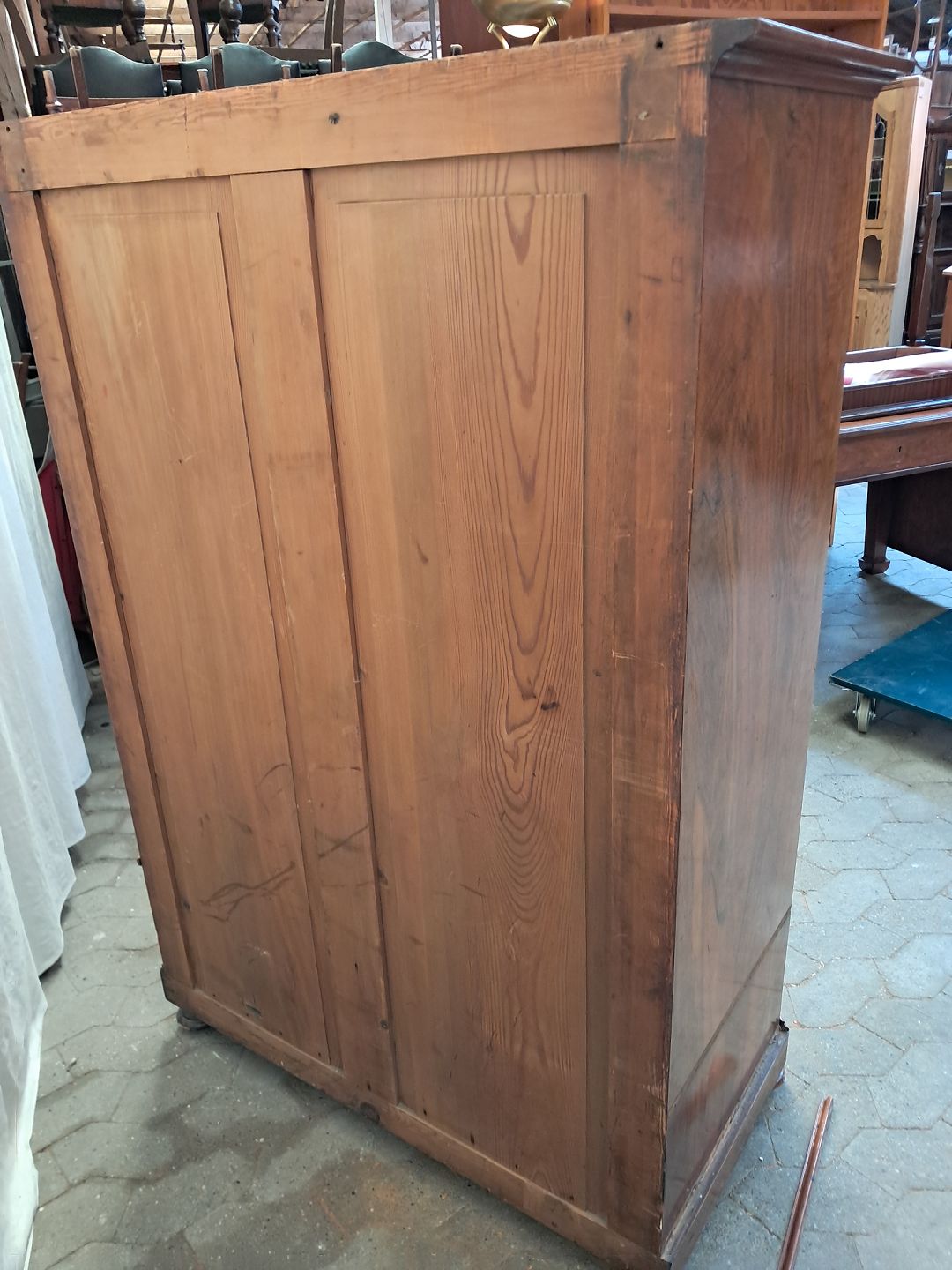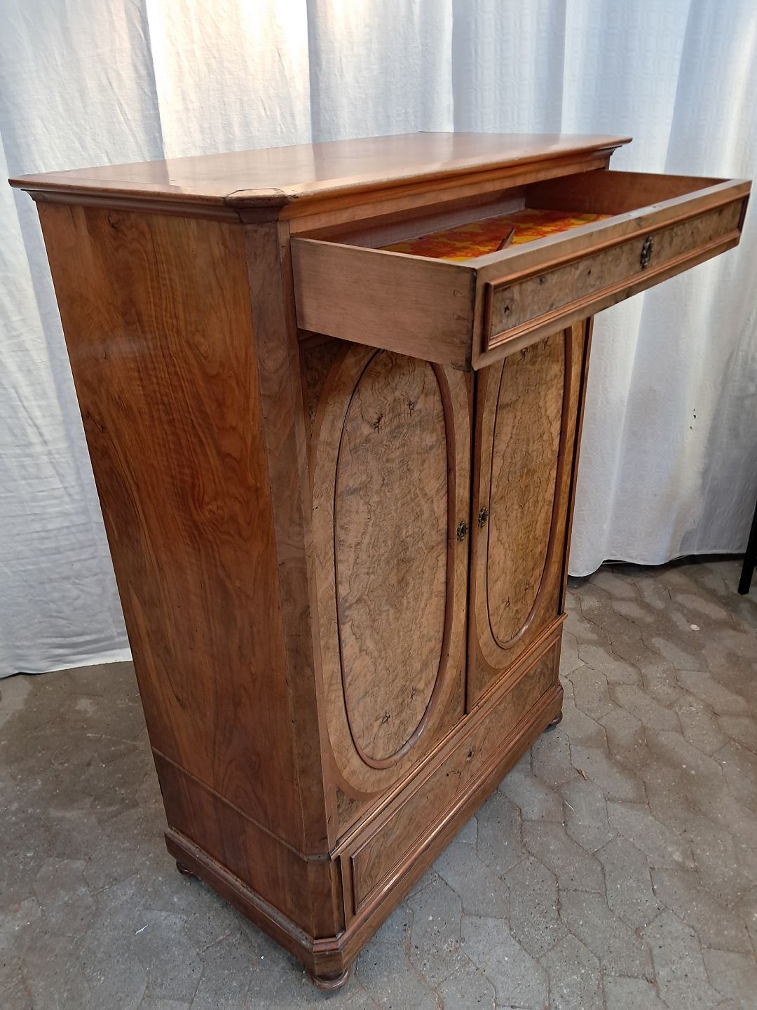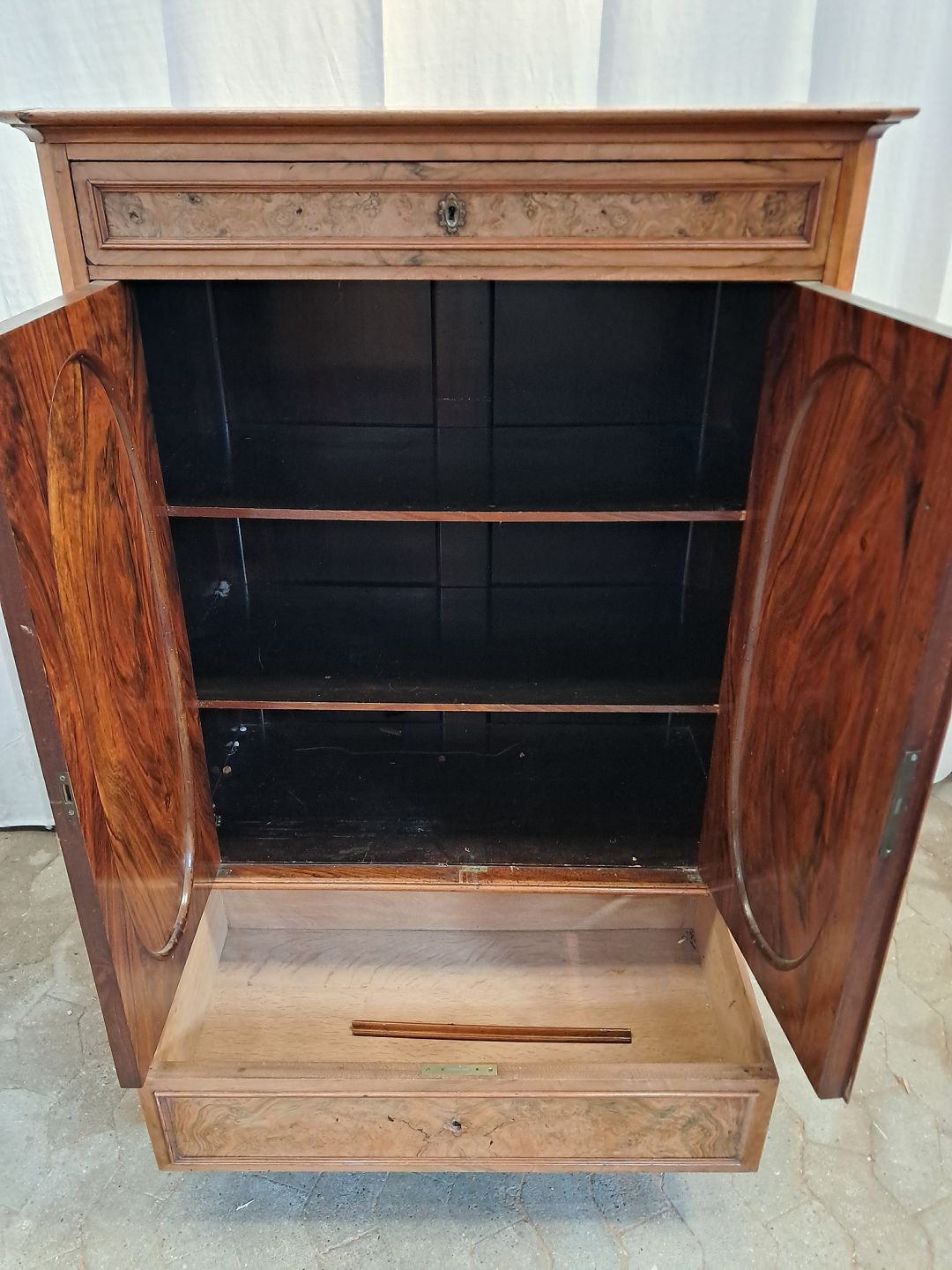 Skab i fineret mahogni, fra 1900erne. Det har brugsspor og mangler sidelister. Højde 145cm Bredde 101cm Dybde 50cm Emne nummer: 91740