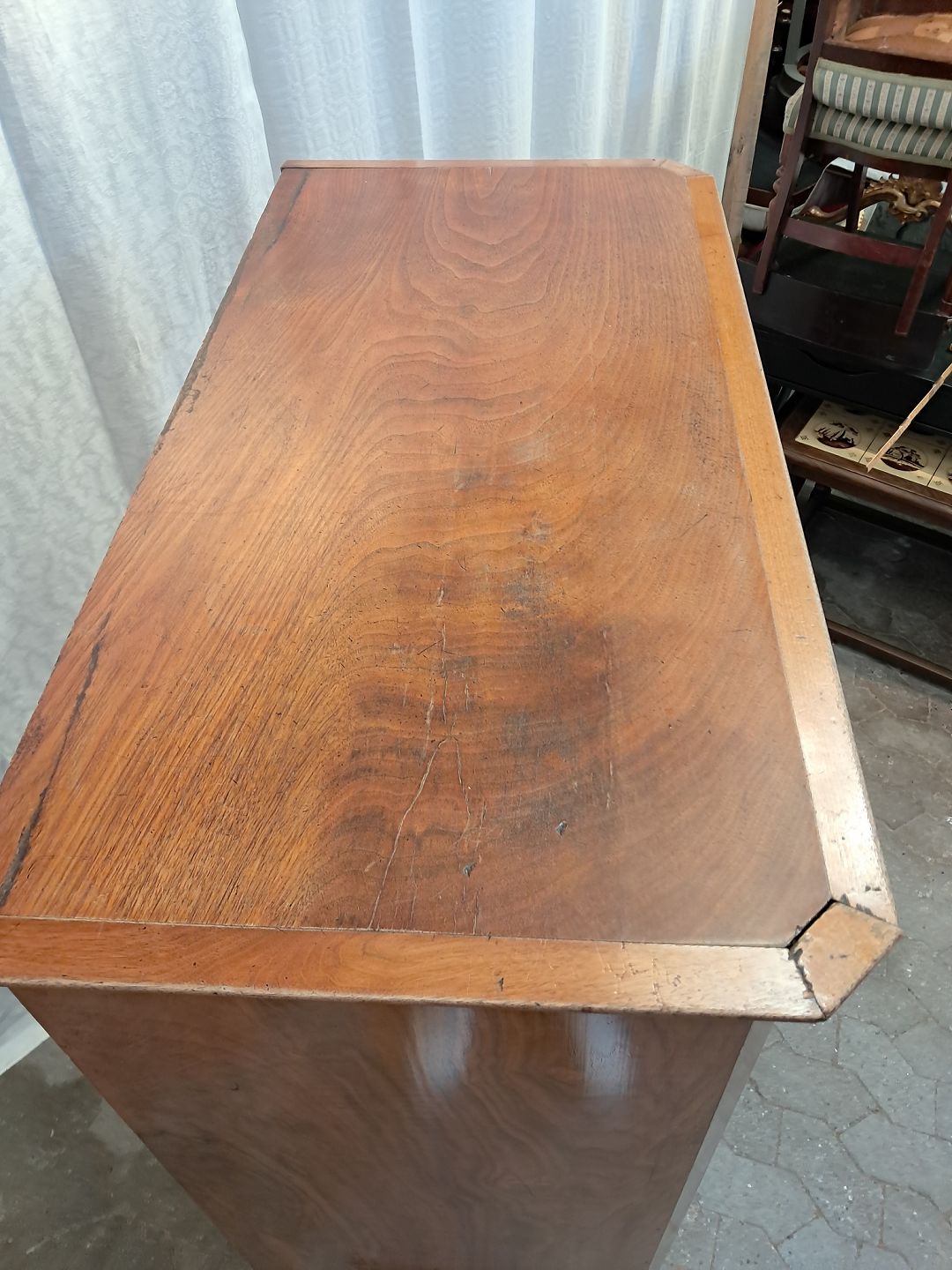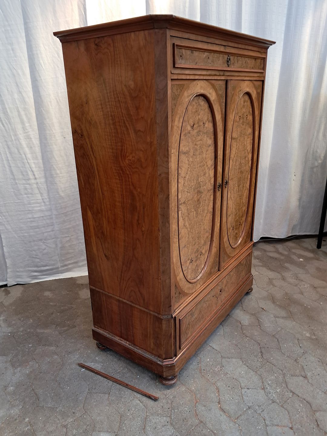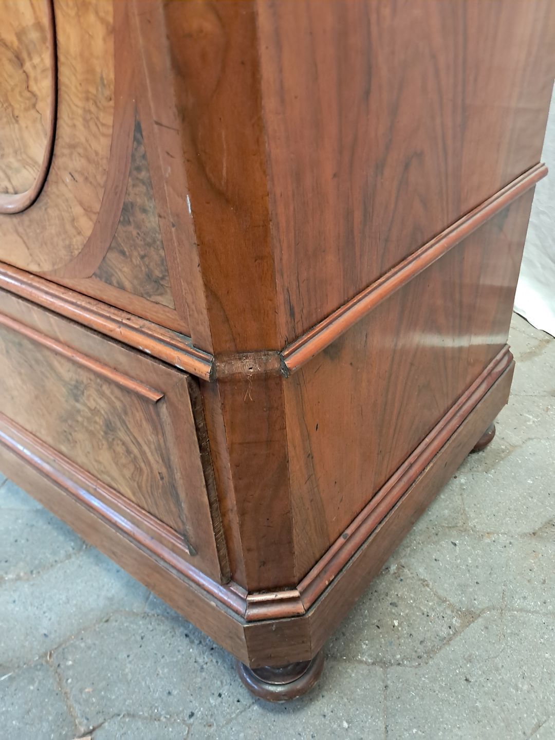 Skab i fineret mahogni, fra 1900erne. Det har brugsspor og mangler sidelister. Højde 145cm Bredde 101cm Dybde 50cm Emne nummer: 91740