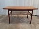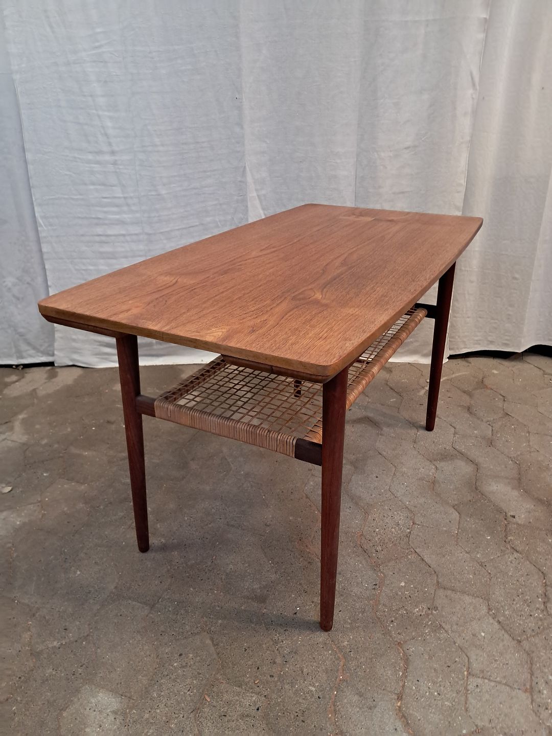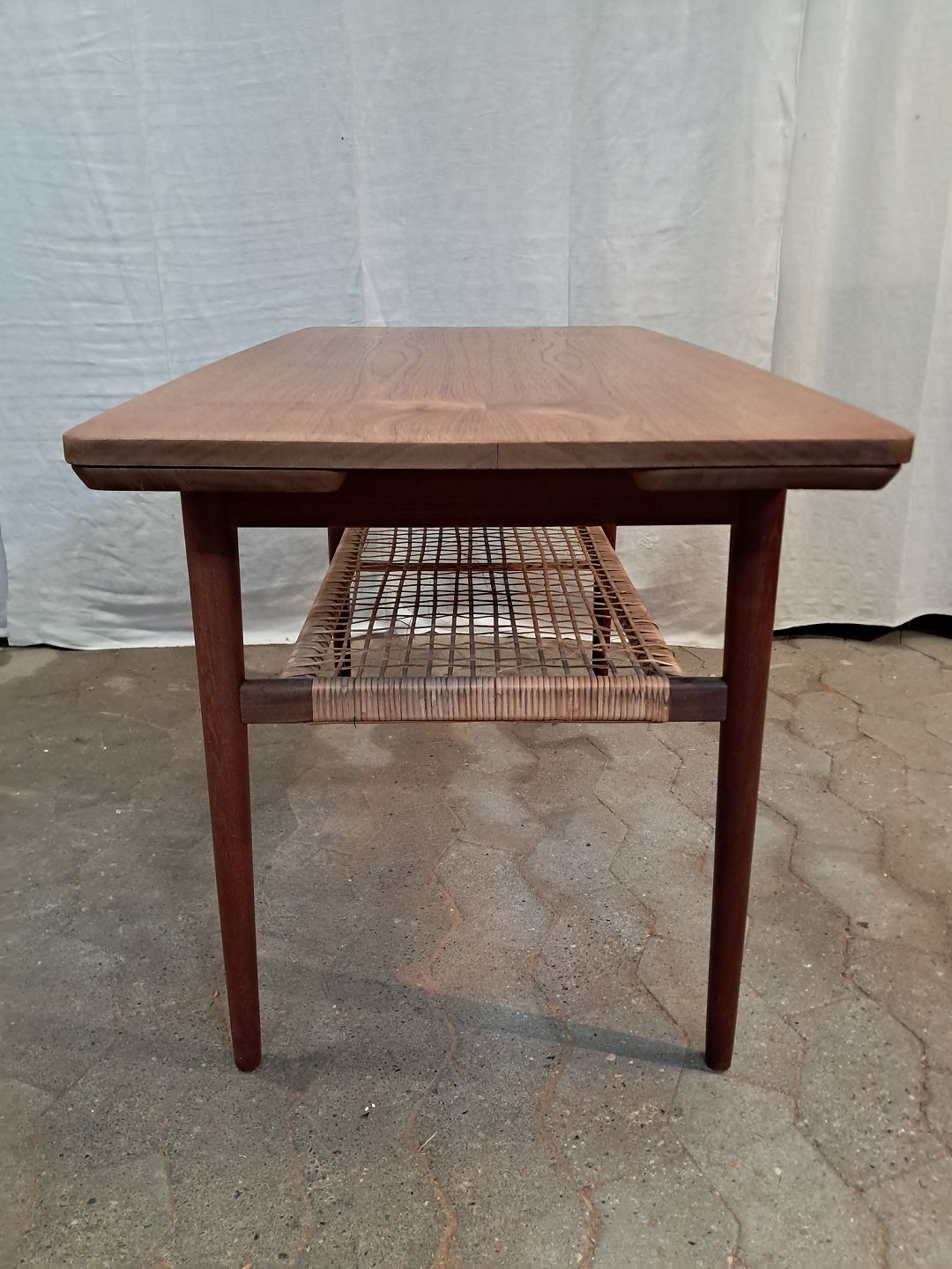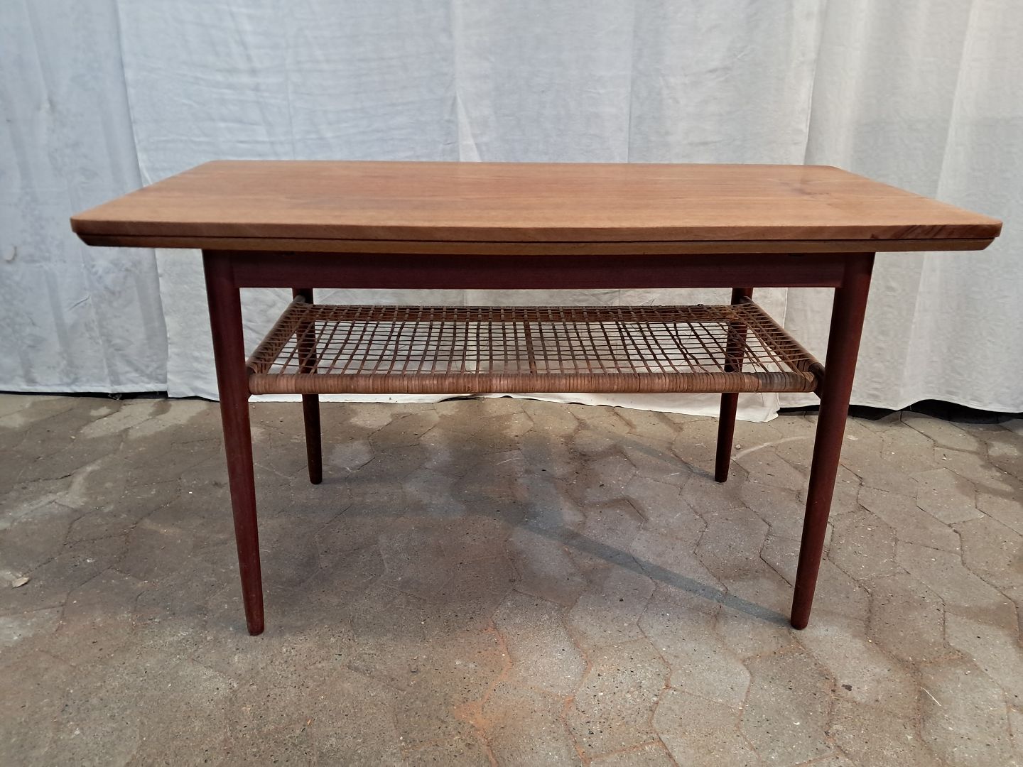 Sofabord i fineret teaktræ med hollandsk udtræk, fra 1960erne. Det har brugsspor og fletten på hylden er defekt. (se foto) Højde 60cm Længde 106cm Bredde 54cm Bredde med udtræk 89cm Emne nummer: 91761