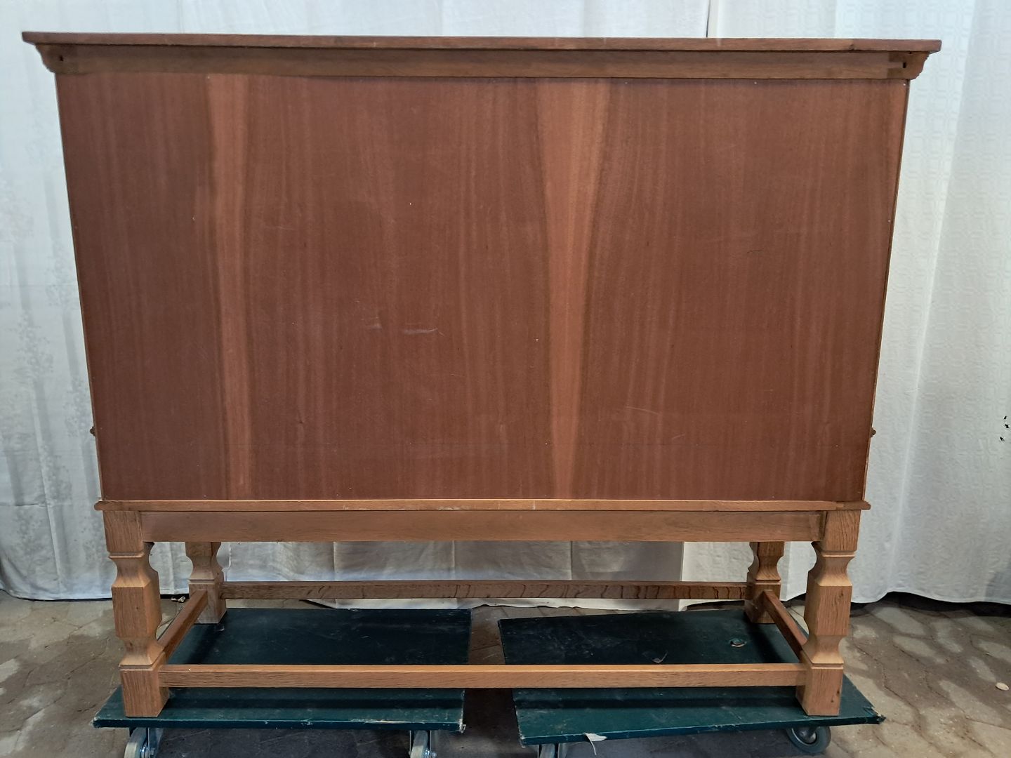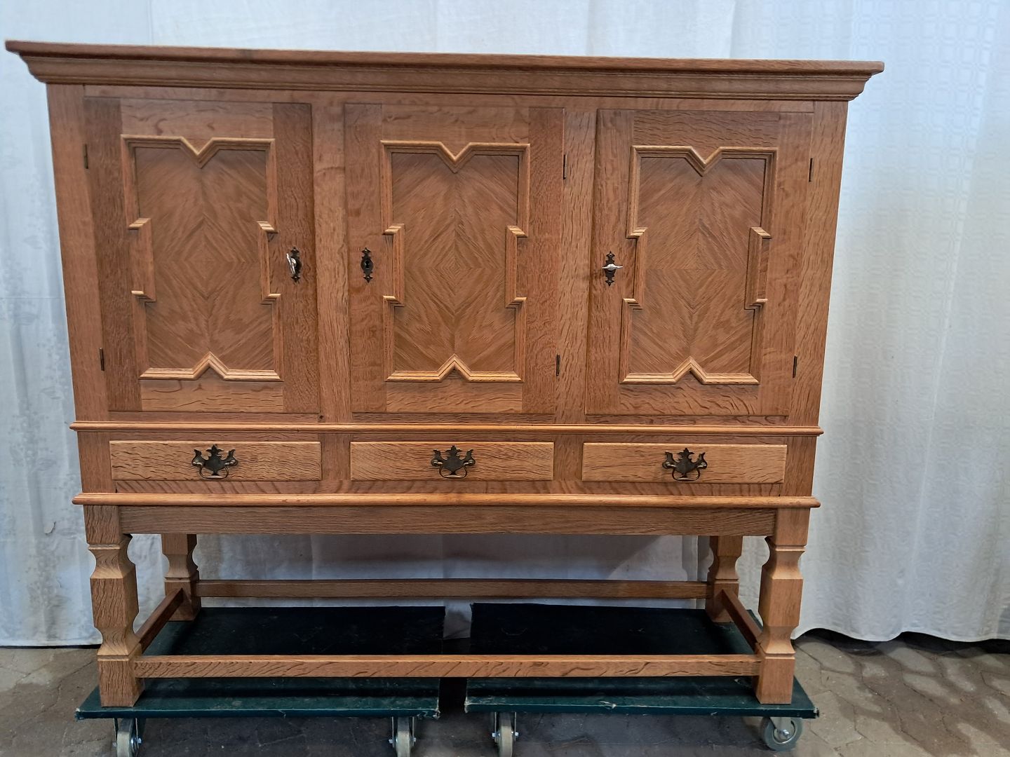 Skab i fineret og massivt egetræ, fra 1980erne. Det har brugsspor. Højde 131cm Bredde 155cm Dybde 48cm Emne nummer: 91770