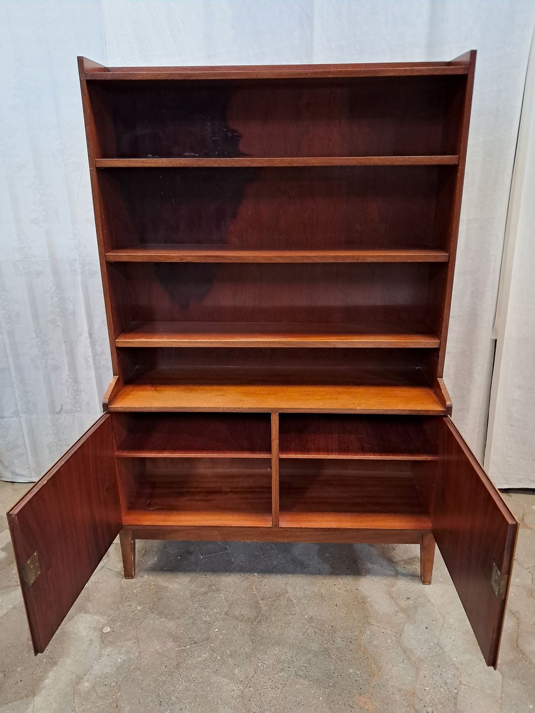 Reol i fineret nødetræ, fra 1950erne. Den har brugsspor og mangler et låsebeslag. (se foto) Højde 155cm Bredde 100cm Dybder 33cm og 21cm Emne nummer: 91772