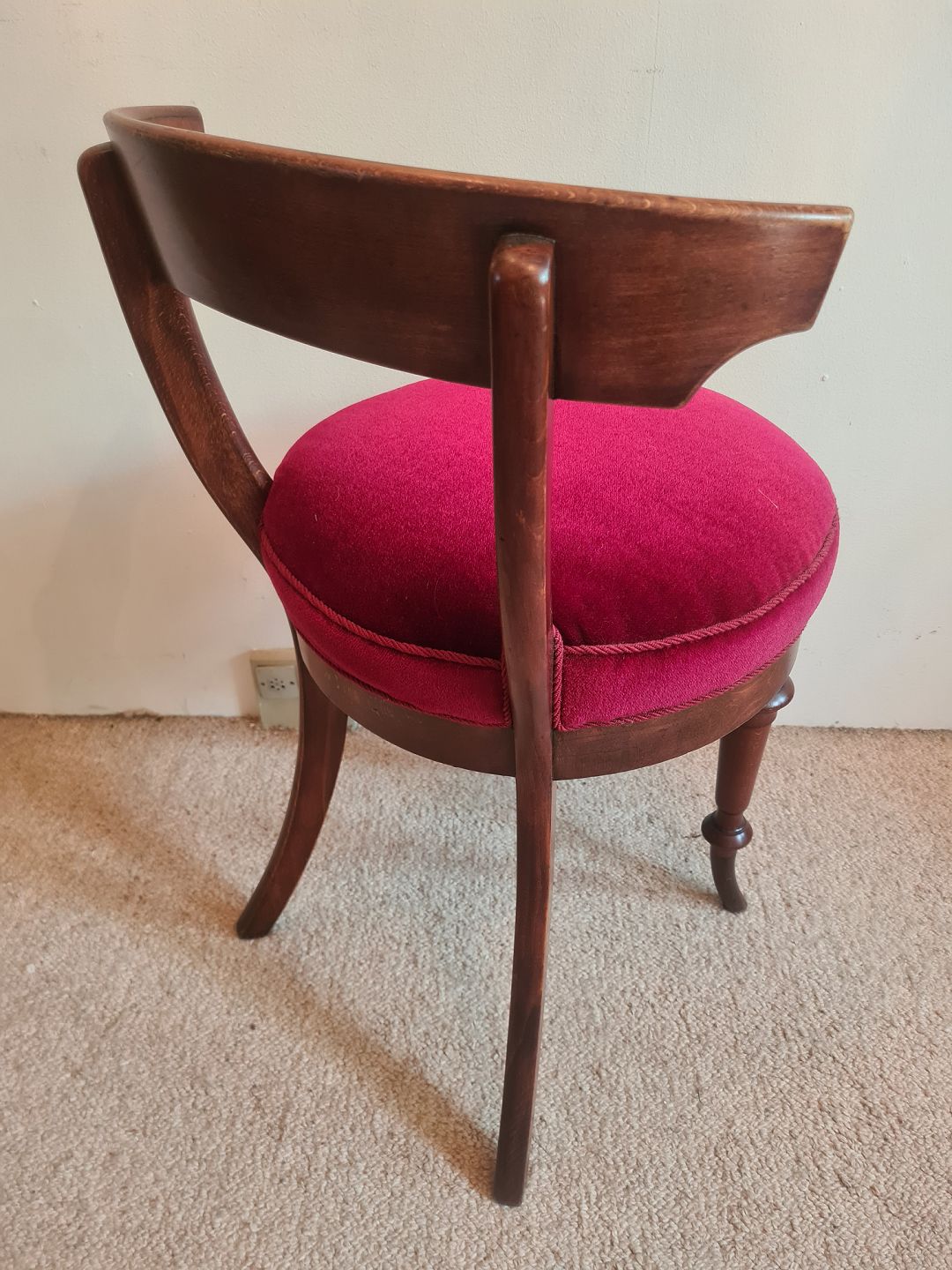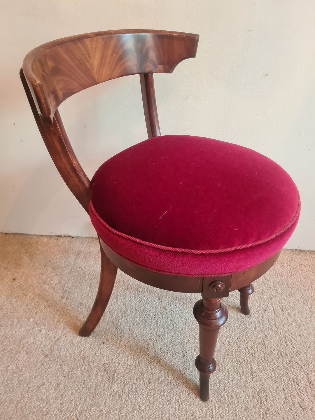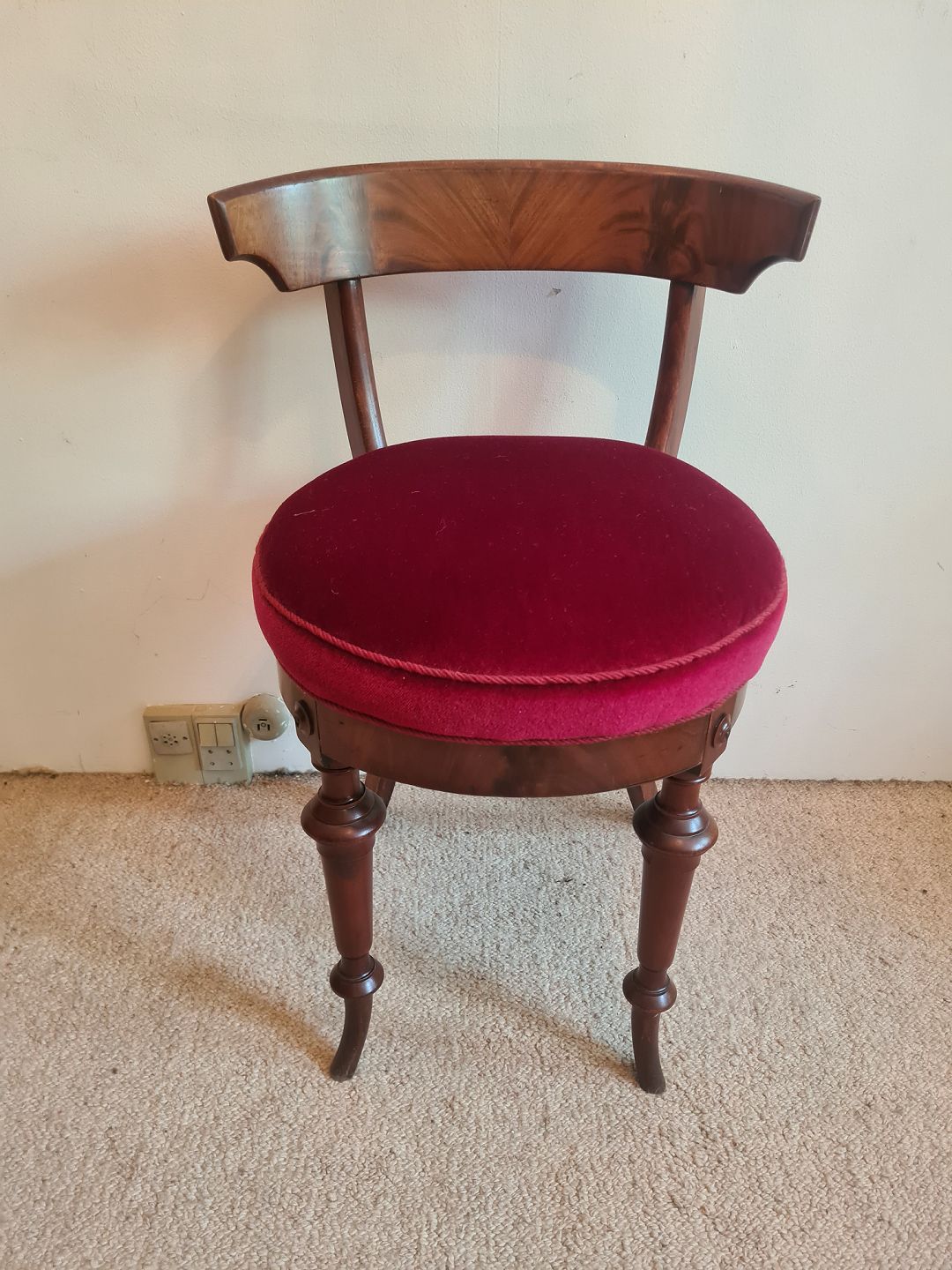 Pianostol fra 1930'erne i mahogni med sæde betrukket i rød velour. Fremstår pæn og velholdt uden nævneværdige brugsspor. Højde 76 cm. Bredde 44 cm. Dybde 48 cm. Sædehøjde 52 cm. Emne nummer: 80892