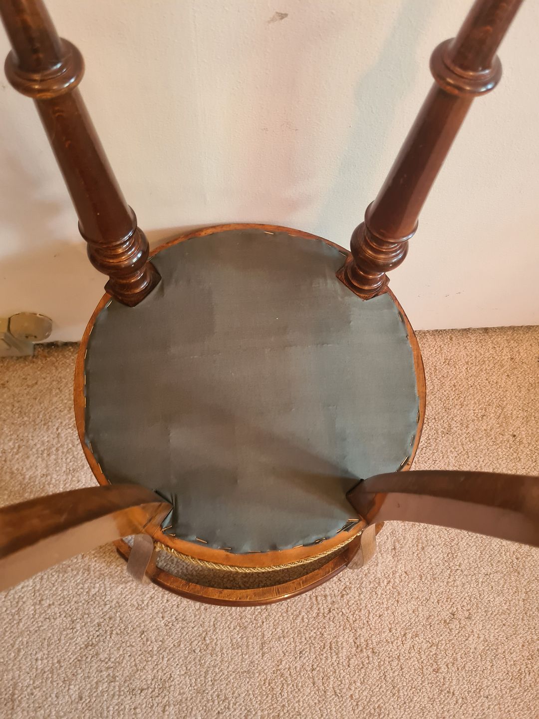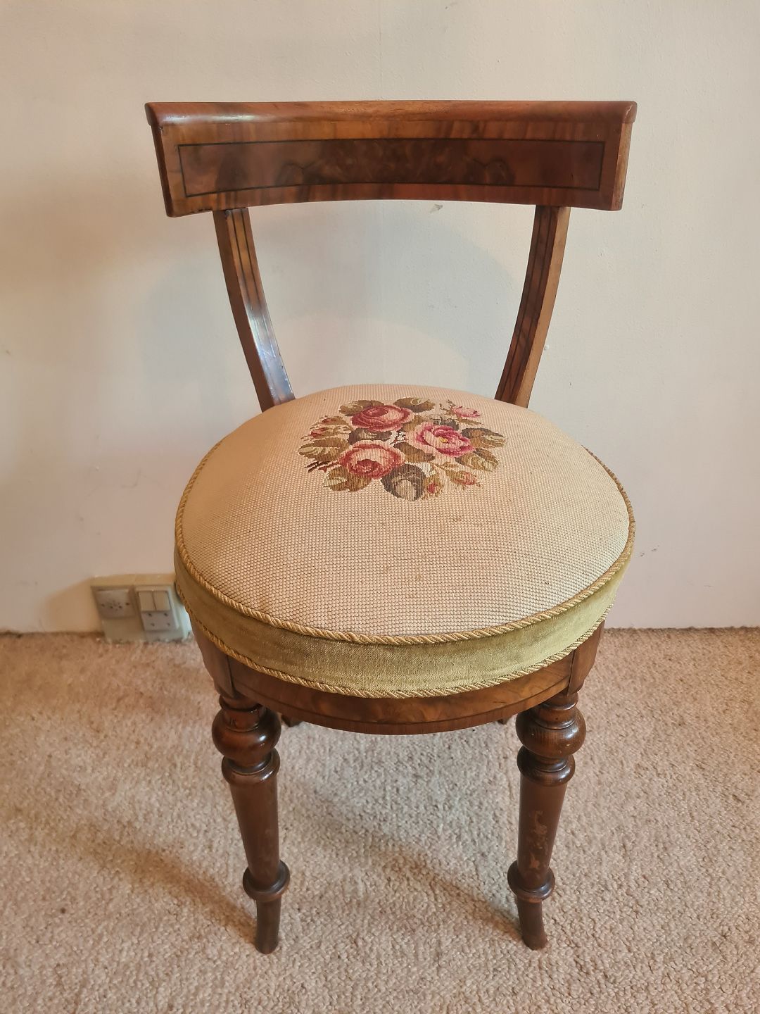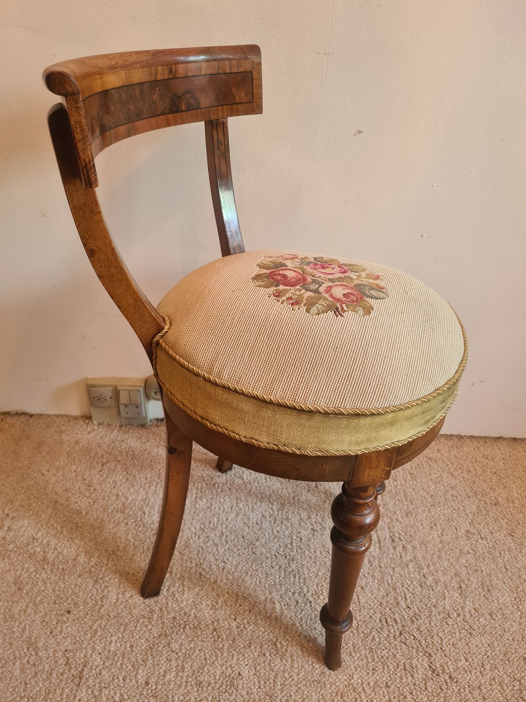 Pianostol fra 1930'erne I mahogni og fyr med broderet sæde. Fremstår pæn og velholdt uden nævneværdige brugsspor. Højde 76 cm. Bredde 40 cm. Dybde 46 cm. Sædehøjde 52 cm. Emne nummer: 80893