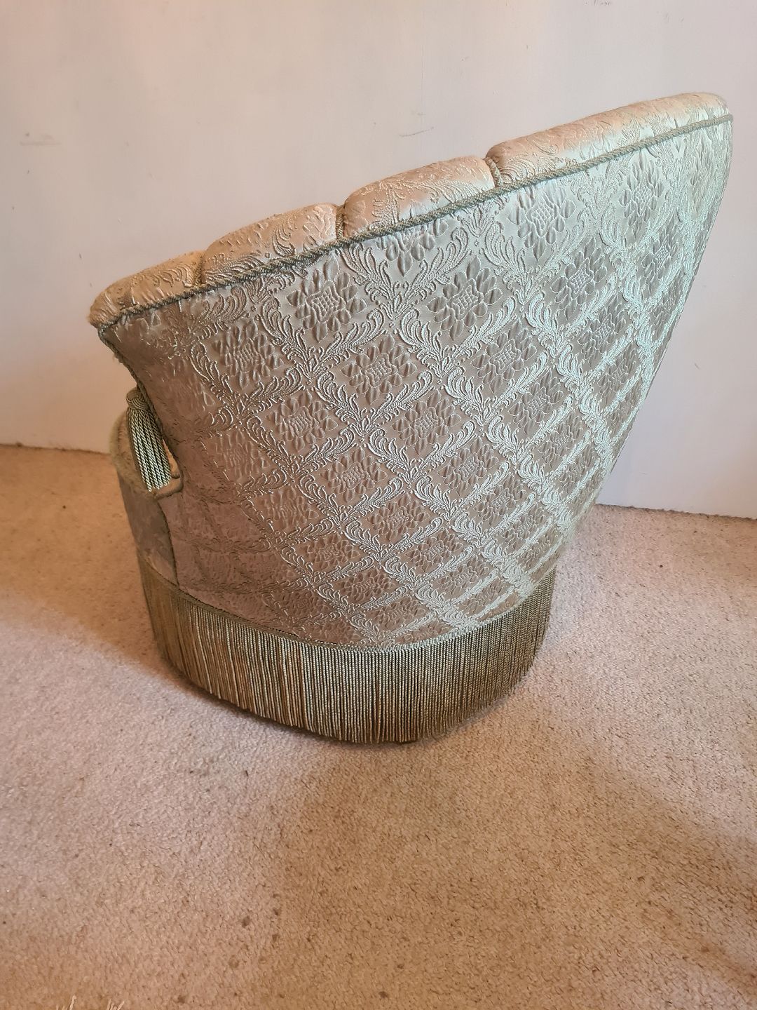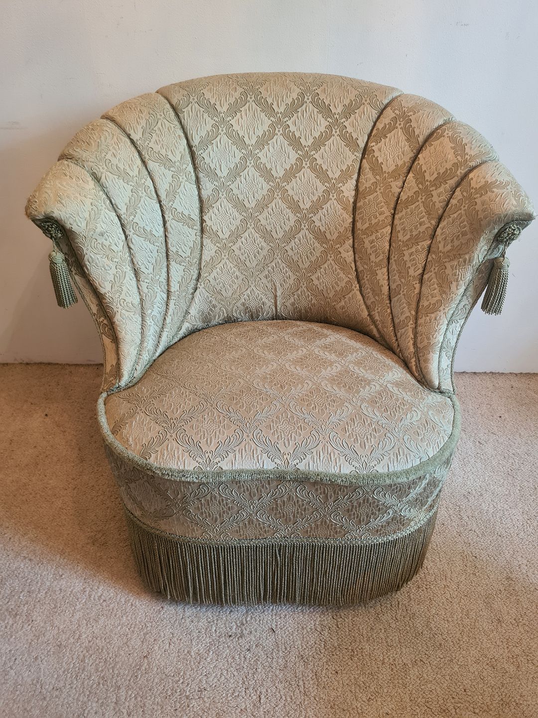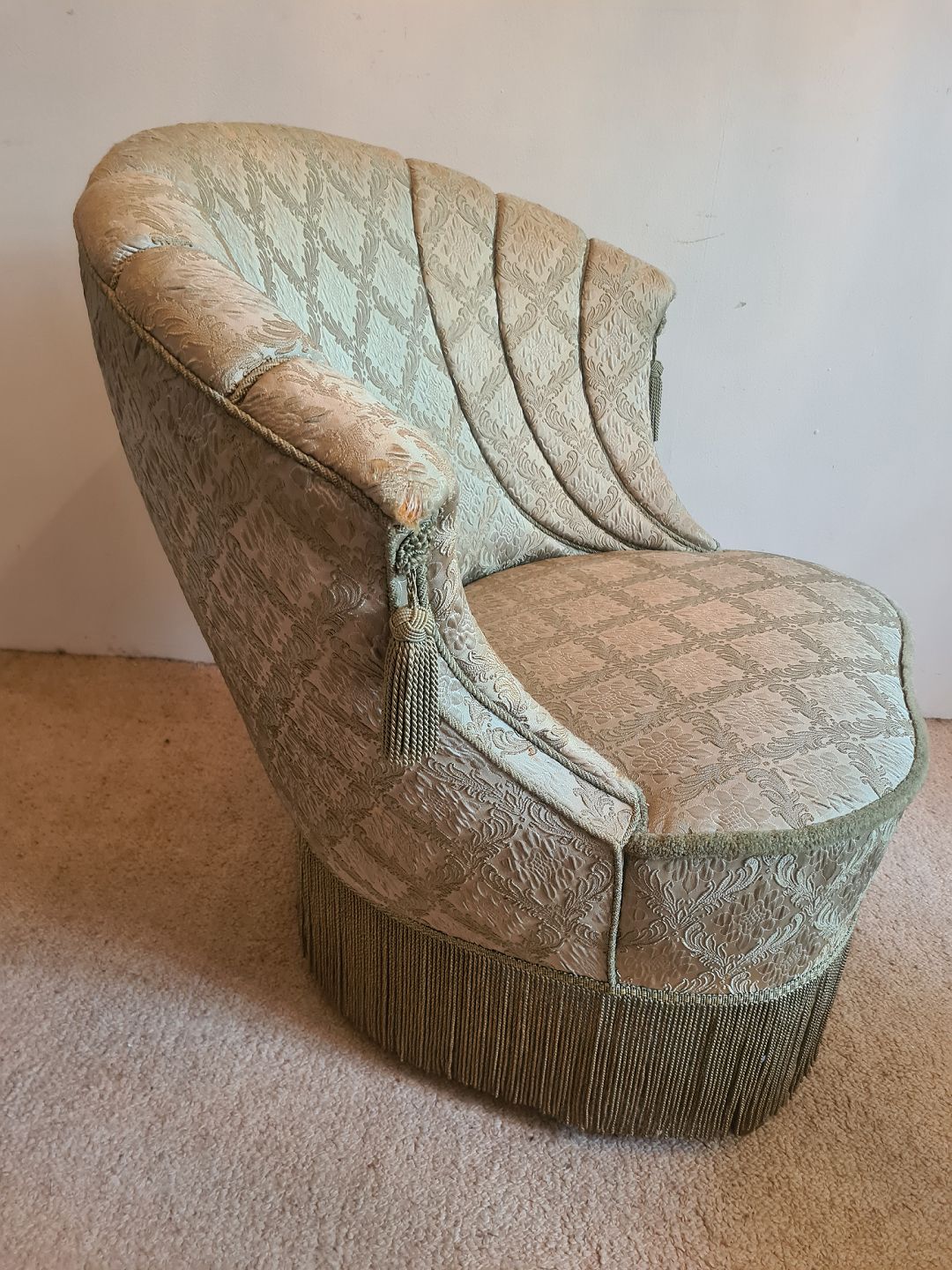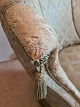 Overpolstret lænestol fra 1940'erne med flæser. Fremstår pæn, god og udmærket stabil, dog med tyndslidt polstring på det yderste af begge armlæn. (Billede)