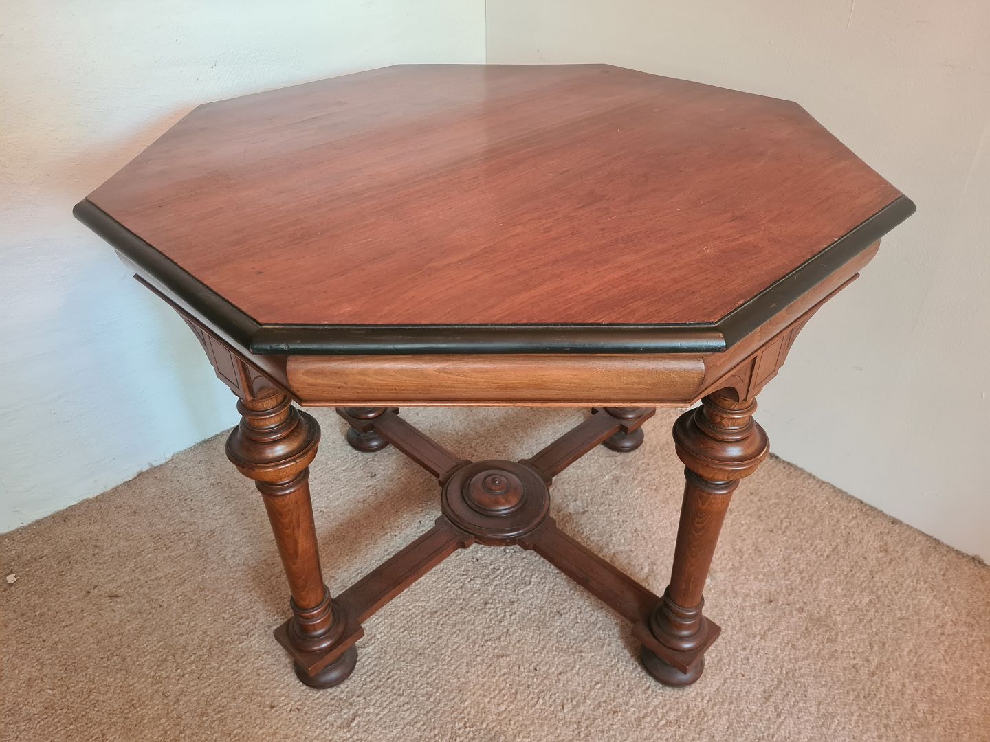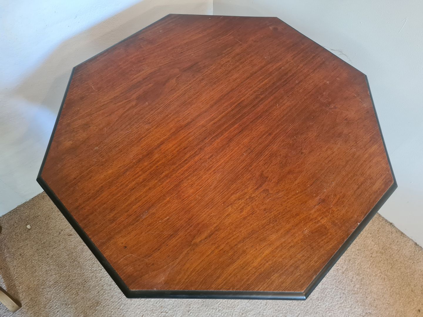 8 kantet salonbord fra 1940'erne i mahogni. Fremstår pænt og velholdt uden nævneværdige brugsspor. Højde 71 cm. Længde 90 cm. Bredde 88 cm. Emne nummer: 80896