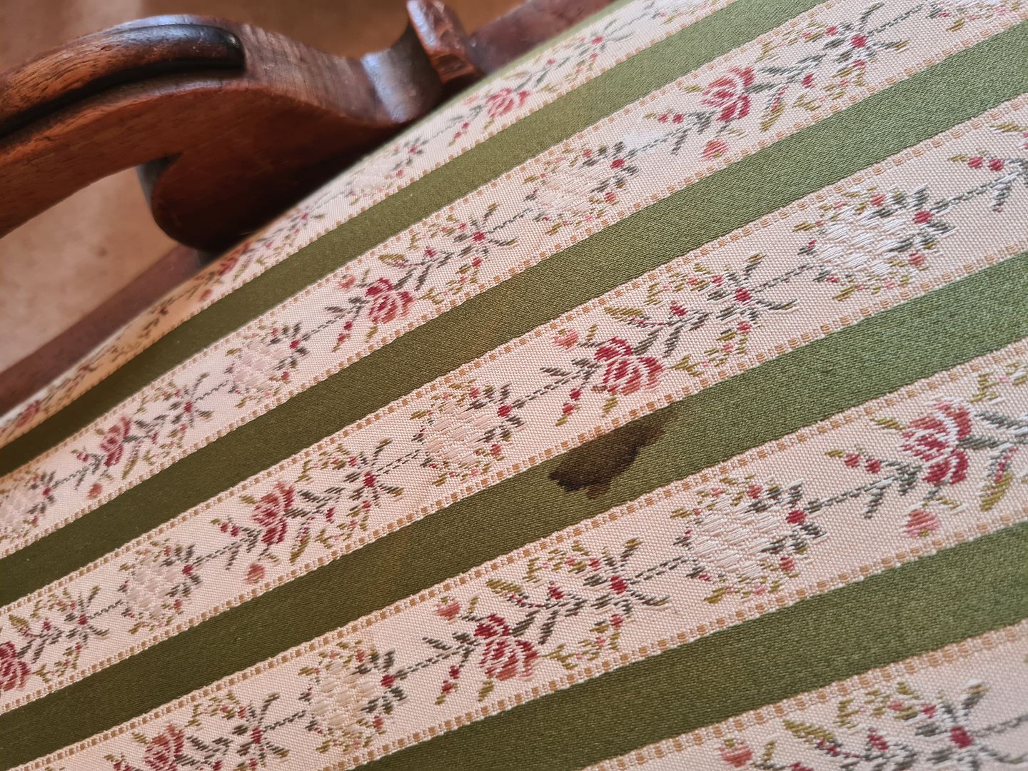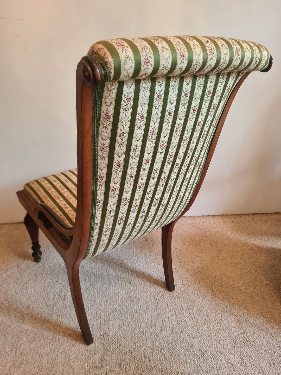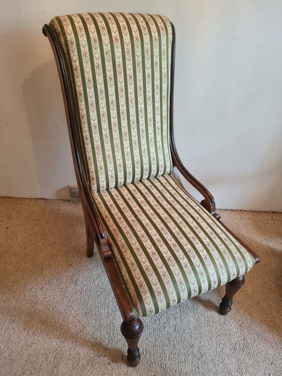 Flugtstol fra 1930'erne i mahogni. Fremstår pæn og velholdt uden de store brugsspor. Dog med en lille plet på sædet. (Billede) Højde 98 cm. Bredde 48 cm. Dybde 77 cm. Sædehøjde 42 cm. Emne nummer: 80897