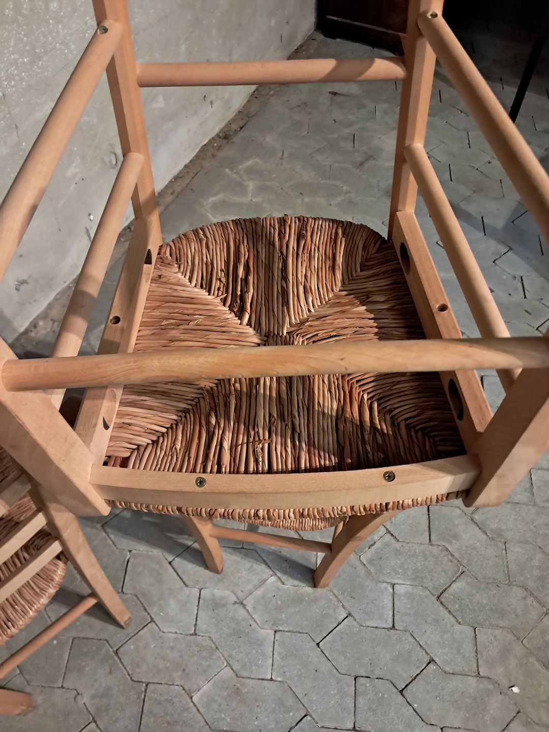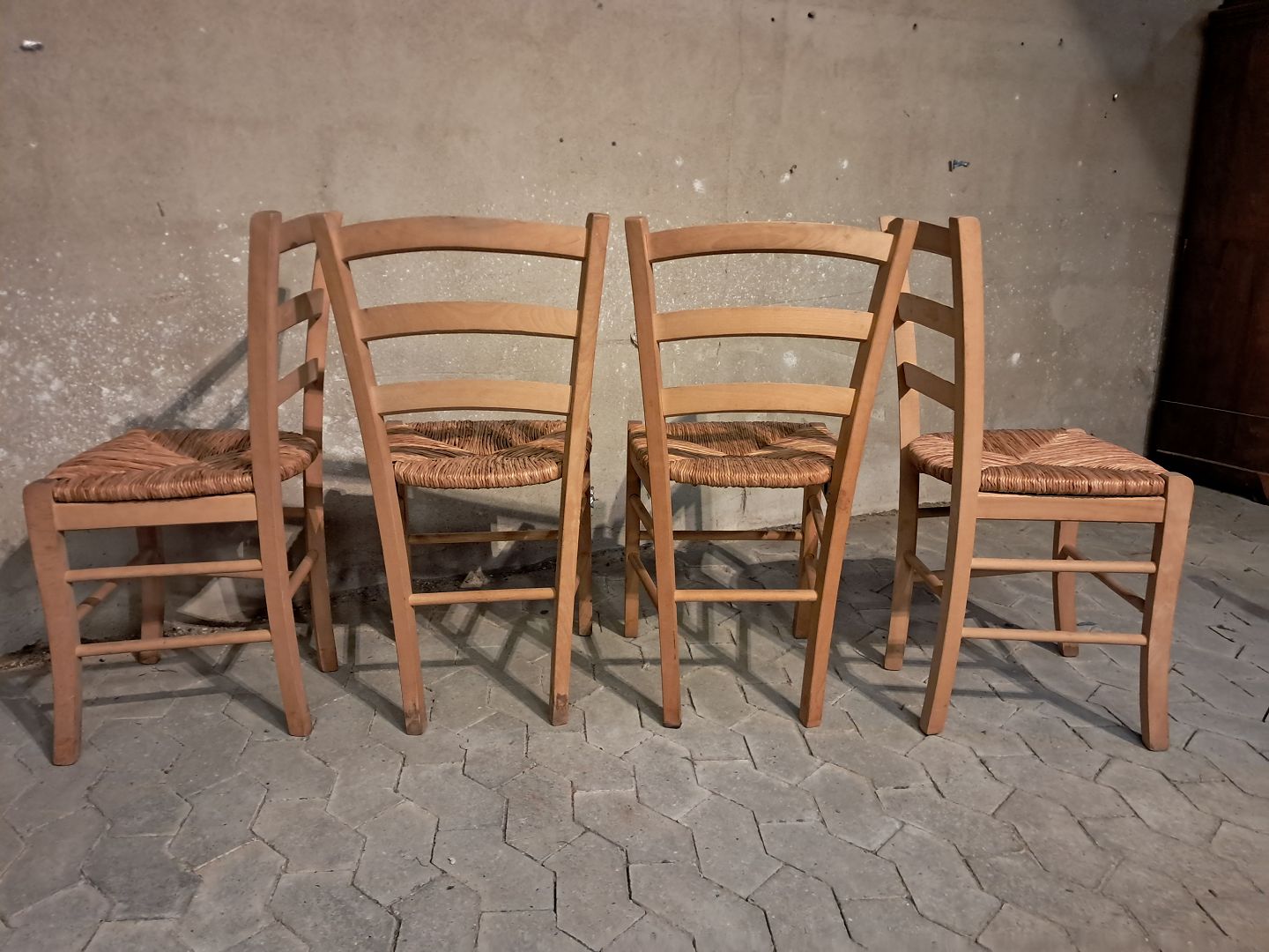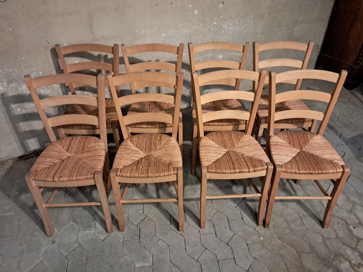 8 Stole i massivt bøgetræ med naturflet, af nyere dato. De har brugsspor. Ryghøjde 86cm Sædehøjde 47cm Emne nummer: 91805