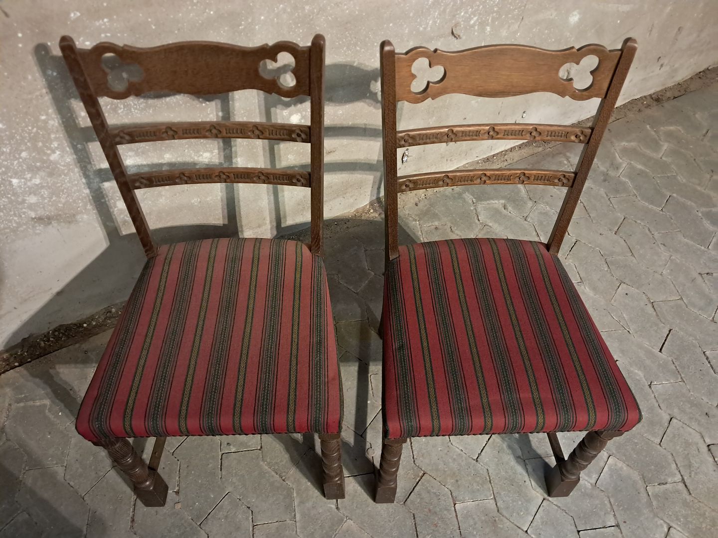 4 Stole i massivt egetræ, fra 1980erne. Betrækket er godt brugt. Ryghøjde 88cm Sædehøjde 45cm Emne nummer: 91806