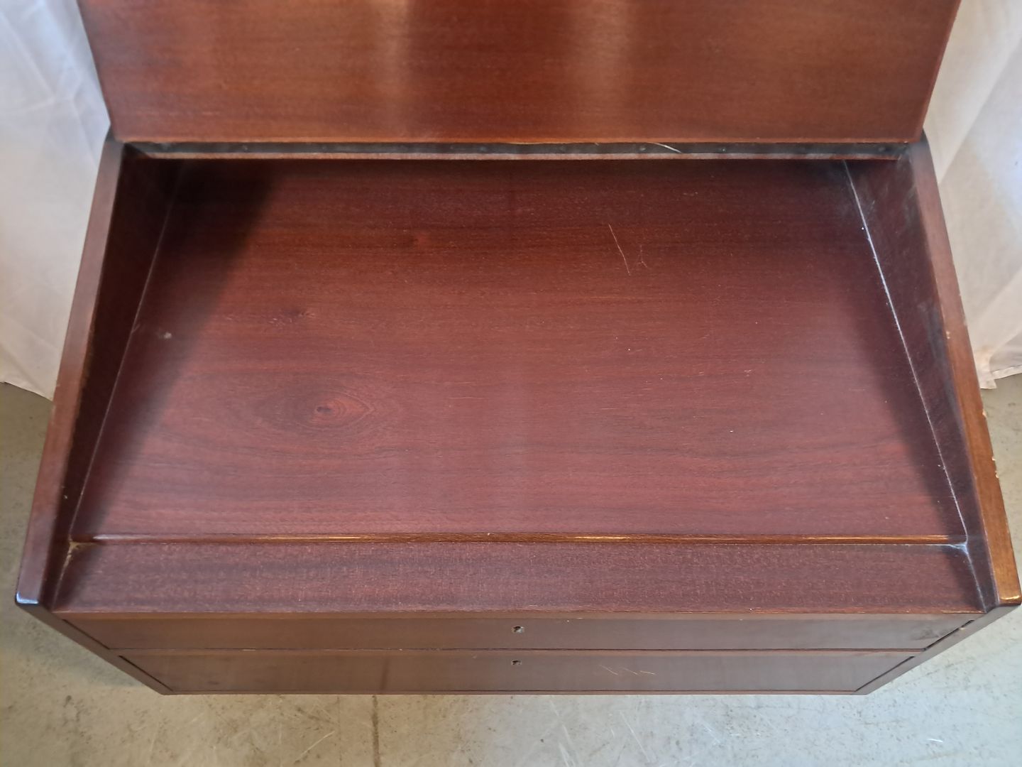 Skrivepult i fineret mahogni, fra 1950erne. Den har brugsspor. Højde 30cm Bredde 72cm Dybde 50cm Emne nummer: 76885