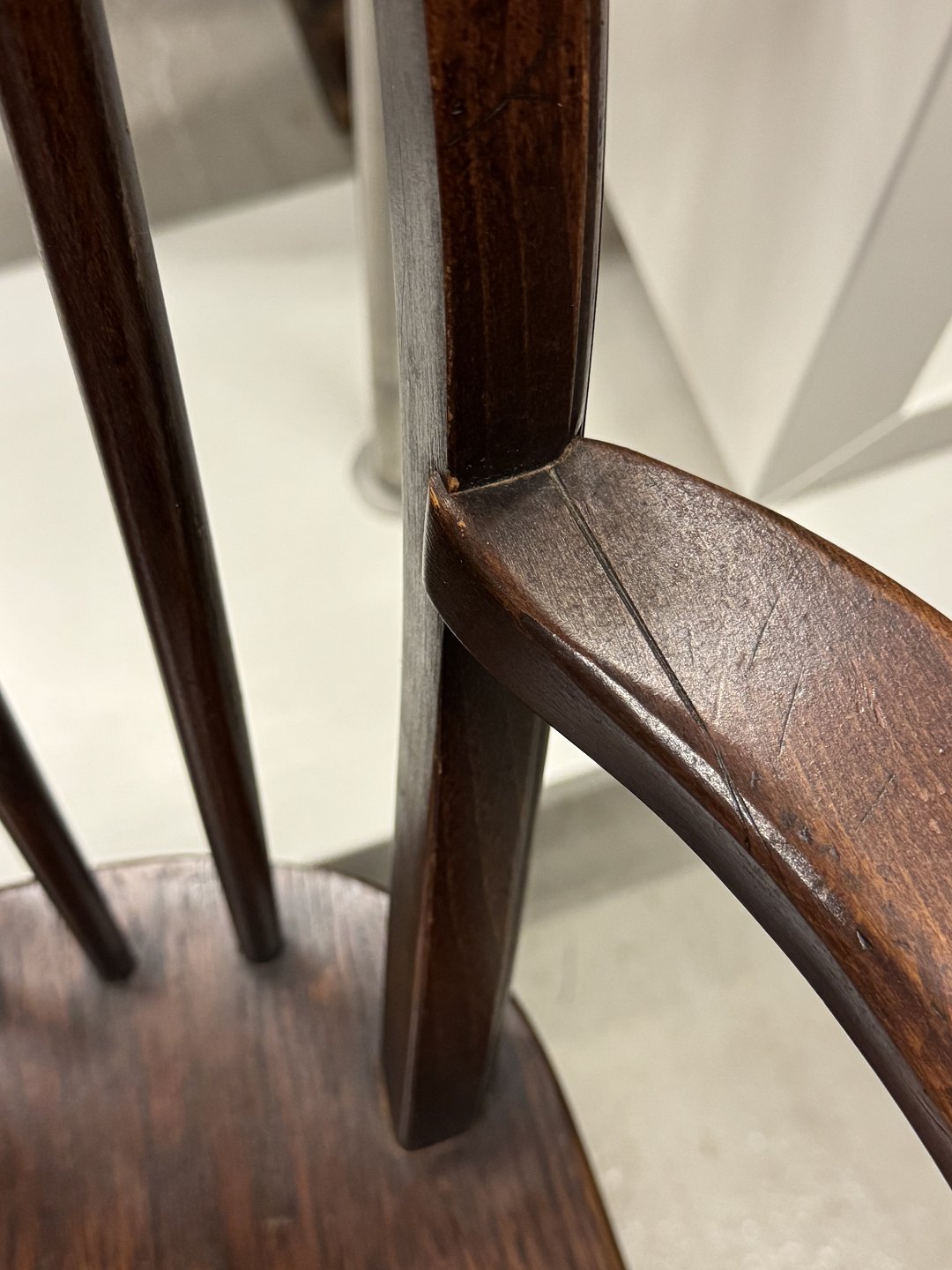 Armstol i massivt egetræ, fra 1950erne. Den har små brugsspor. Ryghøjde 95cm Sædehøjde 46cm Venstre armlæn lettere ledløst samt tør revne. Se foto Emne nummer: 76896