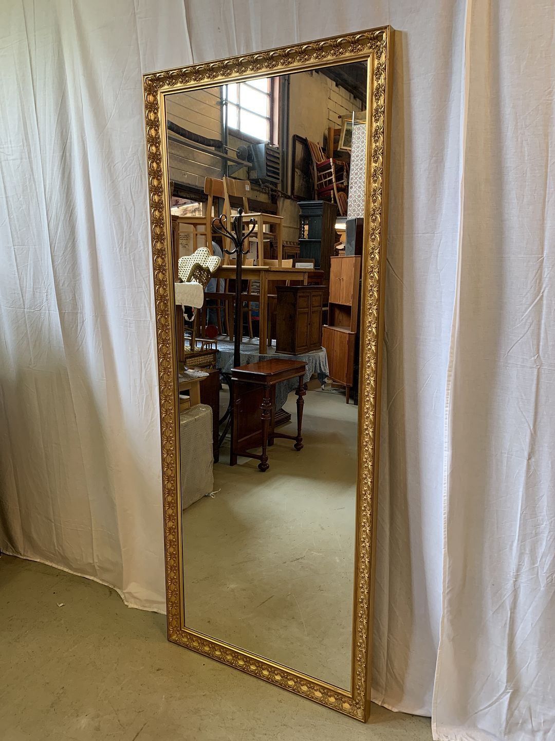 Stort spejl med guldmalet ramme, fra 2000erne. Det har små brugsspor. Højde 204cm Bredde 80cm Dybde 4cm Emne nummer: 76907