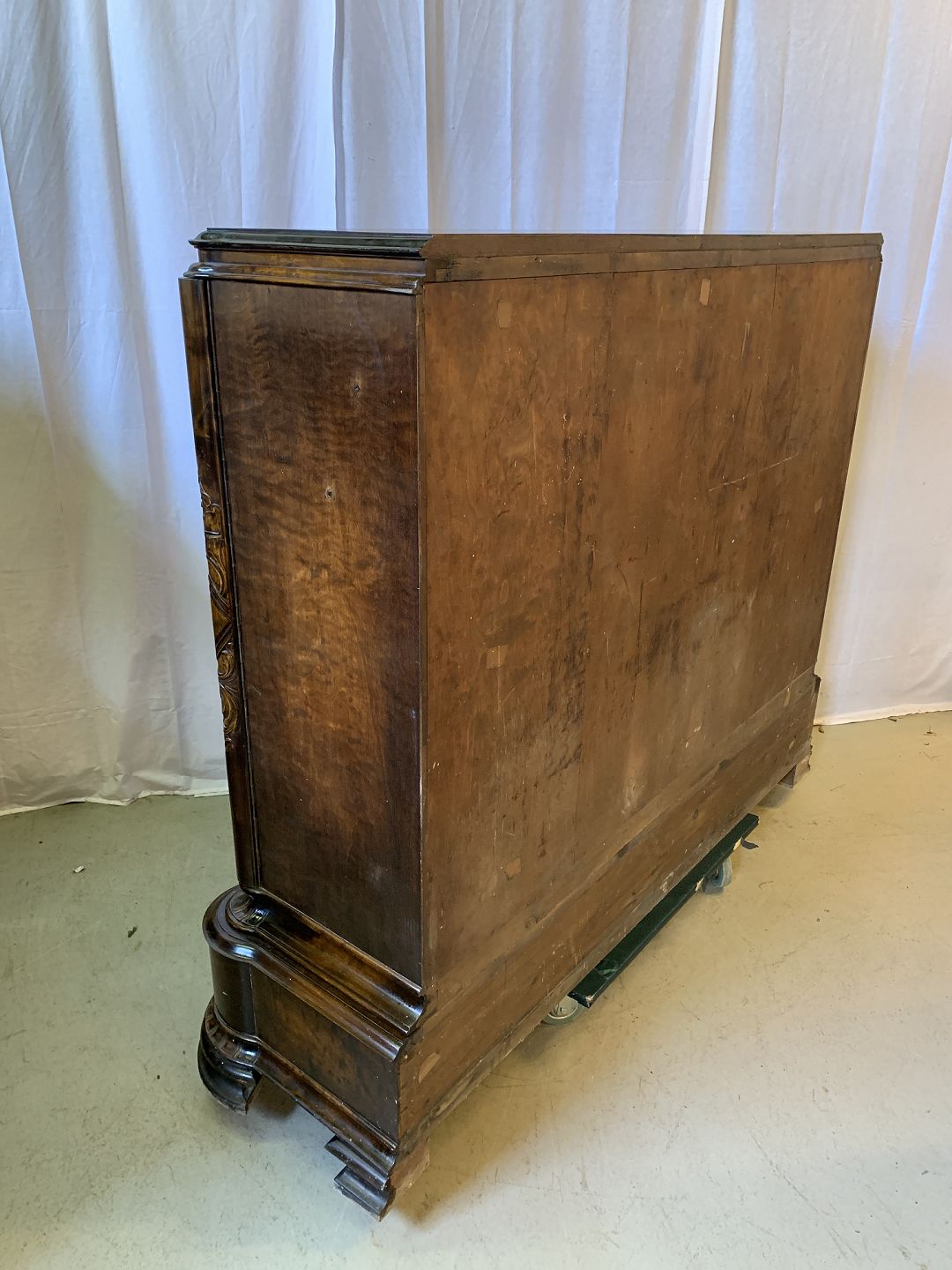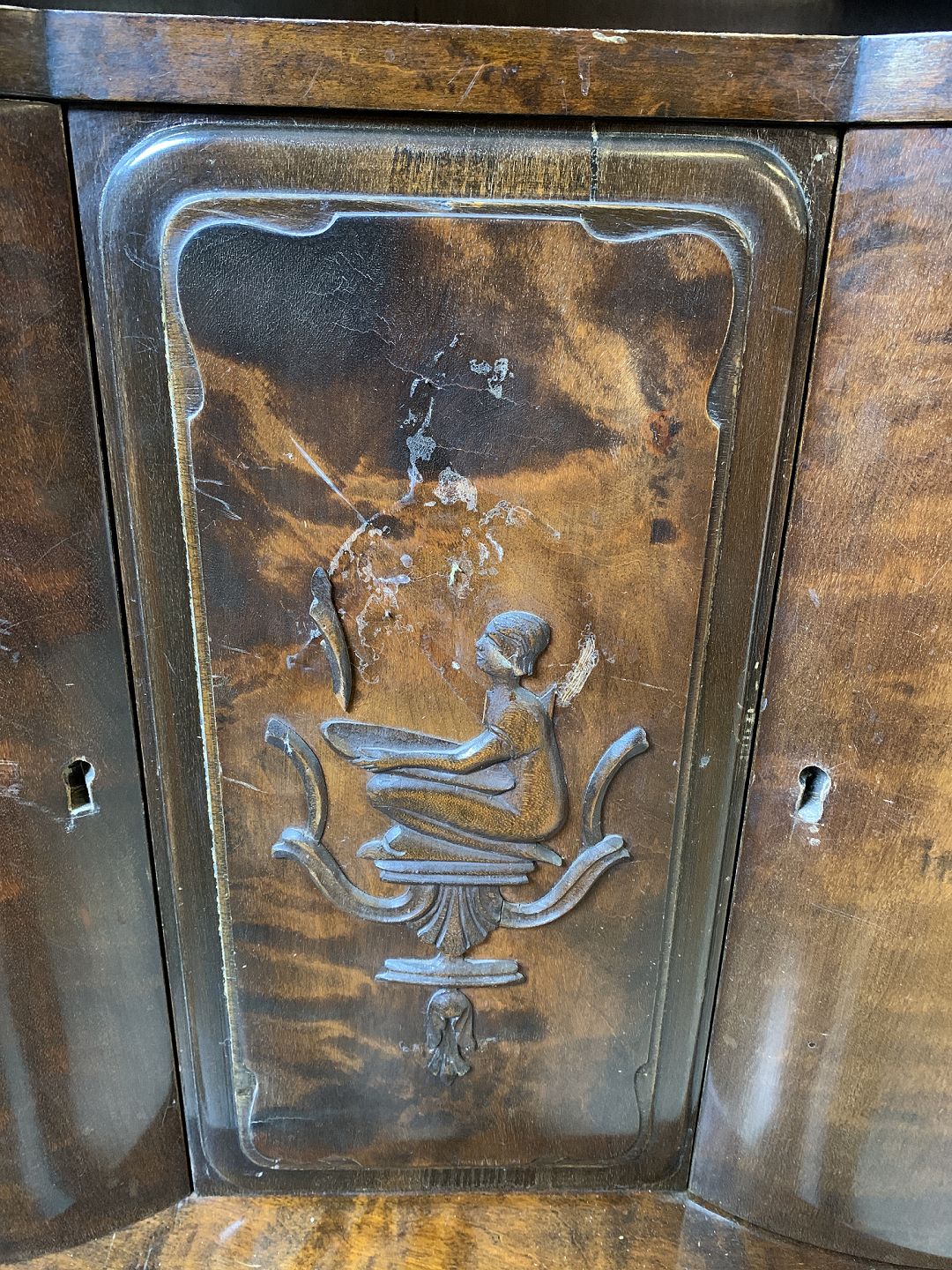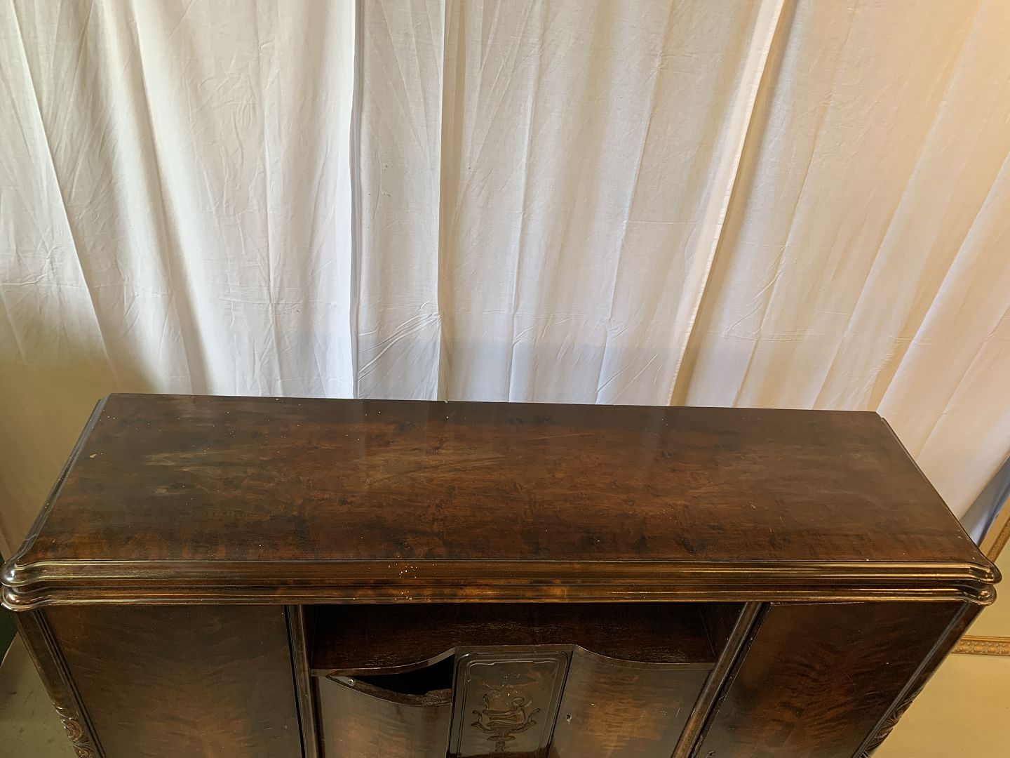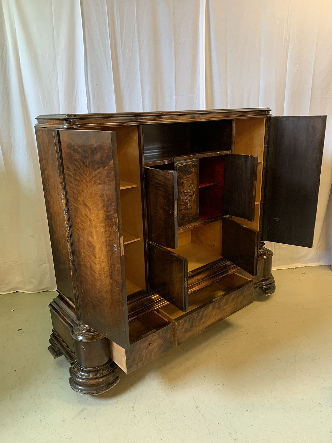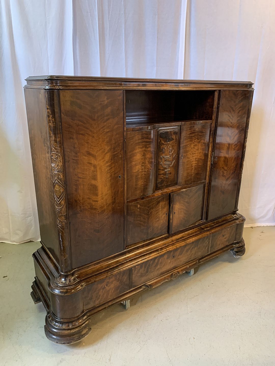 Dækketøjsskab i fineret birketræ, fra 1930erne. Det har brugsspor og defekter. Højde 144cm Bredde 165cm Dybde 50cm Emne nummer: 76910