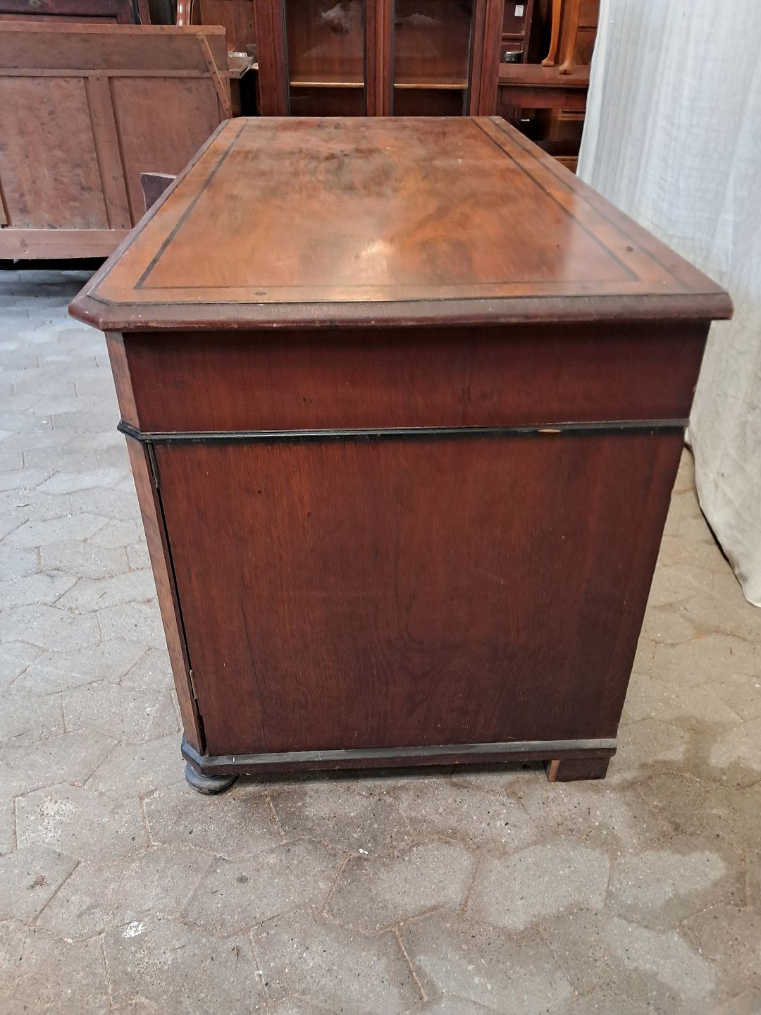 Skrivebord i fineret mahogni og rodtræ, fra 1900erne. Det har brugsspor og mangler en hjørneliste. (se foto) Højde 77cm Bredde 142cm Dybde 68cm Højde fra gulv til underkant 61cm Emne nummer: 91839