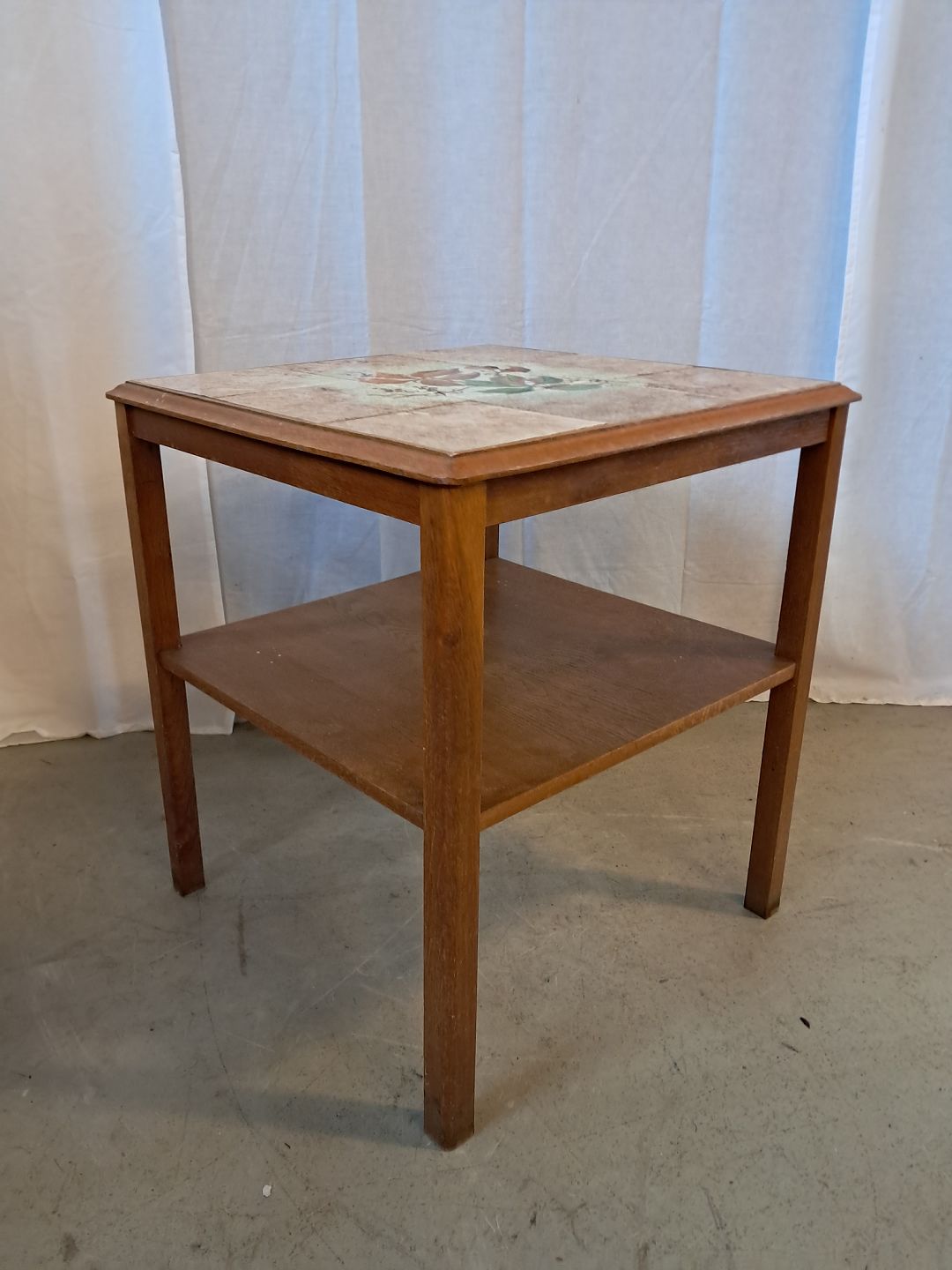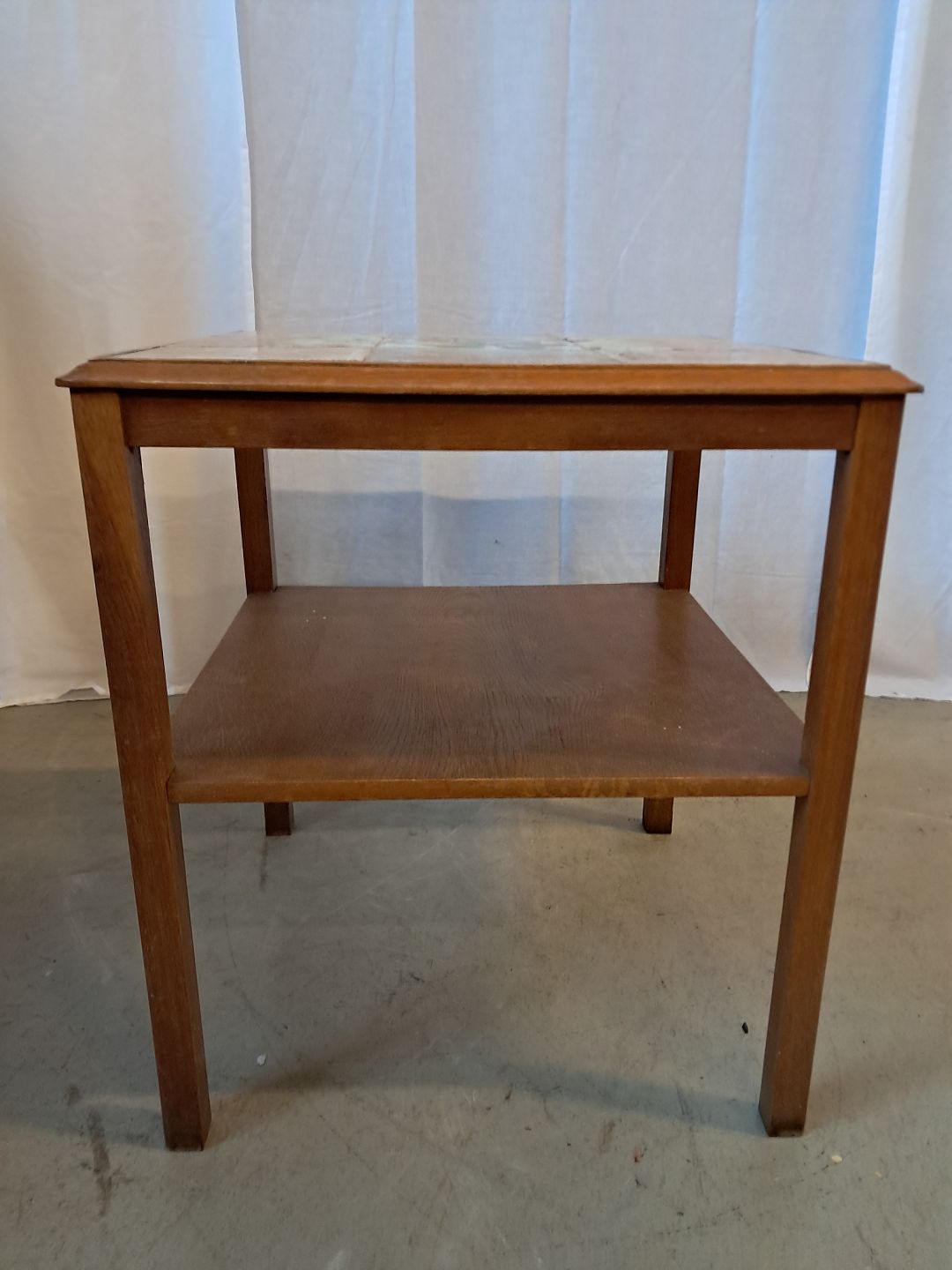 Sidebord i massivt egetræ med kakler, fra 1940erne. Det har brugsspor. Højde 57cm Bredde 49cm Længde 49cm Emne nummer: 76925