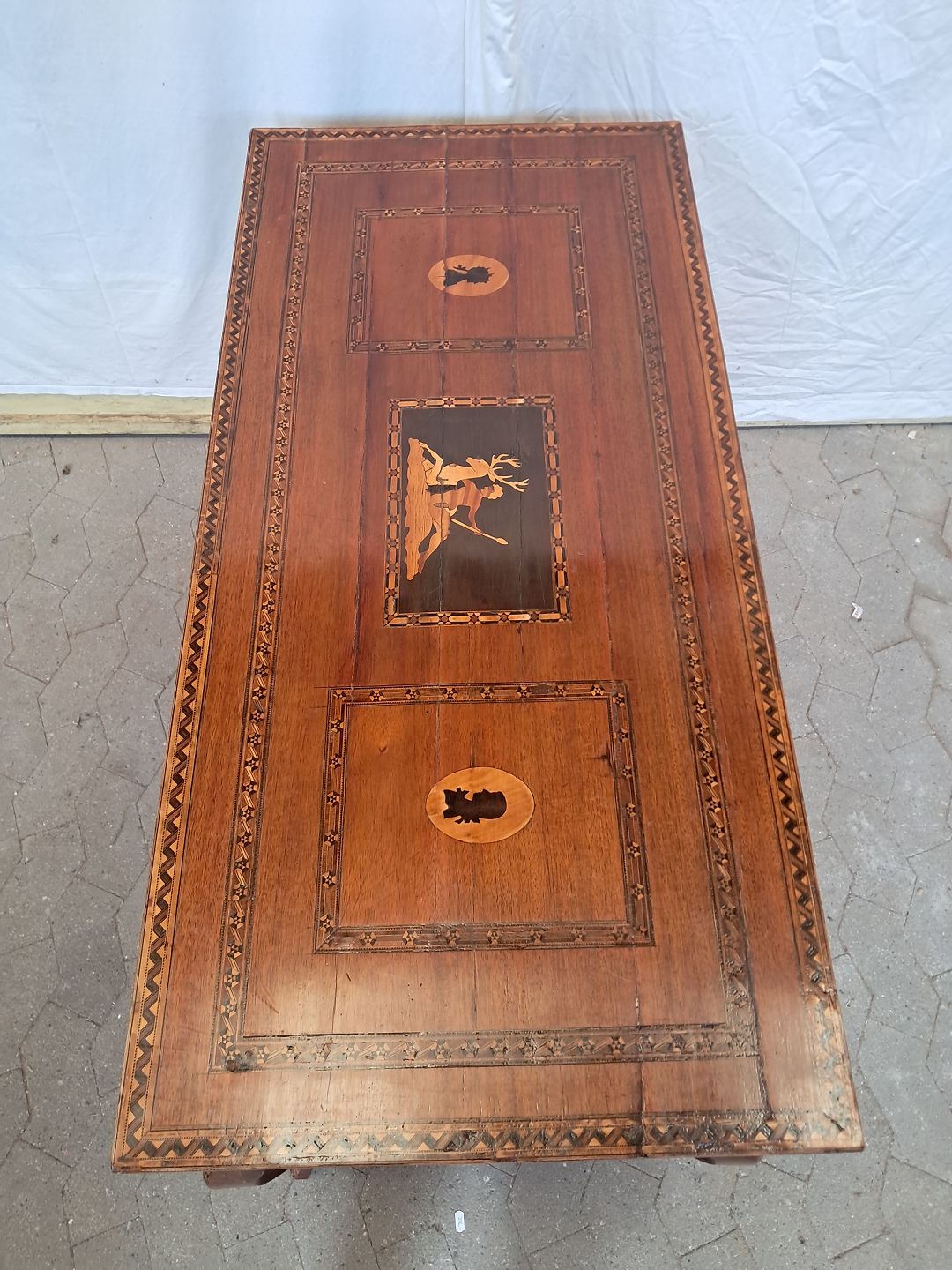 Skrivebord i fineret mahogni og nødetræ, fra 1930erne. Det har brugsspor. Højde 77cm Bredde 122cm Dybde 57cm Højde fra gulv til underkant 62cm Emne nummer: 91888