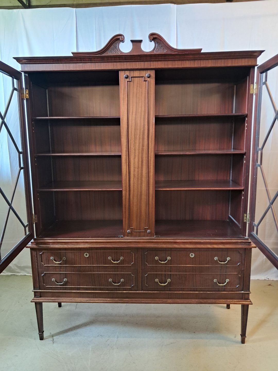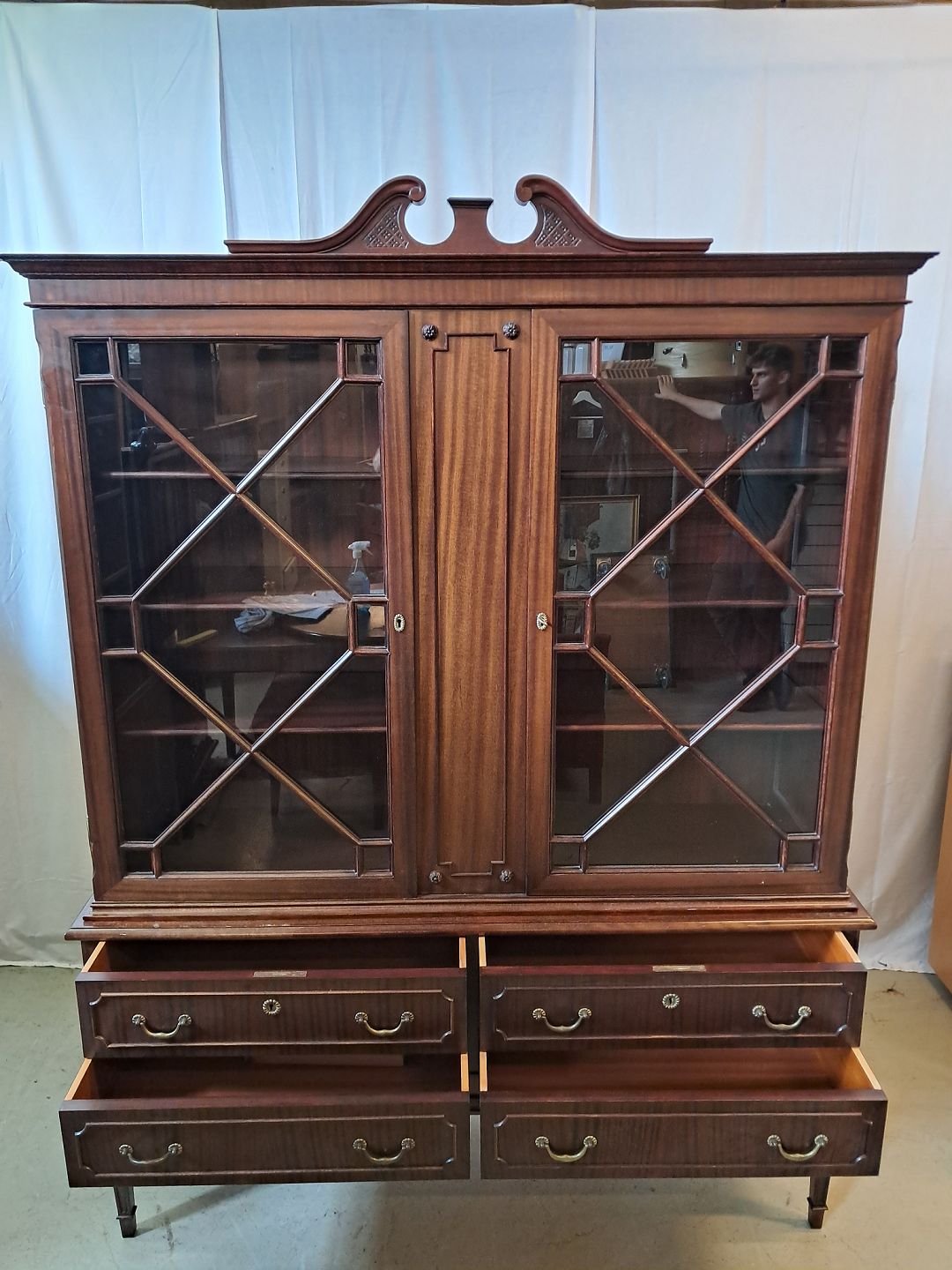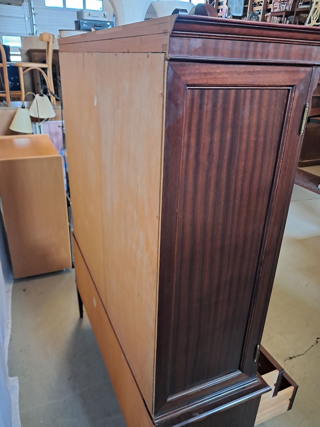 Dækketøjsskab i fineret mahogni, fra 1980erne. Det har brugsspor. Højde 194cm Bredde 145cm Dybde 45cm Emne nummer: 77016