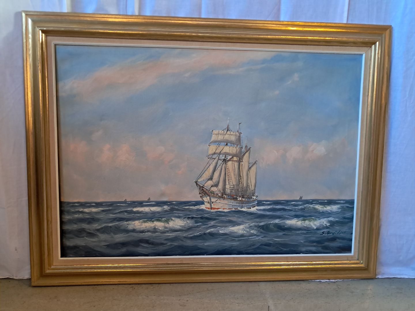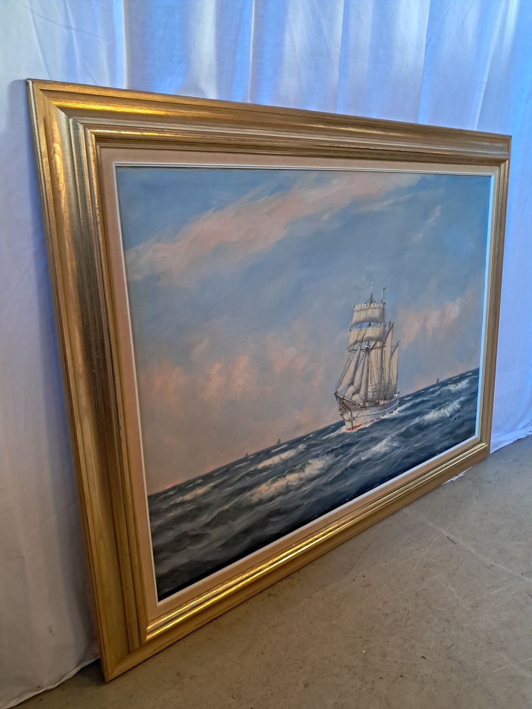 Maleri i guldmalet ramme, fra 1950erne. Det har brugsspor. Højde 86cm Bredde 116cm Emne nummer: 77029