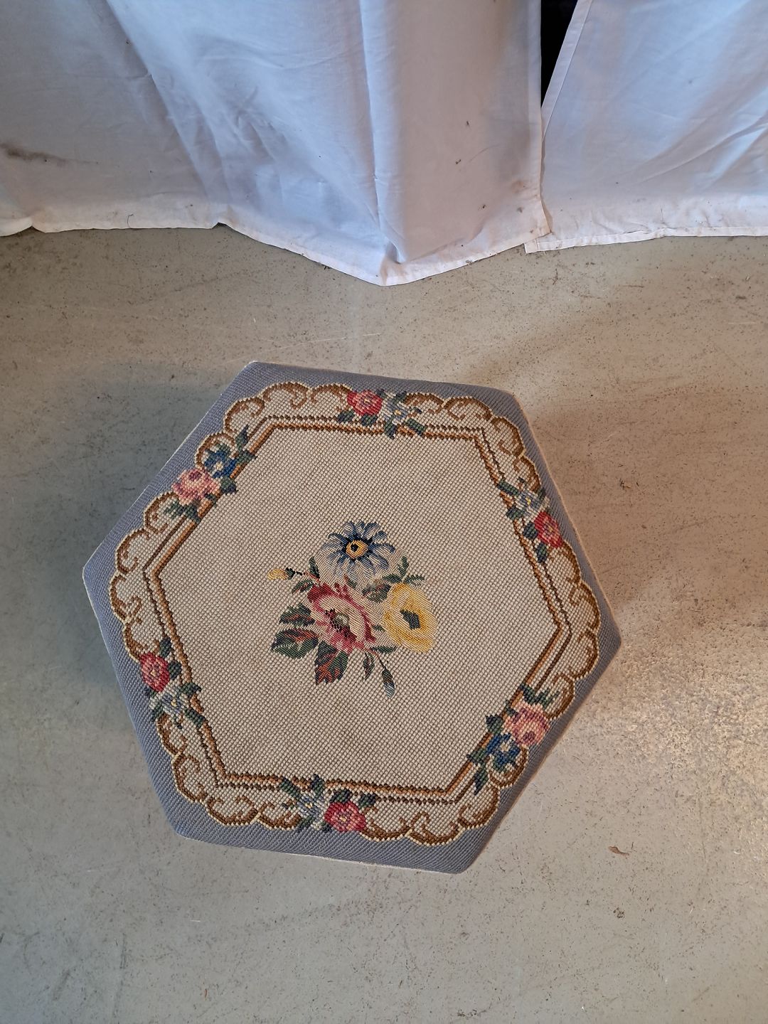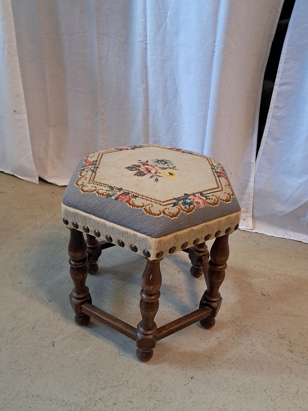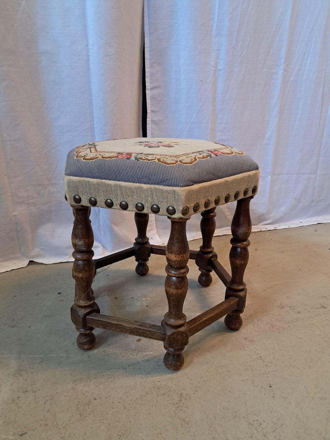 Skammel i bøgetræ med broderet betræk, fra 1950erne. Den har brugsspor. Højde 39cm Diameter 41cm Emne nummer: 77084