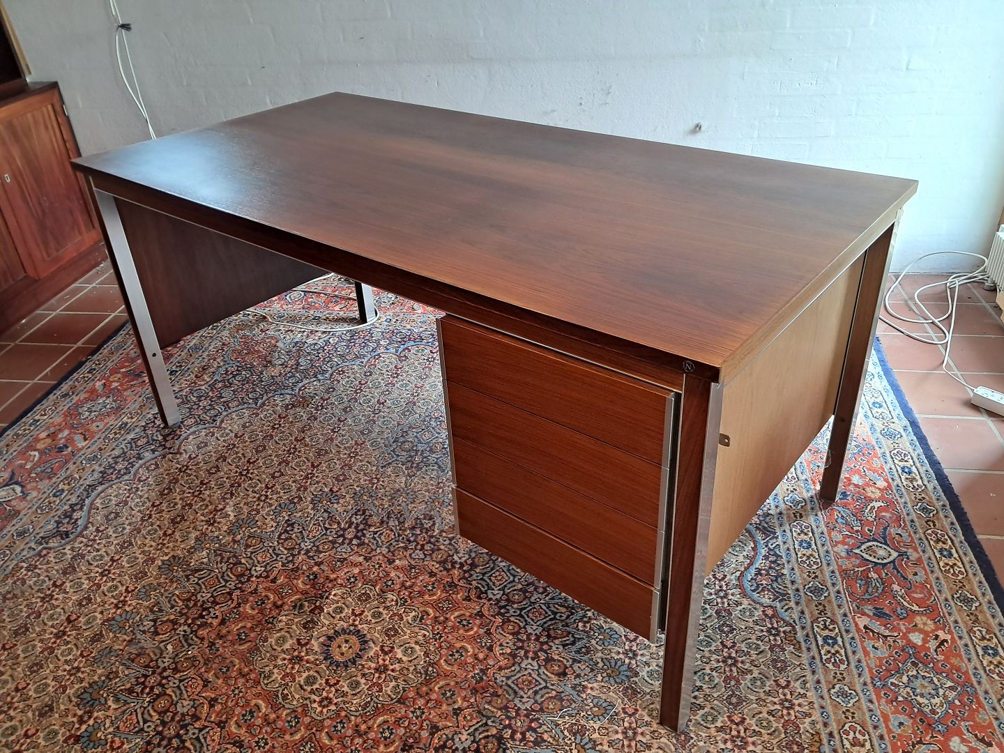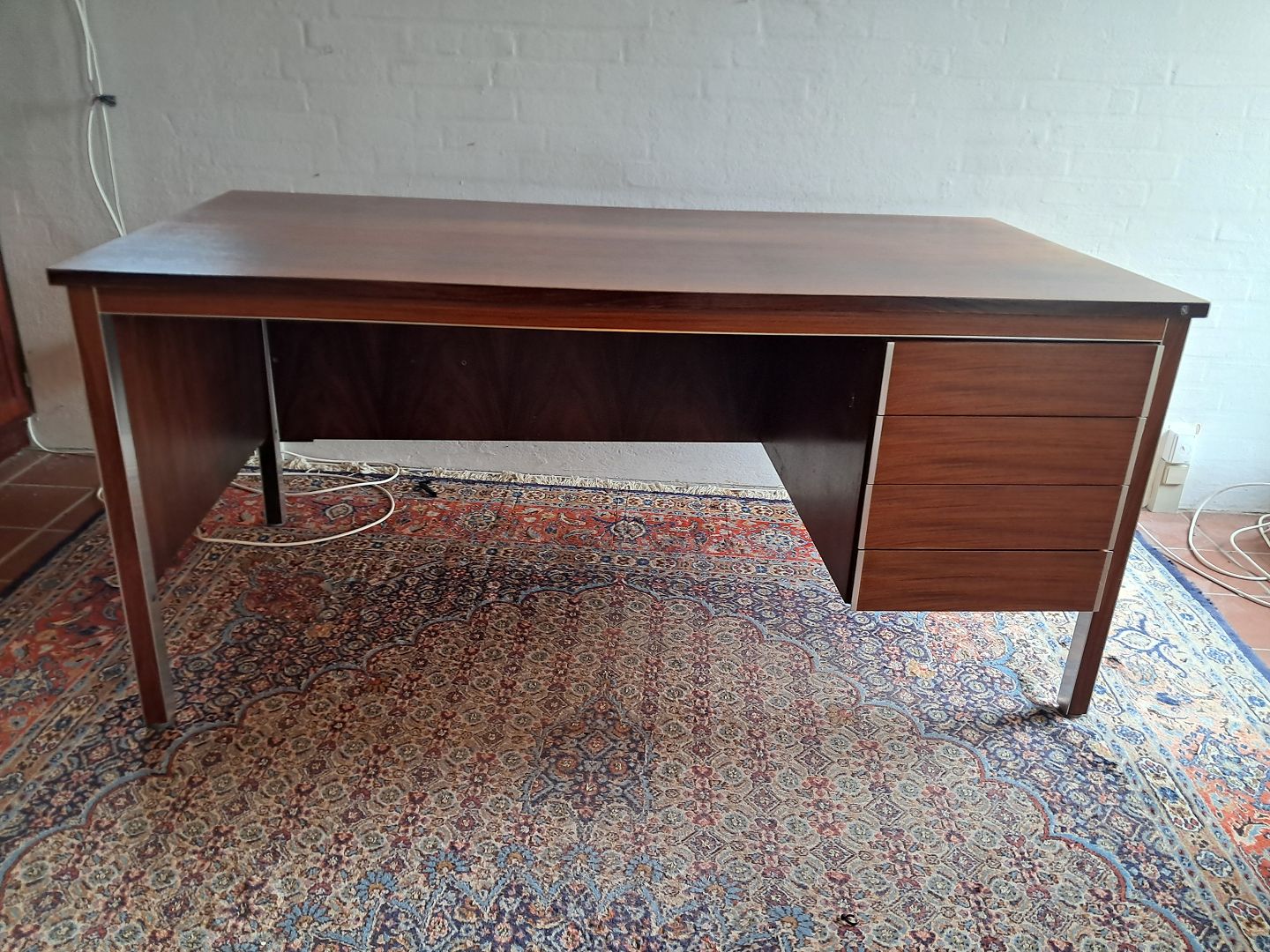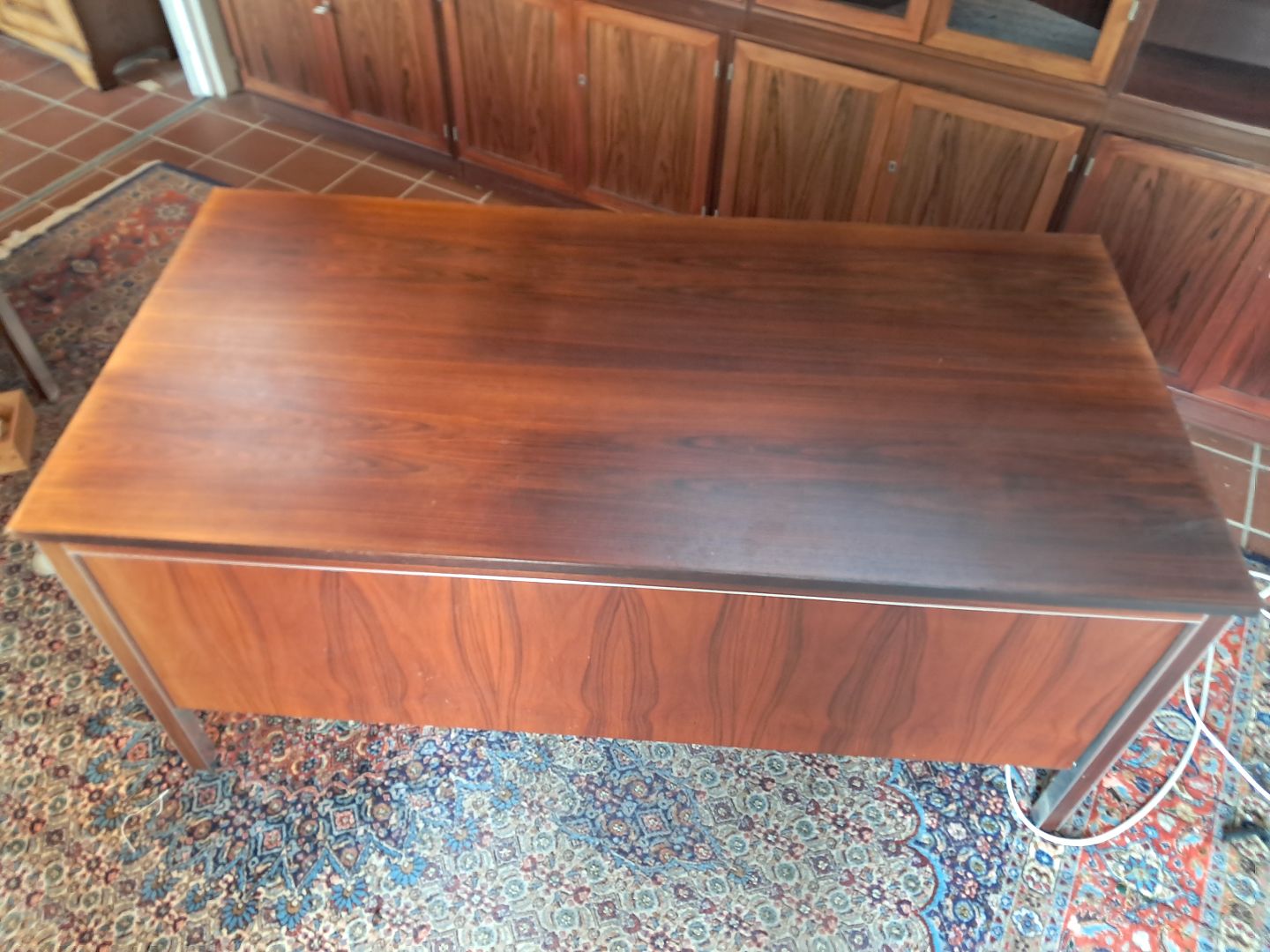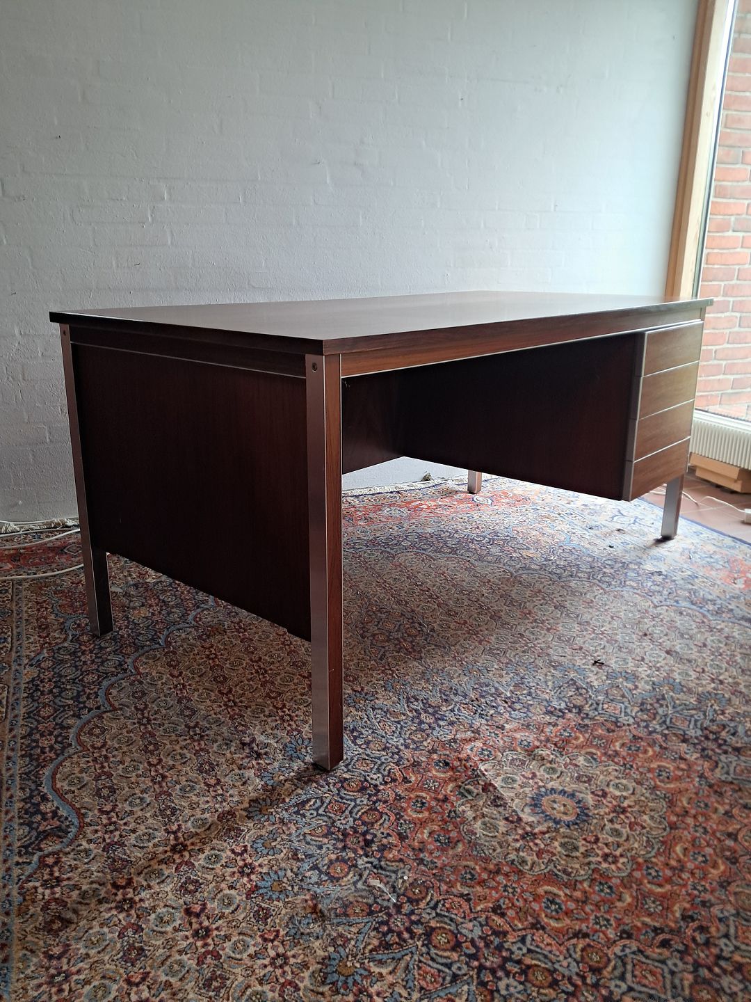 Skrivebord i fineret palisander og aluminium, fra 1970erne. Det har brugsspor og mangler en skue på bagstykket.(se foto) Højde 73cm Bredde 158cm Dybde 79cm Emne nummer: 77085