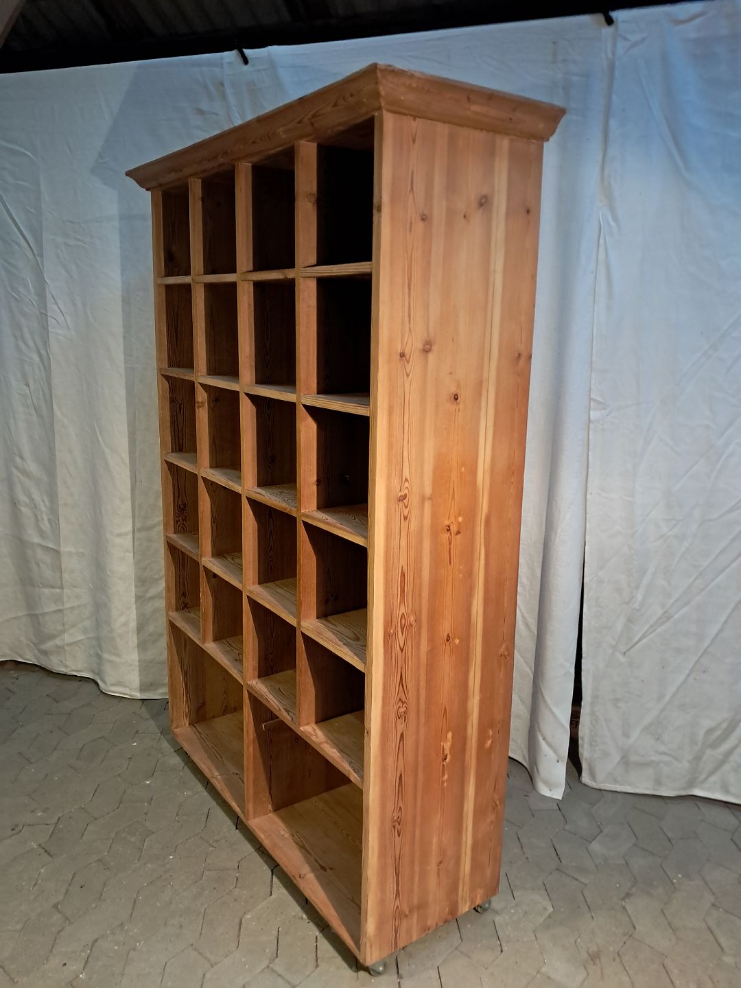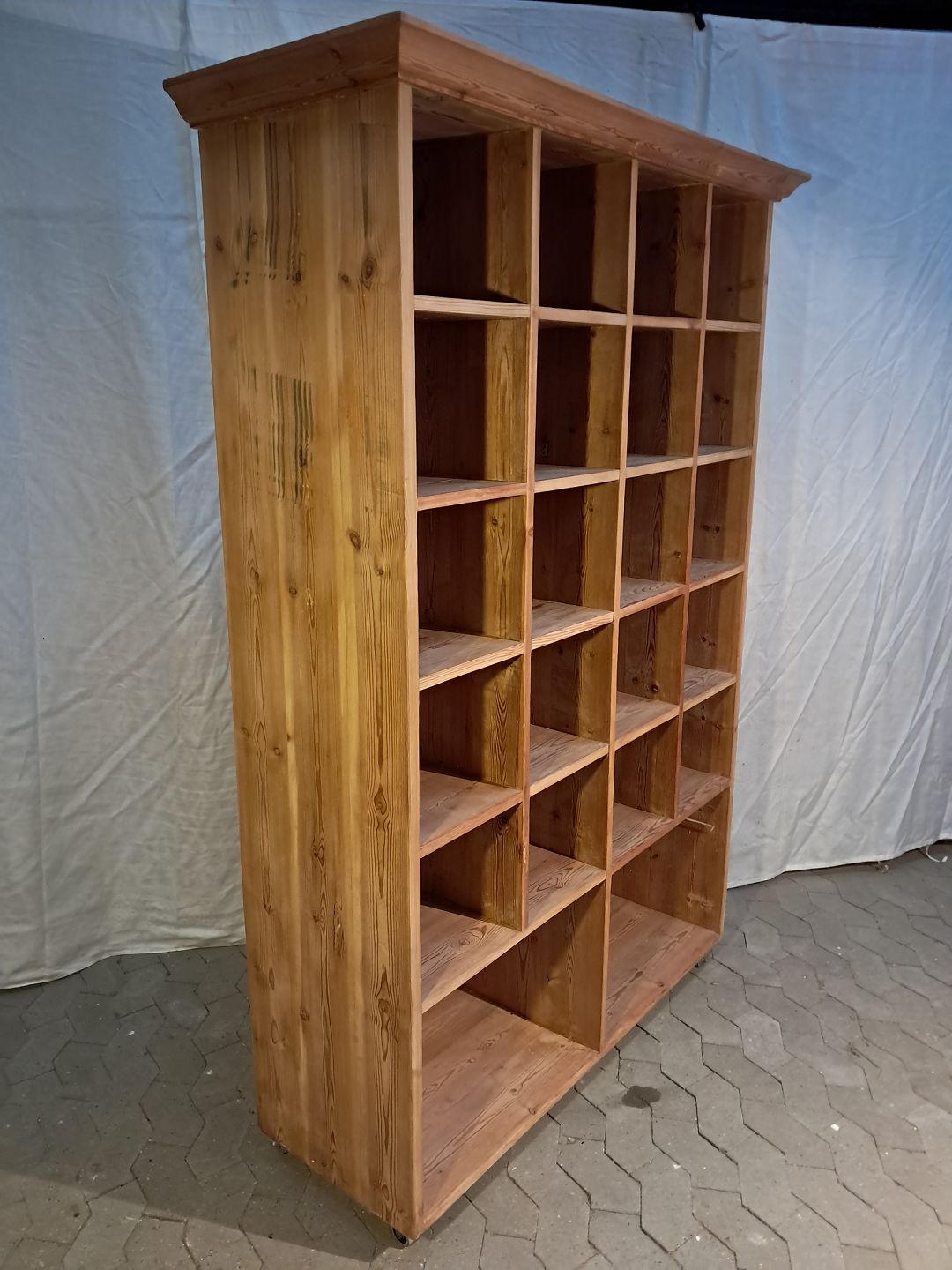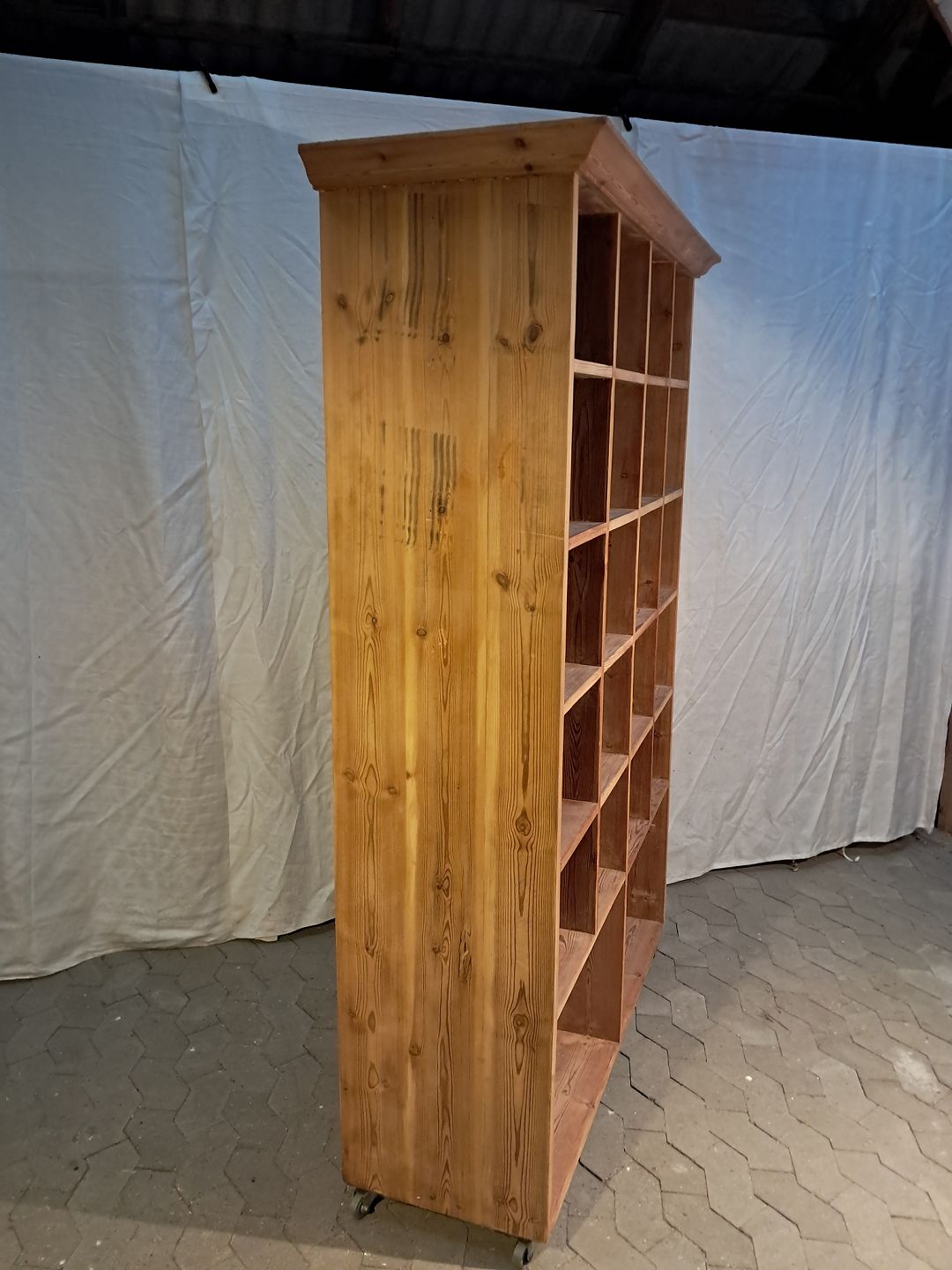 Reol i massivt fyrretræ, fra 1930erne. Den har brugsspor. Højde 198cm Bredde 137cm Dybde 49cm Hylderum : Højde 26cm Bredde 28cm Nederste hylderum : Højde 42cm Bredde 58cmse Se emne nr.91898 Emne nummer: 91897