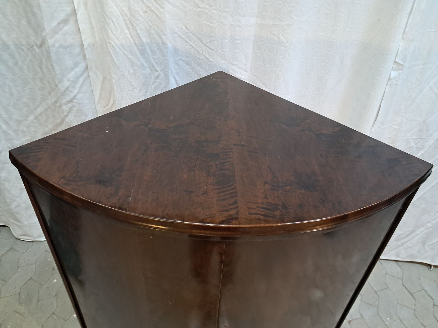 Hjørneskab i fineret birketræ, fra 1950erne. Det har brugsspor. Højde 136cm Bredde 90cm Dybder 63cm Emne nummer: 91915
