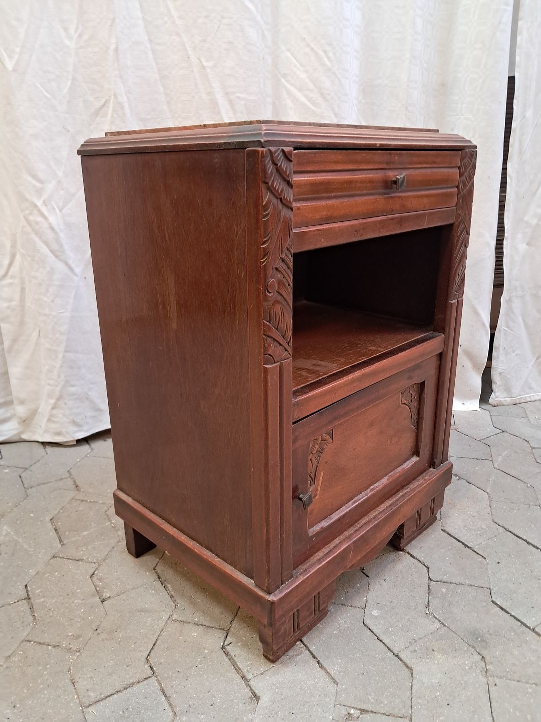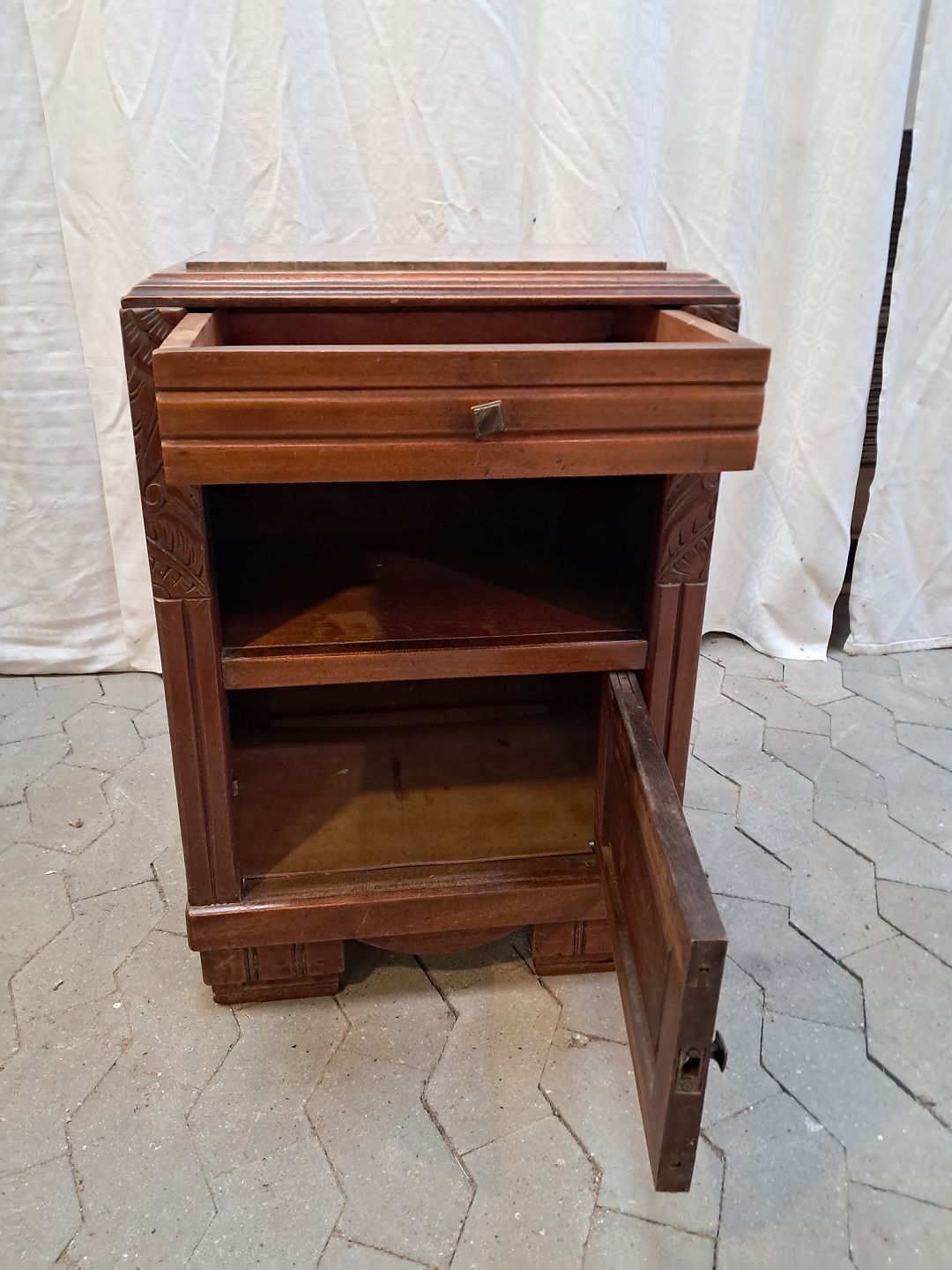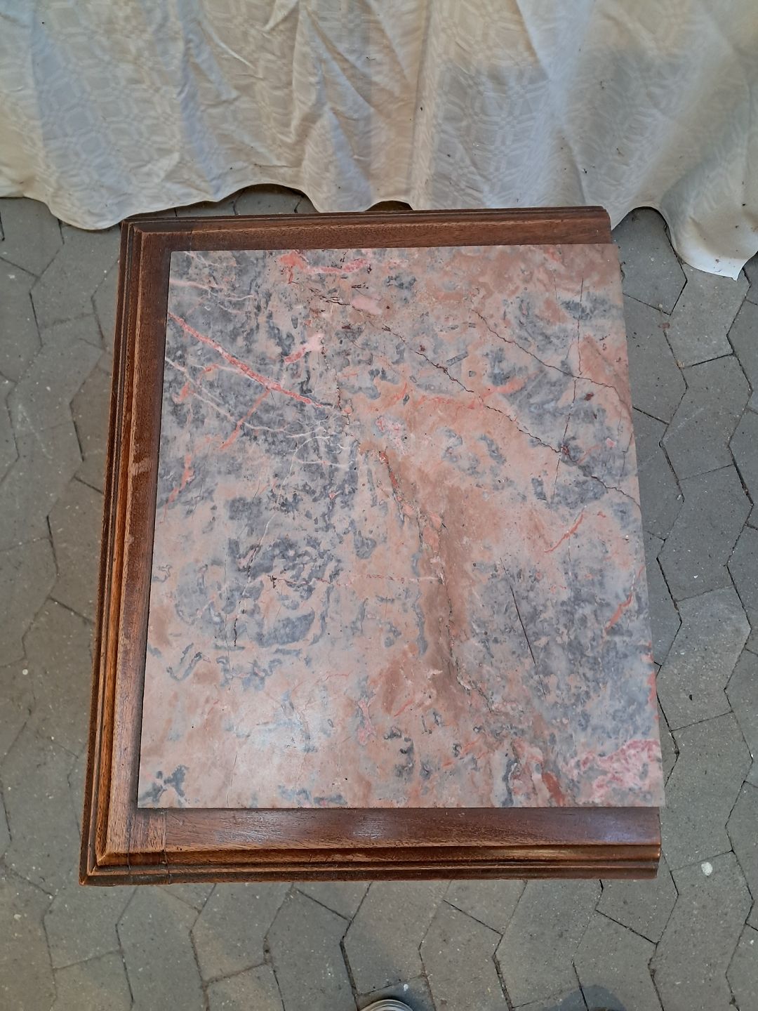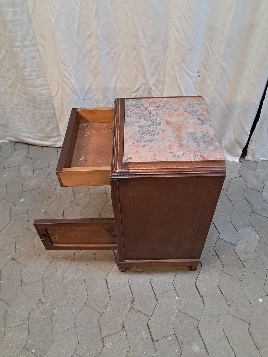 Lille skab i mahogni med marmorplade, fra 1910erne. Det har brugsspor. Højde 70cm Bredde 47cm Dybde 37cm Emne nummer: 91938