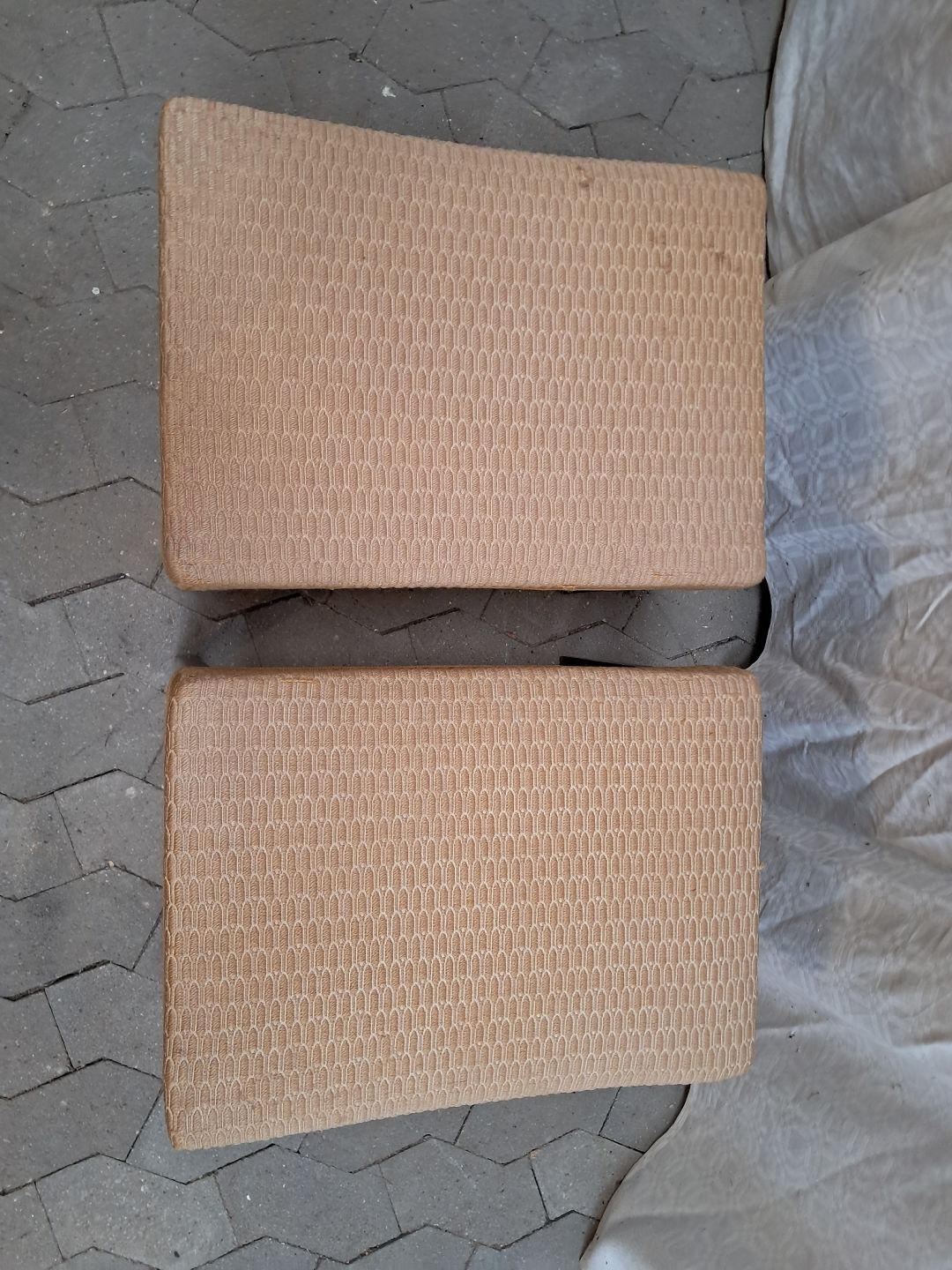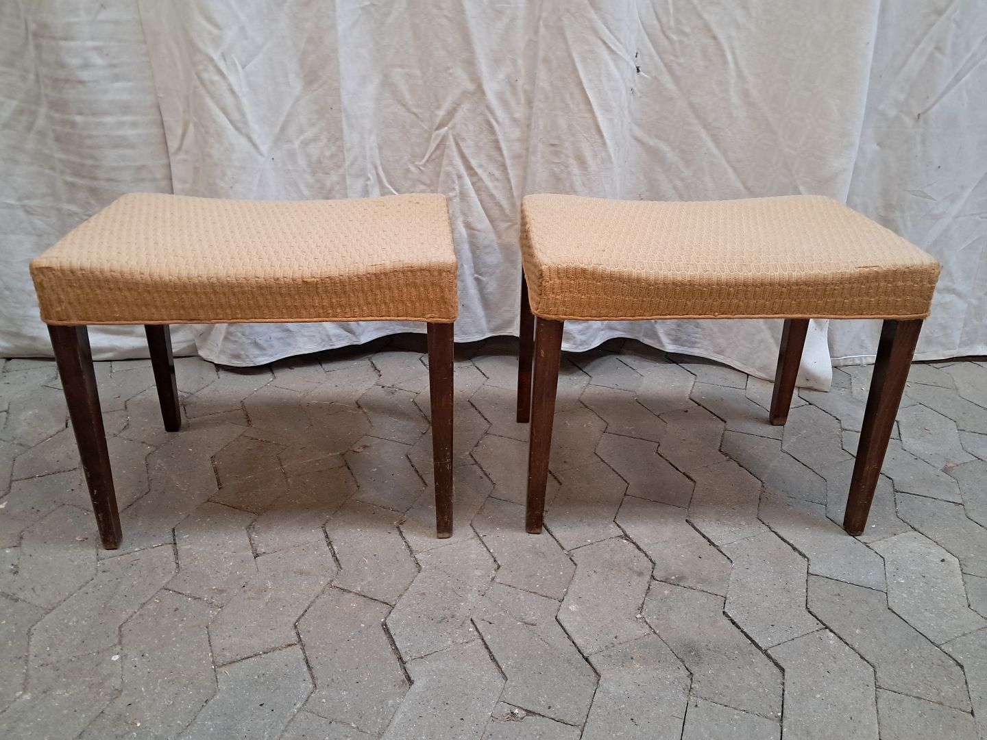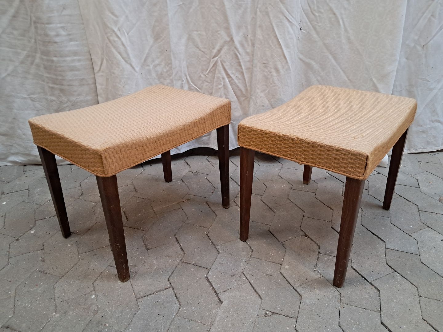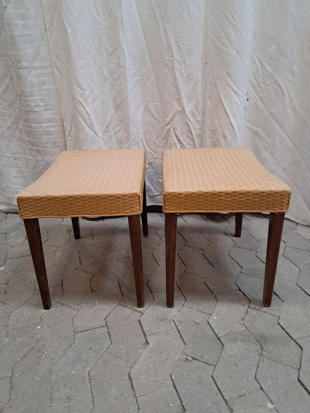 2 Skamler i bøgetræ med stofbetræk, fra 1950erne. De har brugsspor. Højde cm Bredde cm Dybde cm Emne nummer: 91958