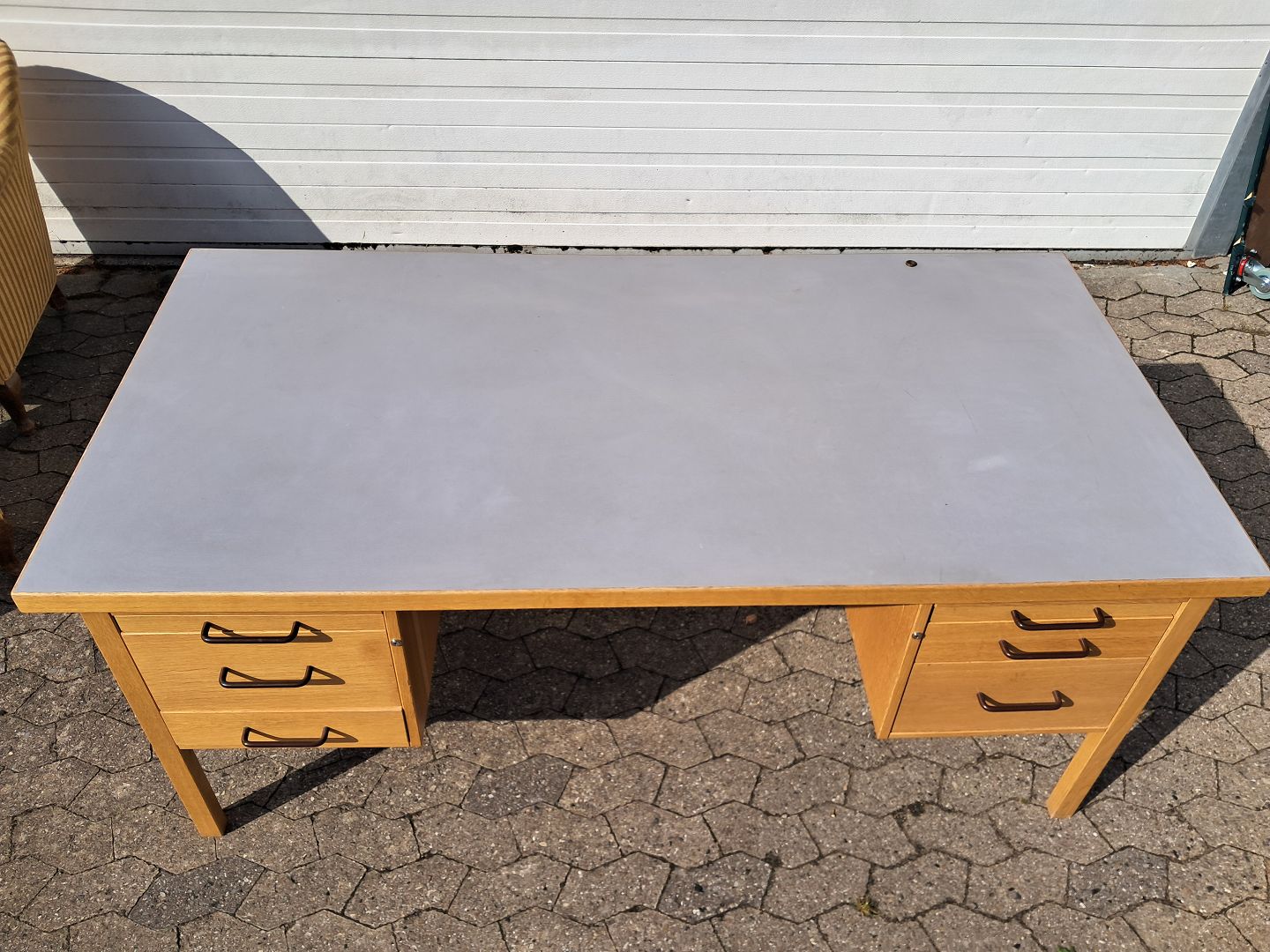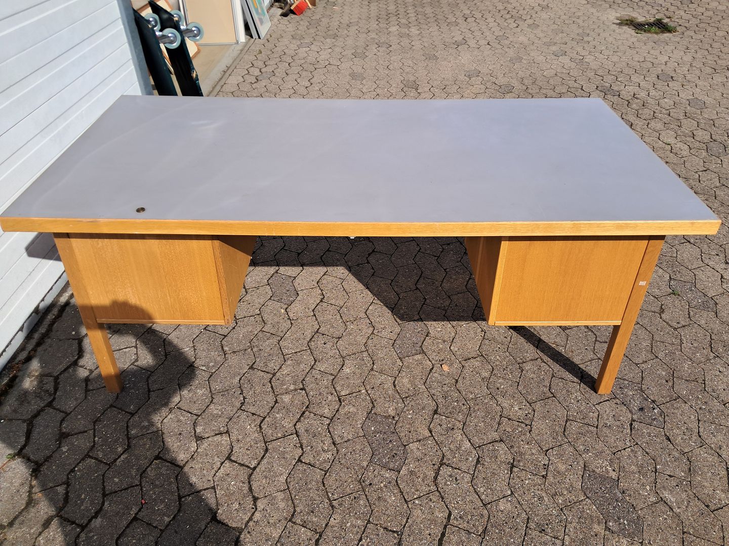 Skrivebord i egetræ med linoleumsplade, fra 1980erne. Det har brugsspor. Højde 72cm Bredde 180cm Dybde 90cm Højde fra gulv til underkant. Emne nummer: 77170